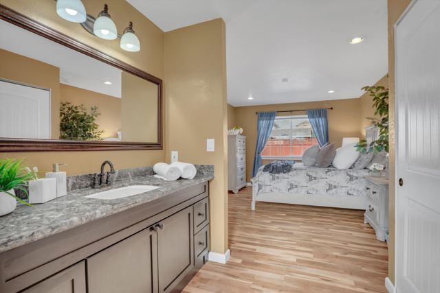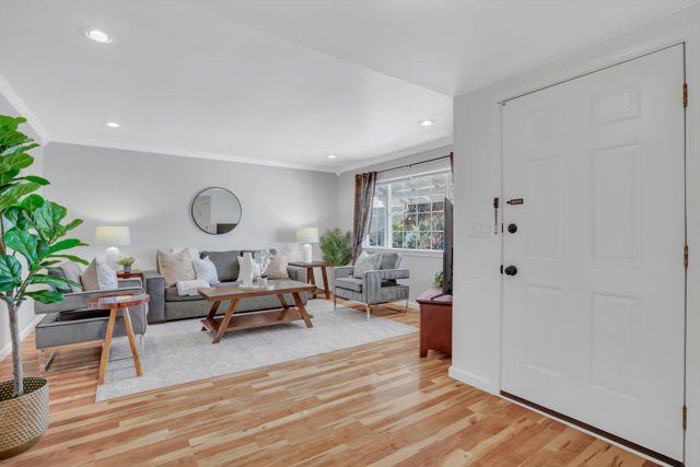 Beautifully maintained single-story home offering comfort, efficiency, and exceptional outdoor living. Charming front porch and picturesque living room window create welcoming curb appeal. Interior features include crown moulding in the living room, recessed lighting and dimmers throughout, solid core paneled doors with aged bronze hardware, and extra insulation for added energy efficiency. The cozy family room features a fireplace with custom built-in shelving and a sliding door with built-in blinds, perfect for relaxing or entertaining. The kitchen is equipped with quartz countertops and maple cabinetry. The primary bedroom offers an ensuite bathroom. Step outside to an expansive, low-maintenance backyard showcasing mature orange, lemon, avocado, pomegranate, honey plum, and peach trees, along with three raised garden beds. A versatile shed with electrical, insulation, and windows offers excellent flex space for a home office, studio, or hobby room, plus an additional storage shed. Sheet-rocked andi nsulated garage with attic storage access. Room for RV or boat parking along the side yard.
