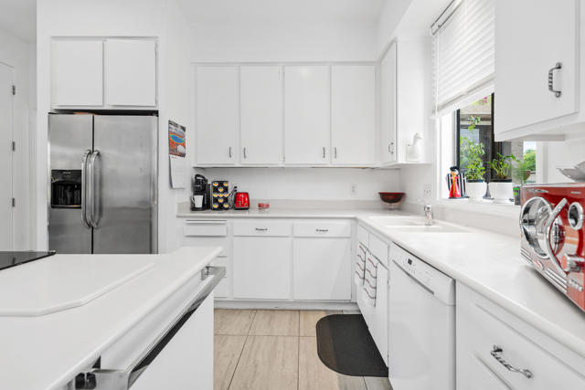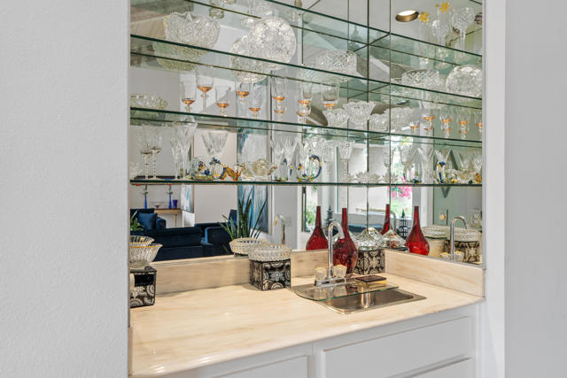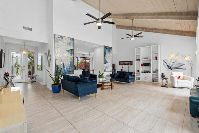 Discover resort-style living in this beautifully updated residence located within the prestigious Mission Hills Country Club in Rancho Mirage. This model has been reconfigured with an open floor plan. Featuring exposed-beam vaulted ceilings and tile flooring that is consistent from the front patio, rear patio and the interior. A bright, airy atmosphere with effortless sophistication. Perfect for entertaining, the spacious living area includes a convenient wet bar and expansive sliders that open to both front and rear patios, creating seamless indoor-outdoor flow. Enjoy unobstructed views of the San Jacinto mountains from the front patio, and tranquil lakefront views from the rear patio, an everyday backdrop that feels like a getaway. Additional highlights include cable & internet service, an oversized 2-car garage and storage room, golf cart stall, a newer AC system for year-round comfort and access to an exclusive community featuring 7 sparkling pools and spas for relaxation and recreation. Ideally situated close to shopping, dining, and outdoor activities, this home delivers luxury, comfort, and convenience in one exceptional package.