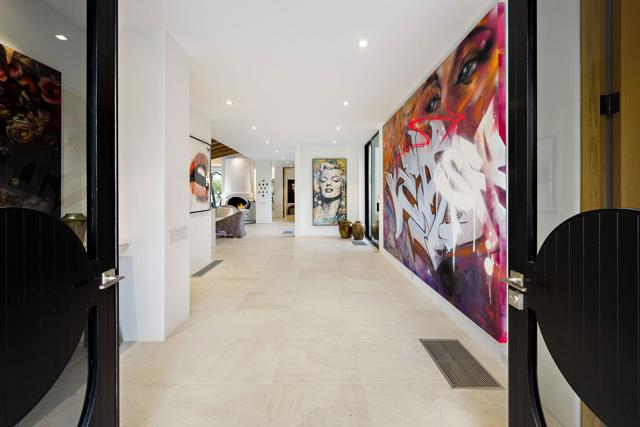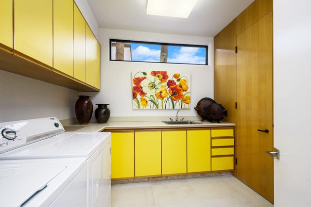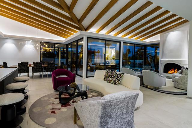 An Artful Desert Residence - Rooted in the spirit of the desert and elevated with a distinctly modern sensibility, this approximately 4907 square foot residence is a masterful study in light, volume, and design. From the moment you arrive, dramatic double wood-framed glass entry doors set the tone, opening into a luminous interior defined by soaring beam ceilings, walls of glass, and clerestory windows that draw the outdoors in.The open great room and dining space unfold with quiet confidence--anchored by a fireplace, softened by ambient accent lighting. Exposed wood beams create warmth and continuity, while the home's thoughtful layout allows spaces to flow effortlessly, equally suited to intimate living and refined entertaining.The Main Bedroom suite is a private one, styled with art-deco inspiration and opening directly to the poolside patio for seamless indoor-outdoor living. A separate guest wing offers three en-suite bedrooms, each with its own patio access, providing privacy and comfort for visitors while maintaining a strong connection to the landscape.A generous office or studio space supports modern living, complemented by abundant interior storage and a three-car attached garage. The home reflects a rare level of pride of ownership and a design that feels both intentional and enduring.Distinctive, well-proportioned, and beautifully appointed, this is a residence that balances architectural presence with livability--an elegant desert home designed to be experienced, not merely admired.The property is being offered ''unfurnished;'' some furnishings, art, and decorations may be available.
