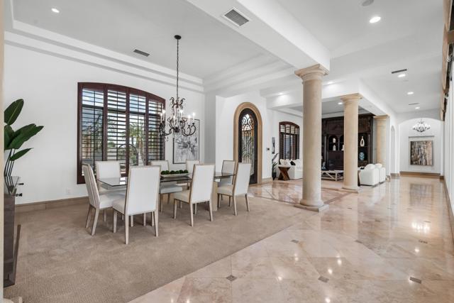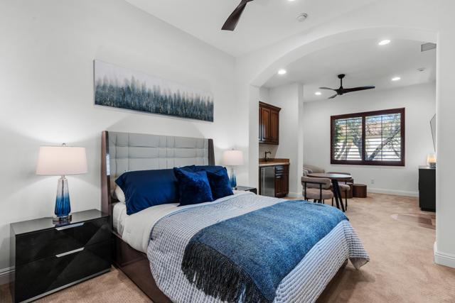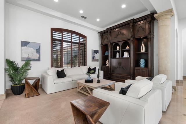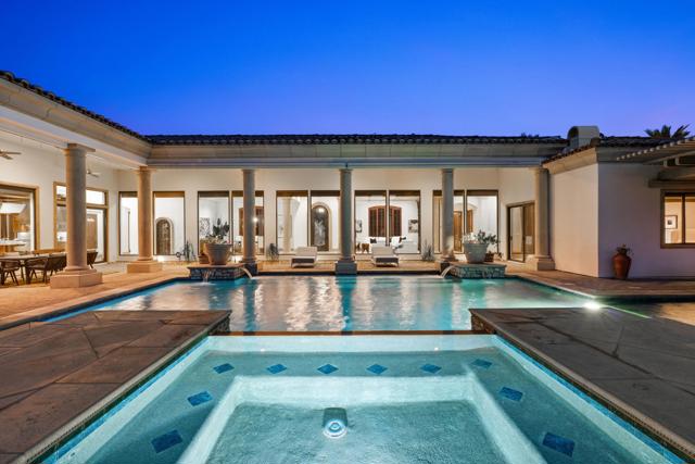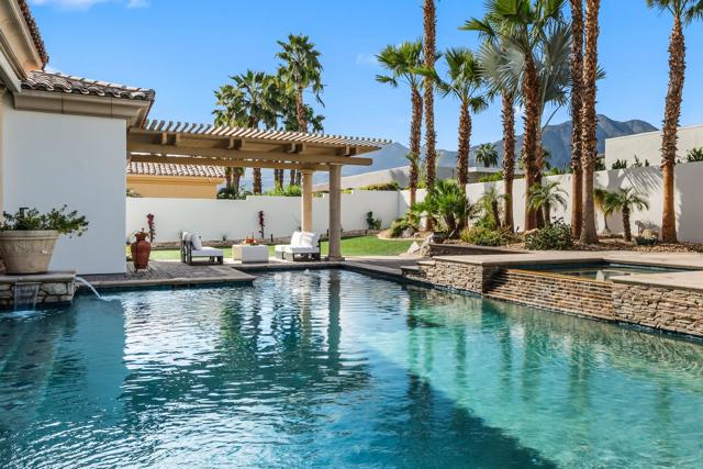 Newly refreshed, this contemporary mediterranean residence is gracefully situated on over half an acre within the exclusive gated custom home enclave of Lions Gate Estates in La Quinta. A recent outdoor transformation introduces a soft white exterior palette, desert contemporary landscaping, and artful exterior lighting, elevating the home's architectural presence while framing panoramic mountain views and creating a resort caliber setting from sun-filled afternoons to evenings under the stars. Interiors reflect scale and refinement, with custom built-ins throughout, a formal living and dining room, and an inviting great room featuring a fireplace and wet bar, perfect for hosting with ease. A temperature controlled wine cellar and chef's kitchen with granite slab countertops, premium appliances, and generous gathering space further underscore the home's entertaining appeal. Designed to balance architectural elegance with everyday livability, the home unfolds across four-bedroom suites and four-and-a-half baths, including a private detached casita ideal for guests. The primary suite is a private sanctuary, complete with its own fireplace, dual walk-in closets, a soaking tub, and an adjoining exercise room. At the heart of the property, a Pebble Tec saltwater pool and spa, enhanced by an outdoor misting system, anchor the grounds and sets the tone for relaxed desert living. Covered patios, an outdoor fireplace, built-in BBQ, automated awnings, and thoughtfully curated lighting complete the elevated outdoor atmosphere. Additional amenities include a sauna and an air-conditioned three-car garage. Offered furnished per inventory. This estate presents a rare opportunity to experience desert living at its finest.