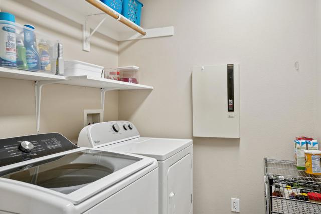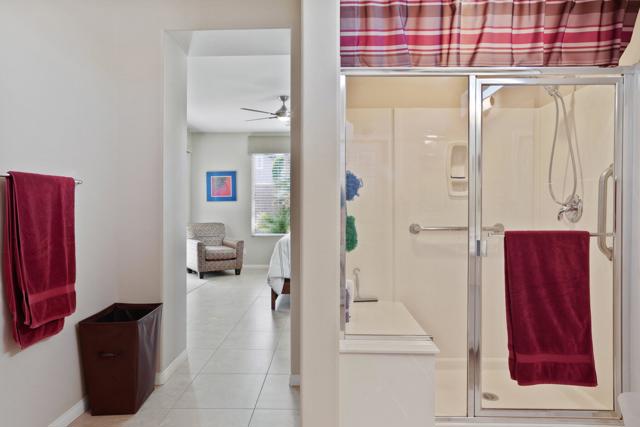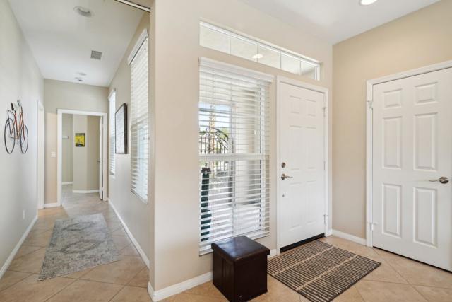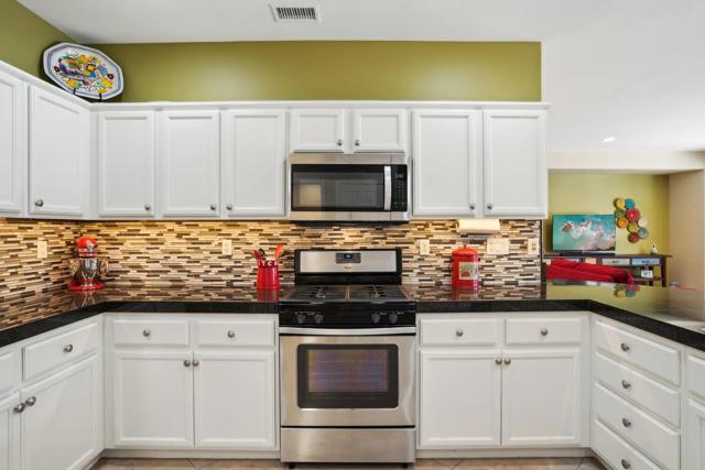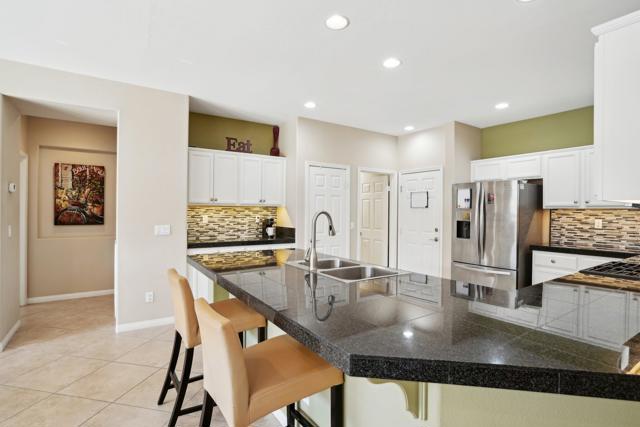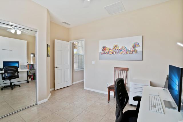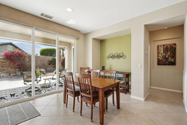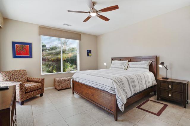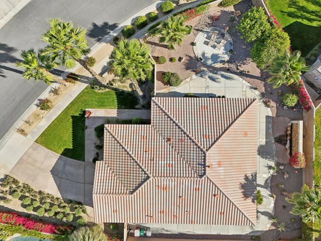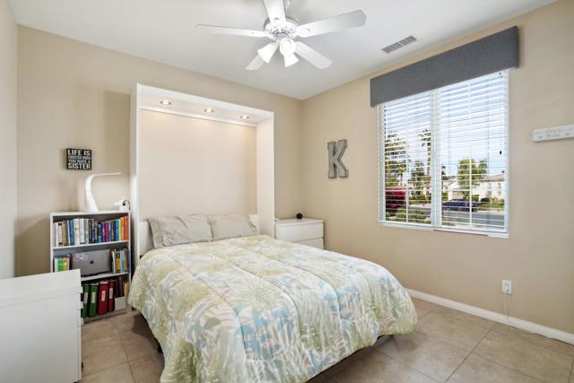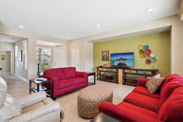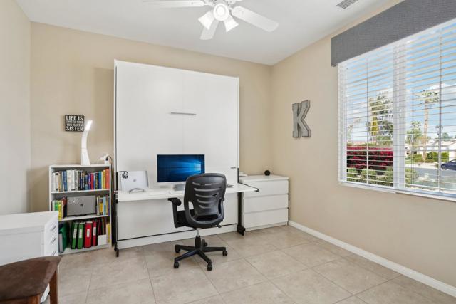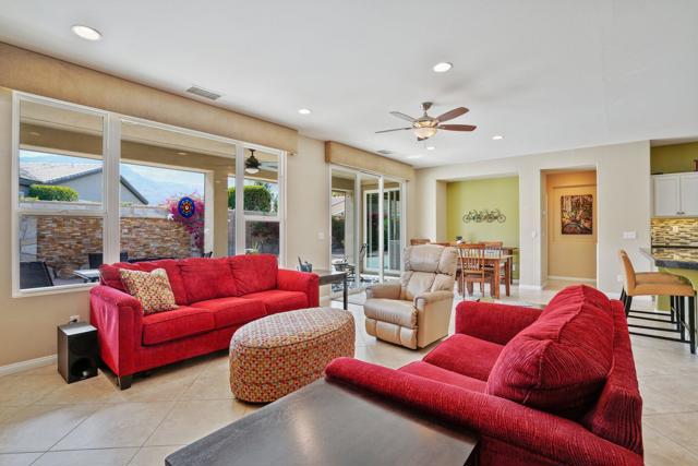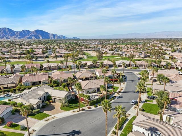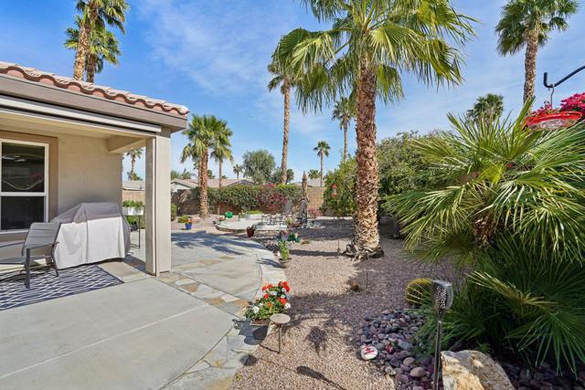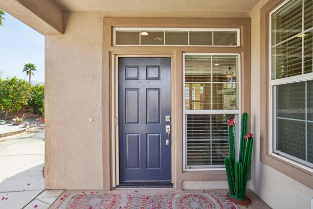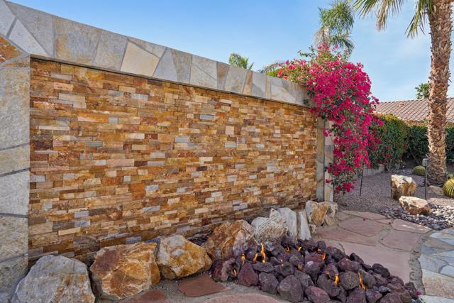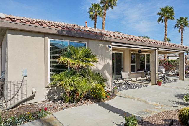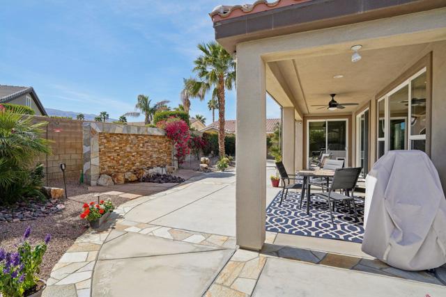 Presenting a stunning Oasis plan with sweeping southern mountain views, located in the highly desirable 55+ resort community of Trilogy La Quinta. Situated on an expansive and meticulously upgraded 10,454 sq. ft. lot, this thoughtfully designed 2-bedroom, 2-bath residence offers 1,551 sq. ft. of comfortable interior living. A charming wrought iron gate welcomes you into a covered entryway that opens to a spacious great room featuring a custom entertainment niche, elegant window treatments, and an adjacent dining area with recessed hutch space. The chef's kitchen embraces open concept living and showcases granite countertops, stainless steel appliances, a gas range, built-in microwave, breakfast bar seating, custom tile backsplash, white cabinetry with brushed nickel hardware, under-cabinet lighting, and a pantry. The guest quarters include a full bath with shower-over-tub and a professionally built and installed murphy bed, by Murphy Beds of Palm Desert, with a 12inch queen size mattress. This convenient murphy bed allows the 2nd bedroom to rapidly turn into a den/office. The primary suite offers tile flooring, patio access via a sliding door, and a well-appointed en suite bath with dual vanities, a large walk-in shower, generous cabinetry, and a spacious walk-in closet. Additional features include a separate laundry room and beautifully landscaped backyard with a covered patio and awnings, a circular side-yard retreat, custom concrete with flagstone accents, and a unique stacked-stone waterfall flowing aimlessly behind the lava rock fire feature--perfect for enjoying cool desert evenings. This remarkable home is a must-see--schedule your private showing today.