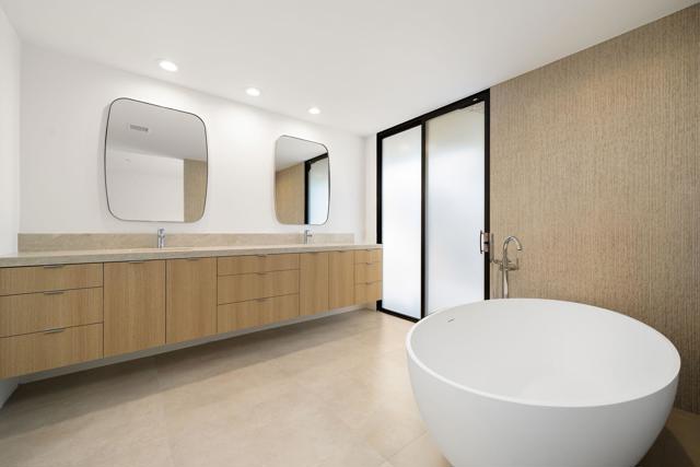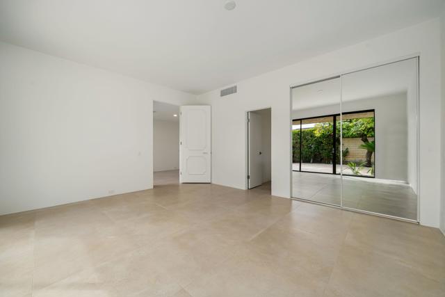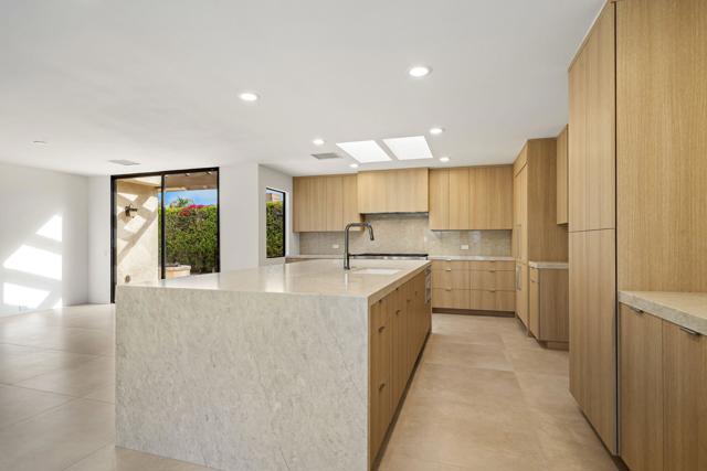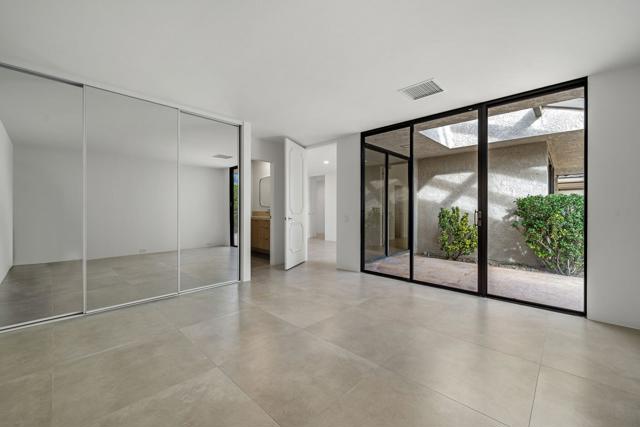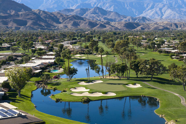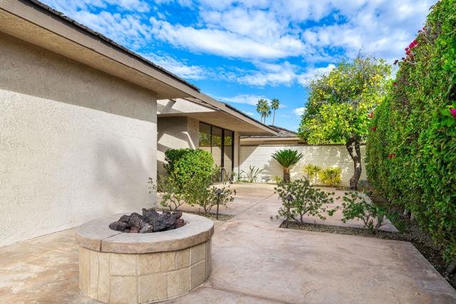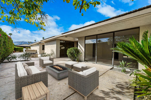 Welcome to this meticulously renovated stunner inside the Iconic Springs Country Club. This 3-bed, 3 1/2 bath home is a highly sought after free-standing St. Andrews model, but with a new powder room off the front entry. Located on a generous sized lot with a very large turn-around driveway, this 2847 sf beauty (appraiser-measured) is the perfect desert retreat for those seeking high-end finishes, soothing desert hues, and a very quiet location. Enter through the double glass custom gates into a large front courtyard adorned with a newly resurfaced sparkling saltwater pool/spa and stunning west views of the snowcapped mountains and swaying palm trees. The large wrap around patio features fragrant foliage, mature citrus trees and succulents, and has plenty of room for entertaining and relaxing with friends and family. Whether you're enjoying stories around the built-in firepit to feasting on your favorite cuisine prepared on the built-in grill & wet bar w/granite countertops, dining alfresco will always be in style! Once inside the double glass entry doors, you're greeted with luxurious finishes, including 32 x 32 porcelain tile flooring throughout. The large great room/dining area, featuring a clean-line fireplace, soaks in an abundance of natural light, and offers fantastic west views of the snow-capped mountains, overlooking the relaxing pool area. Enter a chef's dream kitchen that includes state-of-the-art appliances; a professional Dacor oven/cooktop and Bosch D/W. The center of the kitchen shows off a full-slab quartz island, perfect for those family gatherings in the kitchen. Enjoy double wine refrigerators, custom Dayton-Rift cabinetry and soft-closing drawers, all topped with carmel and ivory quartz slab. The luxurious Primary suite is adorned with natural light and shares captivating views of the San Jacinto mountains. A triple frosted glass door closet and add'l large walk-in closet mean you'll always have room for those last-minute desert shopping sprees. The 5-star Primary bathroom offers a deep solid-surface soaking tub. All three bedrooms are ensuite and feature Brizo shower hardware that truly elevates your bathing experience. Add specialty shower tile surfaces and Taj Mahal quartz countertops & Dayton-Rift cabinetry, and you have a true spa experience. The garage floor has a new epoxy finish and large storage room. A new security system, new water softener system and OWNED solar panels make this home a rarity and MUST SEE!
