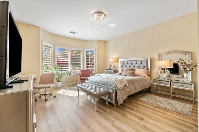 This home is ideally located within the development close to the gate to Stater Bros market and only a few doors down from the neighborhood pool and spa. Beautifully landscaped South facing back yard and peek-a-boo mountain view. Inside are plantation Shutters throughout. Bedrooms have new wood simulated vinal flooring. Newly painted. Kitchen has new sink. New upgraded appliances. 2 car, finished garage. Newer Washer and Dryer.Newer AC 2014.