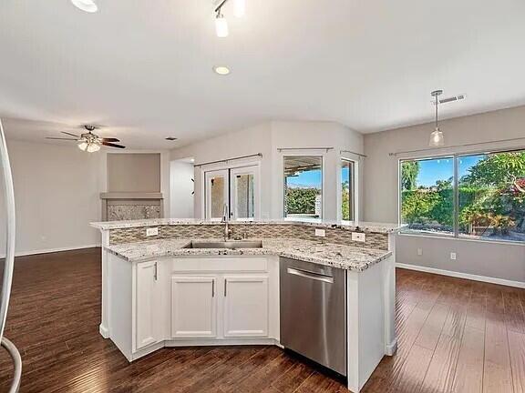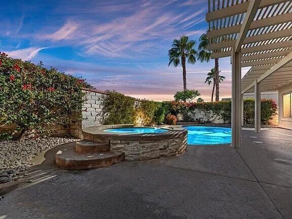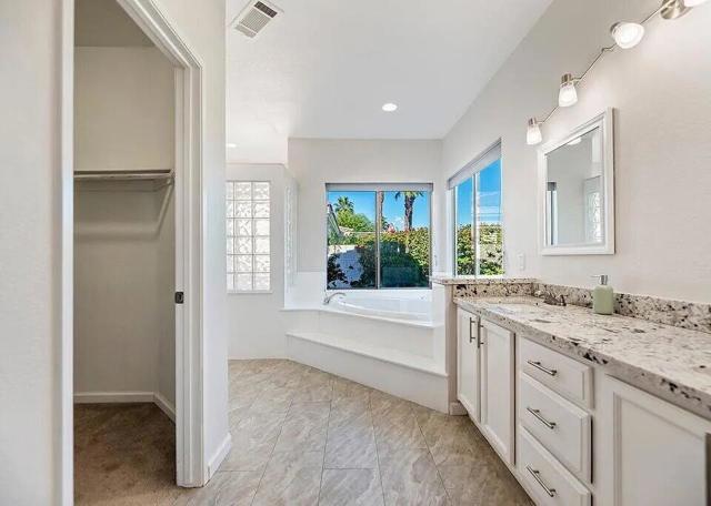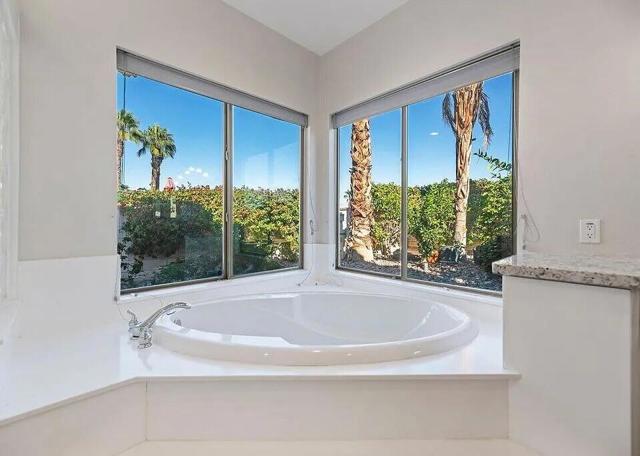 Welcome to your desert oasis in the highly sought after Sonrisa community in La Quinta, where comfort, community, and the best of desert living come together! This beautifully updated 4 bedroom, 3 bath home blends modern comfort with timeless style. Enter through a large foyer to discover an open floor plan with a wall of windows, filling the space with natural light and offering stunning views of the desert landscape. Enjoy wood look flooring, granite slab countertops, and stainless-steel appliances throughout. The open concept kitchen seamlessly connects to the family room and breakfast nook, creating the perfect space for everyday living and entertaining with views of the sparkling pool and spa just beyond. Formal living and dining areas add flexibility and function. The spacious primary suite is a true retreat, featuring a spa like bath with a soaking tub, large walk-in shower, and dual vanities overlooking the lush garden. Three additional bedrooms and two full bathrooms provide ample room for family and guests. The garage is a full three-car garage and the newer A/C ensures you stay cool.Step outside and discover your own private resort-style oasis. The sparkling pool and spa invite you to soak up the desert sun, unwind beneath the stars, or enjoy peaceful mornings outdoors.Centrally located near top rated schools, shopping, and dining, minutes to the Tennis Garden in the lower cost IID Power District and CV Water District this home is perfect for year-round enjoyment whether you're entertaining guests or savoring quiet moments at home.