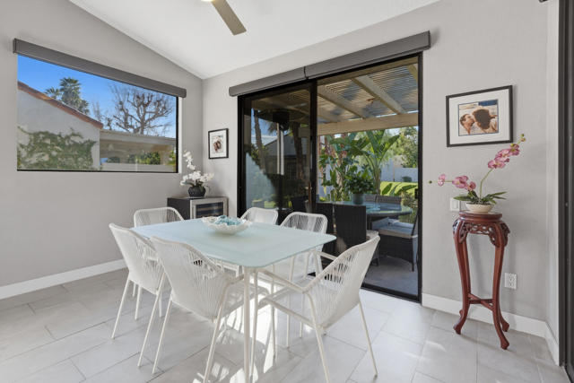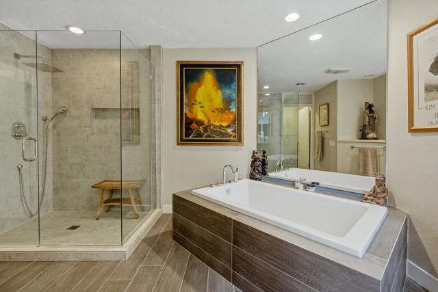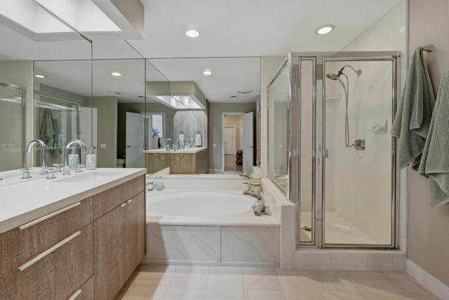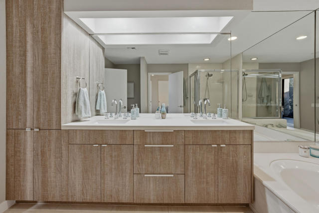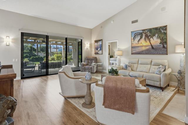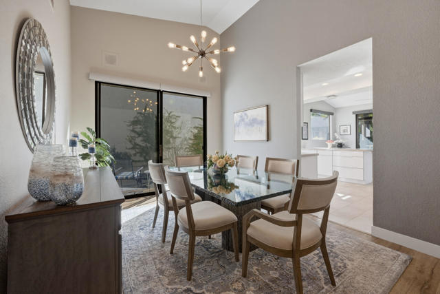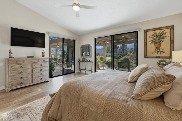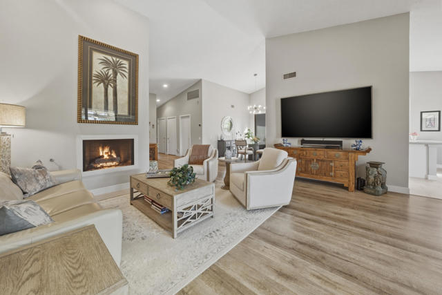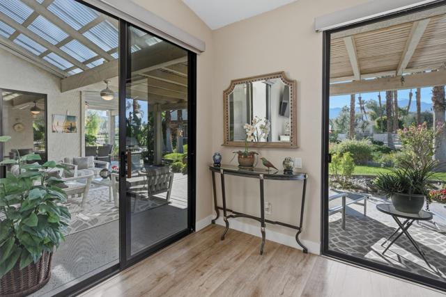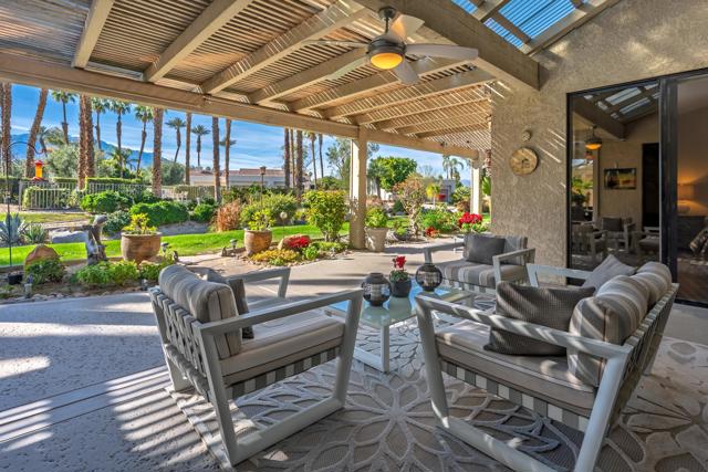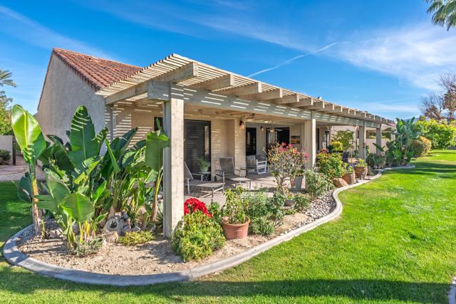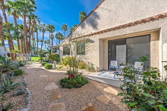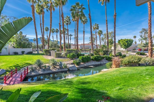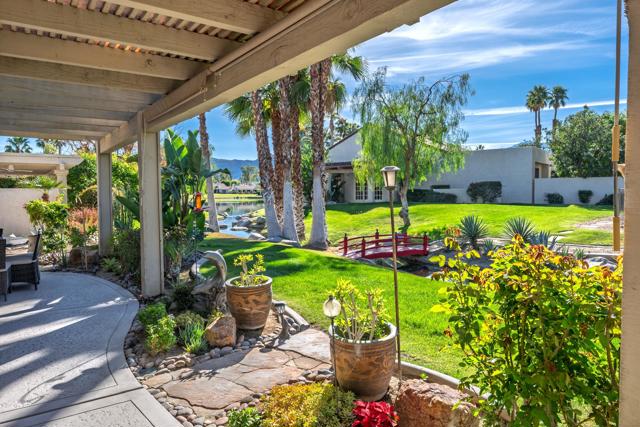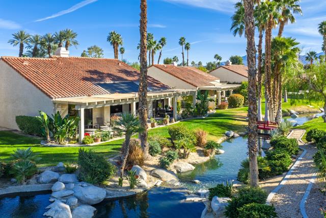 Set behind the gates of Mission Hills Country Club, this beautifully remodeled, detached residence offers an exceptional blend of privacy, elegance and breathtaking natural surroundings. Positioned in a premier west-facing location, the home showcases sweeping views of the San Jacinto Mountains and a cascading waterfall which flows gracefully into the water, creating a peaceful, resort-style ambiance that defines this extraordinary setting. Inside, the home has been thoughtfully reimagined with modern finishes and a cohesive, high-end design throughout. The fully updated kitchen is both sophisticated and highly functional, featuring custom cabinetry with soft-close drawers, convenient Lazy Susan and pull-out drawer for pots and pans, solid quartz countertops, glass tile backsplash and stainless steel appliances. Every detail was carefully selected to blend modern luxury with everyday practicality including custom motorized remote shades on all windows. High-end chrome hardware --from door handles to upgraded hinges - adds a sleek, polished touch throughout the home, while a newer HVAC system ensures comfort in every season. The bedroom accommodations are equally impressive. Three oversized bedroom suites each feature their own beautifully updated bathrooms with custom cabinetry, abundant storage, quartz countertops, double vanities, separate bath tub and shower stalls all offering comfort and privacy for family and guests alike. The primary suite is truly a retreat - generously sized and filled with natural light, with beautiful views of the mountains just outside. The redesigned primary bathroom has been fully updated with elevated finishes creating a luxurious, spa-inspired space to unwind and includes an oversized walk-in closet. Multiple outdoor living areas provide the perfect backdrop for entertaining or relaxing - from al fresco dining to quiet mornings by the water. The west-facing orientation ensures unforgettable sunset views night after night, enhancing the serenity of this private location. Completing the property is a huge two-car garage plus dedicated golf cart garage, ideal for enjoying the renowned lifestyle and amenities of Mission Hills. An extended land lease through 2121 - at a significantly lower rate than most within the community - adds exceptional long-term value. Private, polished, and perfectly positioned on the water, this is desert luxury living at its finest.