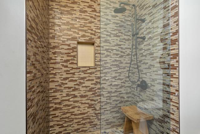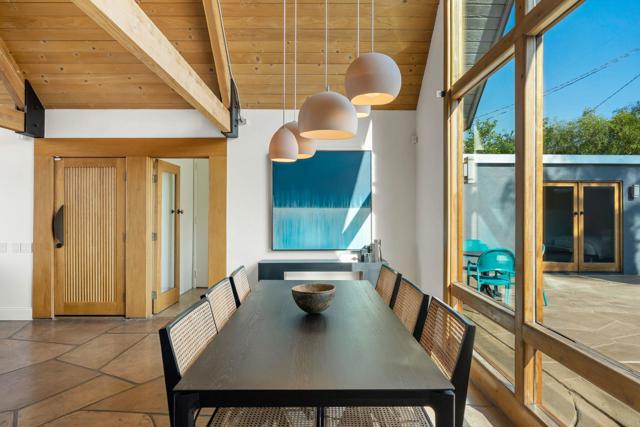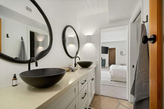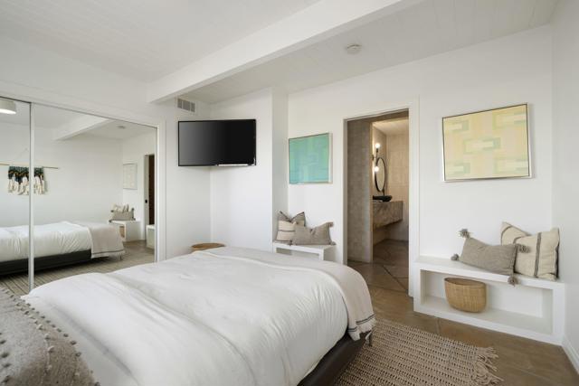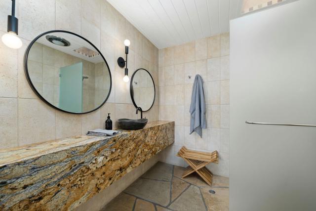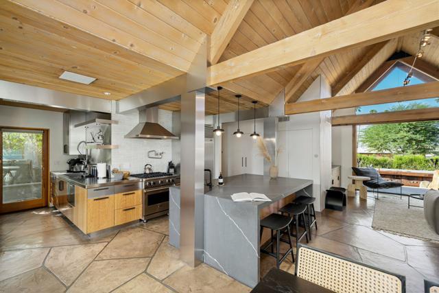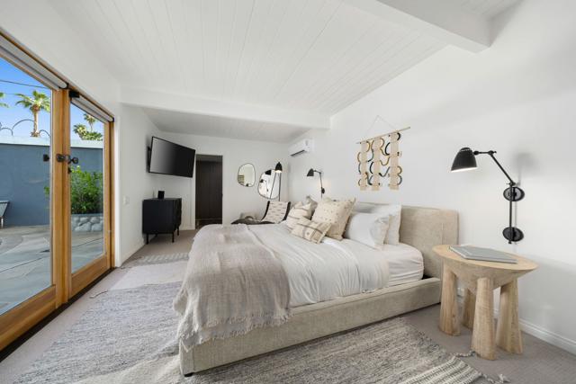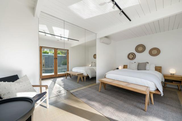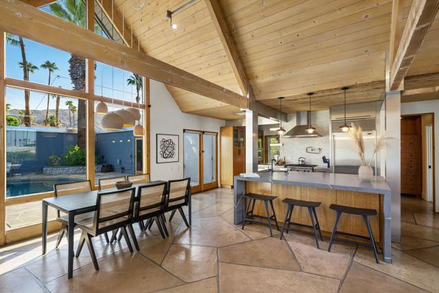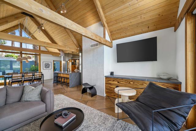 Experience one of the desert's rarest architectural gems! This striking modern A-Frame retreat blends iconic design with cutting-edge sustainability. Featuring 2 bedrooms plus an attached casita, the home showcases dramatic wood beam ceilings, floor-to-ceiling glass, and an airy open-concept layout that frames breathtaking mountain views from both north and south exposures. The gourmet kitchen is equipped with premium appliances, making it both functional and stunning.Outdoors, the property is designed for unforgettable entertaining and total privacy. The pool and lounge area serve as the centerpiece, complemented by a private sunken gathering space behind the gated drive, complete with tiki torches and a sculptural Corten steel gas fireplace. A newly added wooden spa on the front patio creates an additional sanctuary for relaxation under the desert sky.This residence is not just visually extraordinary, it's also an advanced Net-Zero home with owned solar panels, a large backup battery system, EV charger, and energy-efficient heat pumps that both heat and chill the saltwater pool. With negative electricity usage and a whole-home water filtration system it delivers luxury with sustainability and healthy living at its core.Located within walking distance to premier dining, shopping, and everyday conveniences, this furnished architectural showpiece offers a rare opportunity to own one of the area's few true A-Frame homes. An inspired blend of design, innovation, and lifestyle.