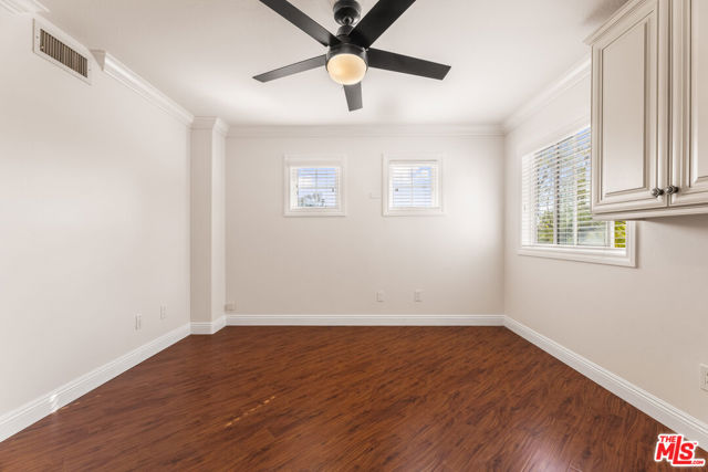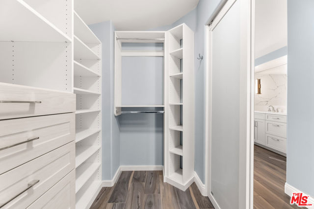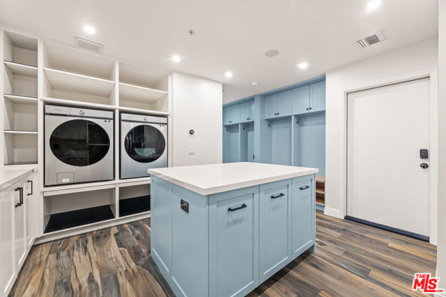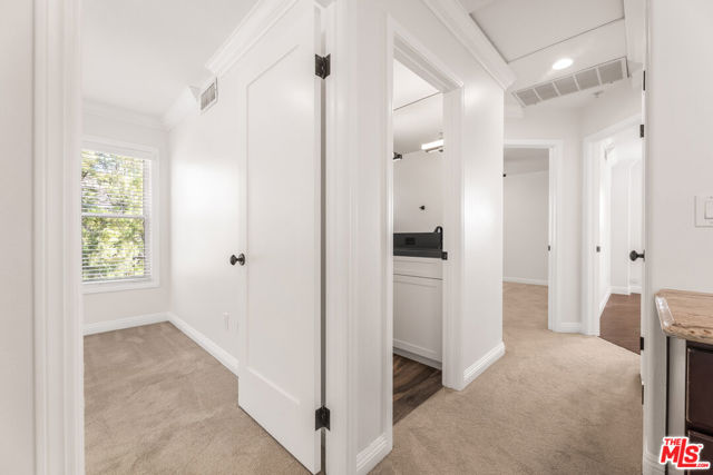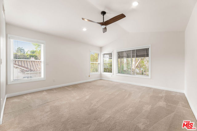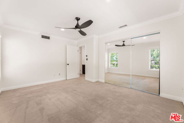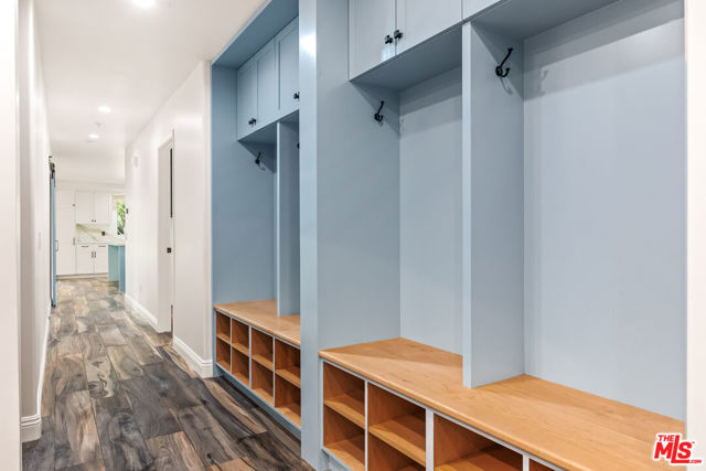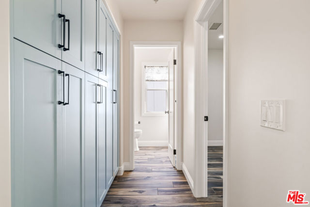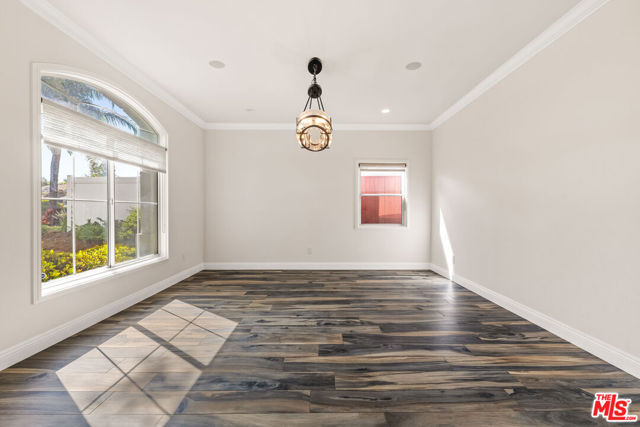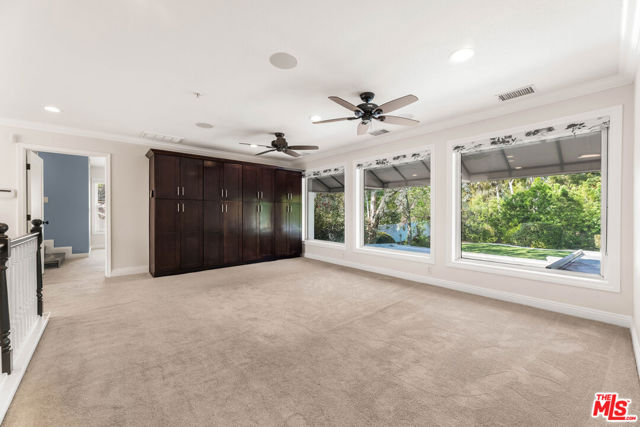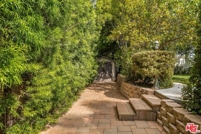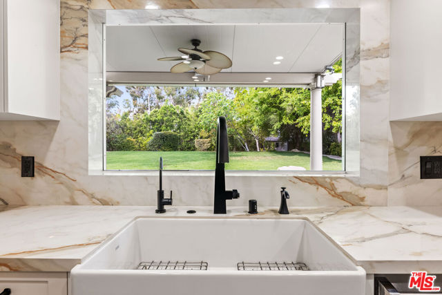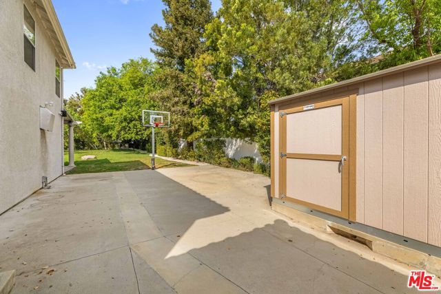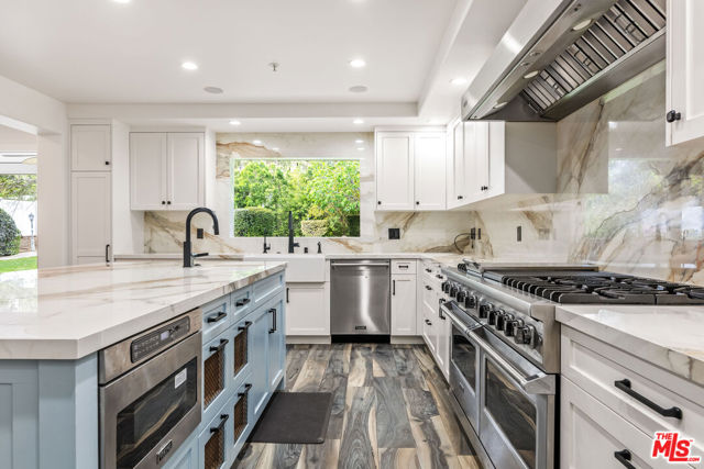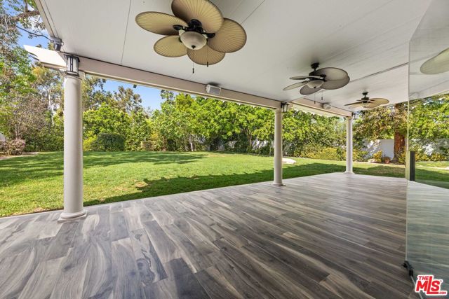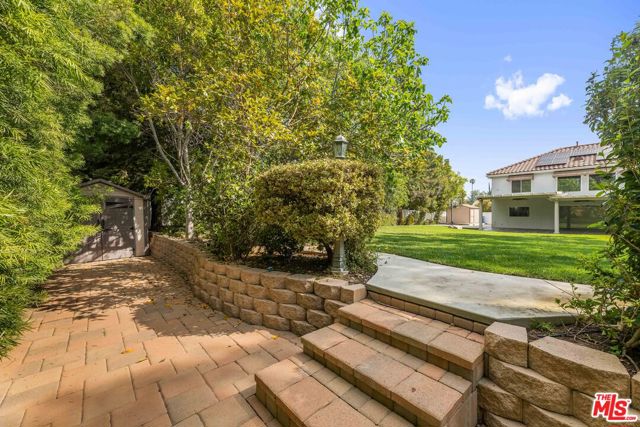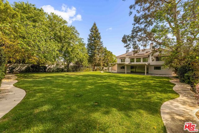 Set behind the gates of prestigious Penfield Estates, this designer-reimagined residence rests on an expansive 19,000+ sq ft flat lot, offering exceptional privacy and refined California indoor-outdoor living. A grand two-story entry welcomes you into elegant formal living and dining rooms, with a bedroom on the main floor, two bathrooms, one being an ensuite, and an office. The upgraded home boasts porcelain wide-plank wood-style flooring that flows throughout, creating a warm yet sophisticated ambiance. The chef's kitchen is a showpiece, featuring custom cabinetry, solid wood shelving, Viking appliances with a 10-burner range, Sub-Zero refrigerator, porcelain countertops, two sinks with disposals, a water filtration system, rebuilt walk-in pantry, and soft-close drawers and cabinets. The kitchen opens seamlessly to an expansive great room with walls of glass overlooking the resort-style, park-like grounds ideal for both entertaining and everyday living. Designed with both comfort and efficiency in mind, the home is equipped with energy-efficient solar panels, reducing utility costs and supporting sustainable living. The lush backyard is highlighted by Meyer lemon, tangerine, Kumquat, and fig trees, creating a serene and private retreat. Should you desire an ADU, this spacious backyard can provide flexible options for extended family guests or rental income. This beautifully customized laundry and mudroom includes an elevated washer and dryer, an additional refrigerator, and abundant storage. The three-car garage is finished with epoxy-coated flooring. The upper level hosts a luxurious primary suite with spa-inspired bath and dual walk-in closets, along with a versatile bonus room perfect for a home office, media lounge, or guest retreat. Three additional bedrooms and a remodeled bathroom with his-and-hers sinks are privately situated in the opposite wing. Additional highlights include Sonos smart-home surround sound throughout the interior and backyard, custom built-ins for concealed storage, and thoughtful upgrades throughout. A rare turnkey opportunity blending style, comfort, efficiency, and privacy. Welcome to elevated living in Woodland Hills.