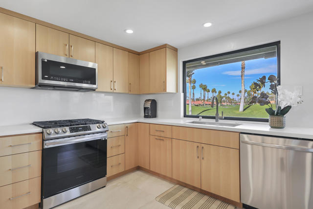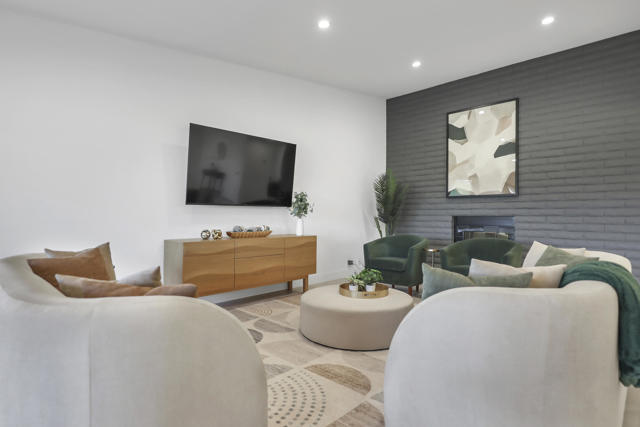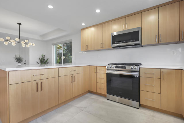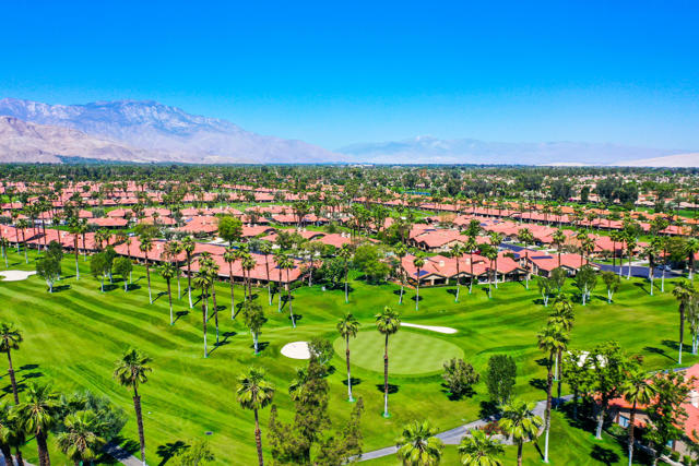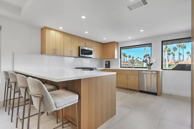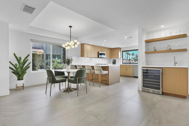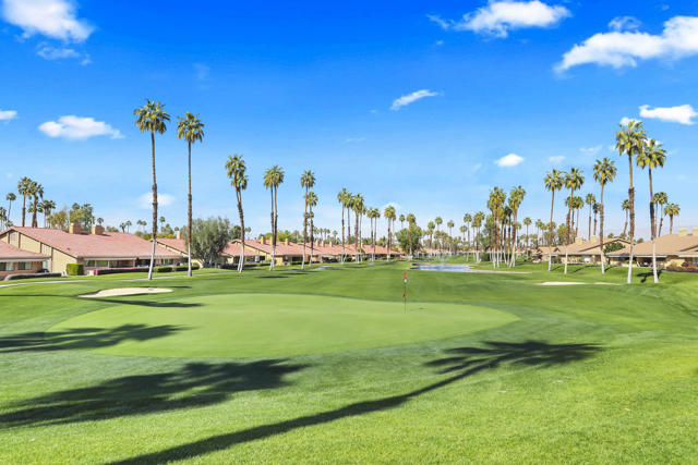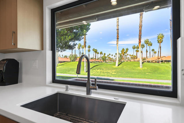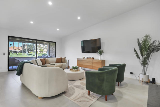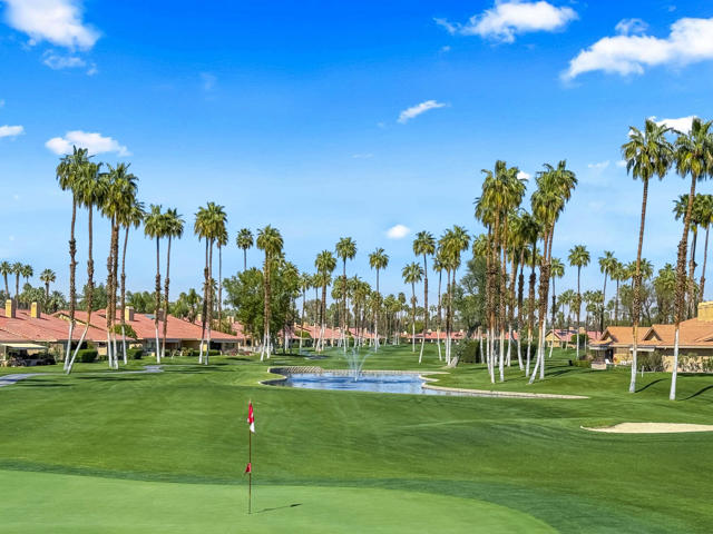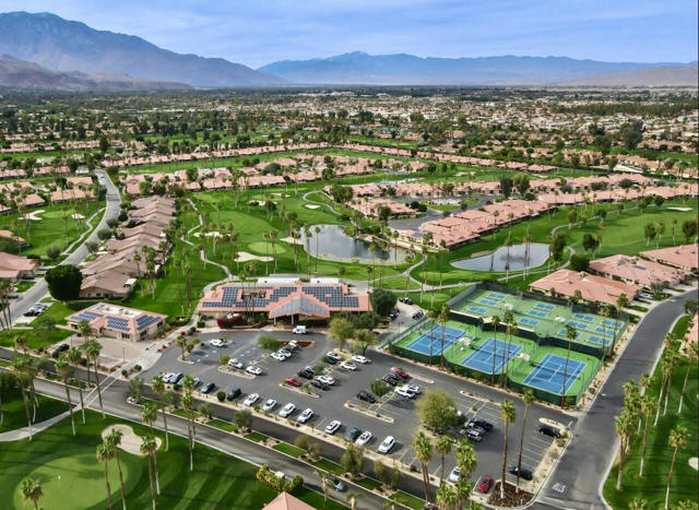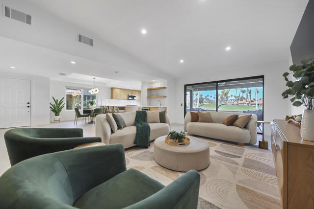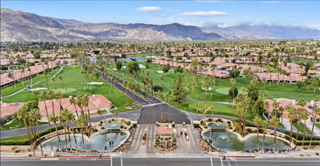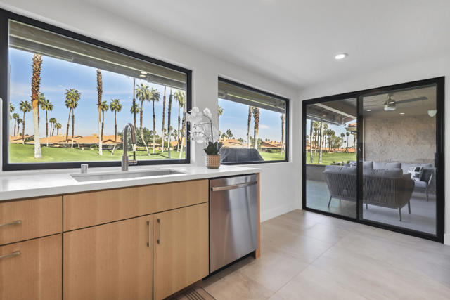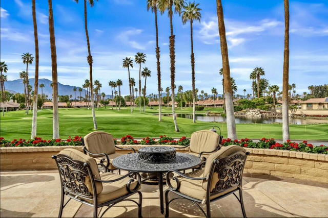 Completely REIMAGINED and REMODELED to modern Scandinavian-inspired elegance, this north-facing end-unit El Grande floor plan delivers the kind of calm, light-filled living that immediately makes you exhale. Clean lines, soft neutral tones, and abundant natural light create a serene, sophisticated ambiance from the moment you enter. Walls of windows frame uninterrupted views straight down the center of the lush fairway, across a sparkling lake with fountain, and toward the dramatic Chocolate Mountains beyond. The indoor-outdoor connection is exceptional. The expanded open-concept layout features vaulted ceilings, custom tile flooring throughout, and energy-efficient dual-pane windows. A dramatic floor-to-ceiling two-sided fireplace anchors both the living space and the expanded third bedroom/game room, enhancing warmth and architectural interest. The redesigned kitchen is both beautiful and functional, offering Quartz countertops, a generous breakfast bar with seating for four, stainless steel appliances, and a separate wet bar with wine refrigerator and floating shelves--ideal for entertaining. The primary suite is a private retreat with a walk-in closet and a spa-inspired bath featuring dual vanities, a freestanding soaking tub, and an oversized tiled shower. The guest bedroom enjoys direct access to a hall bath, while the expanded third bedroom functions beautifully as a den, game room, or additional suite, complete with vaulted ceilings, skylights, fireplace, and its own full bath with a large tiled shower. Additional highlights include a new roof, new west-facing Milgard dual-pane windows, new screens on the sliding glass doors, recessed lighting throughout, and direct access to an oversized garage with abundant built-in storage through the laundry room with added cabinetry. The tiled patio features an automatic retractable awning, modern ceiling fan, and convenient side-yard access gate. Located within Chaparral Country Club in the heart of Palm Desert, residents enjoy an 18-hole golf course, 21 pools and spas, tennis, pickleball, fitness center, activity center, and a beautifully remodeled clubhouse with dining and social events. HOA dues include basic cable and internet, trash, landscape maintenance, exterior maintenance, and roof coverage. This home offers an exceptional blend of architectural presence, calming design, and premier golf course positioning.
