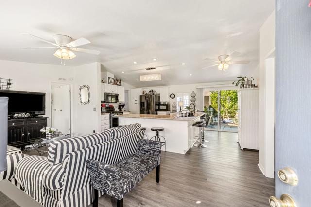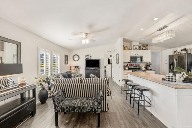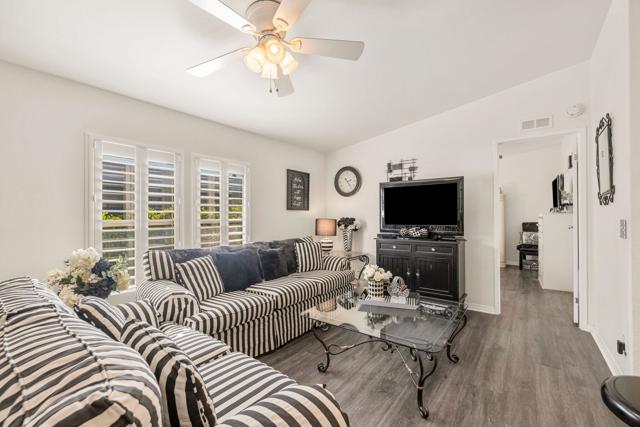 Located within the gated 55+ community of Suncrest Country Club, this beautifully maintained residence offers an exceptional setting directly on the golf course with sweeping views and a thoughtfully designed layout. An expansive backyard opens to the fairway and features two covered patio areas--ideal for outdoor dining, morning coffee, or evening gatherings. The mature garden creates a private, tranquil atmosphere rarely found in this price category. Inside, the open floorplan is filled with natural light from an abundance of windows. Luxury vinyl flooring runs throughout the home, complemented by classic interior shutters that add both style and functionality. The kitchen is designed for connection and convenience, anchored by a large L-shaped island and seamless flow into the main living areas. A separate dining room provides space for more formal entertaining. The primary suite is positioned on one end of the home for privacy, while the secondary bedroom, exceptionally spacious is located on the opposite side. Currently configured as a den with sleeping quarters, this versatile room includes direct access to the backyard, making it ideal for guests or multi-use living. Additional highlights include a dedicated laundry room and an attached side-by-side two-car garage. Residents of Suncrest Country Club enjoy resort-style amenities designed for active adult living. The community's 359 homes surround a scenic 9-hole golf course designed by Dick Watson. Amenities include a welcoming clubhouse, one tennis court, eight pickleball courts, and three pools and spas--all within a secure, gated setting. An outstanding opportunity to enjoy golf course living with generous outdoor space, functional design, and access to exceptional amenities.