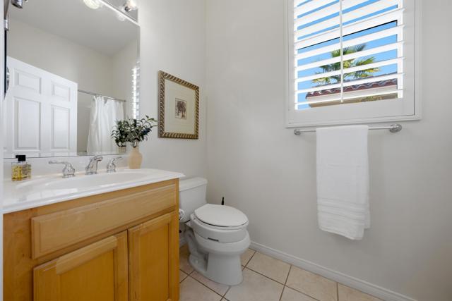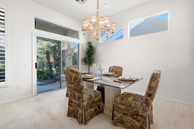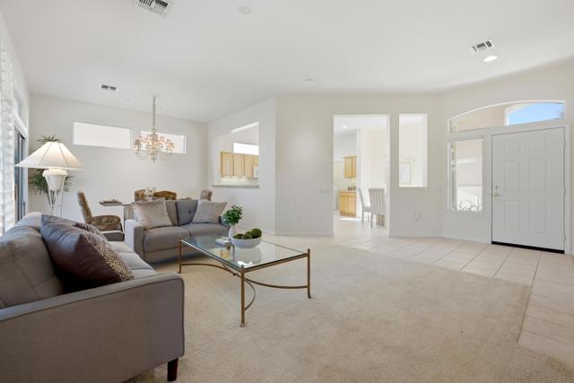 Sun City Palm Desert - Morocco with Casita. Ideally located just a short block from the Mountain View Clubhouse, fitness center, indoor pool, tennis courts, and golf course, this highly sought-after great room home offers the best of desert living. The south-facing rear yard is a true retreat, featuring a spacious patio, lush garden-like landscaping, and a tranquil fountain. A gated front courtyard with patio adds both charm and functionality. The main residence includes two bedrooms, two bathrooms, and a versatile den/office. The detached casita provides an additional bedroom and bathroom--ideal for guests or a private retreat. Inside, 10-foot ceilings and transom windows create a bright, open atmosphere, complemented by extensive tile flooring and shutters on most windows. The spacious great room opens to the rear patio through a sliding glass door. The kitchen is well-appointed with granite counters, a chef's island, recessed lighting, and maple cabinetry that continues throughout the kitchen, bathrooms, and linen storage. Double doors lead to the primary suite, featuring a bay window, a large walk-in closet, and an en-suite bath with dual sinks, cultured marble surfaces, and a glass-enclosed stall shower. The guest bathroom offers a tub/shower combination. French doors open from the courtyard to the casita, which includes a wet bar with refrigerator and a private bath with stall shower. The two-car garage features a utility sink and a dedicated nook for golf cart parking. Main AC new 2024. Furniture available.