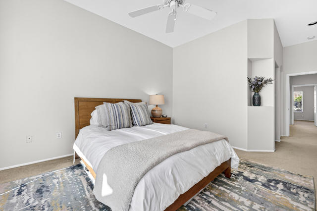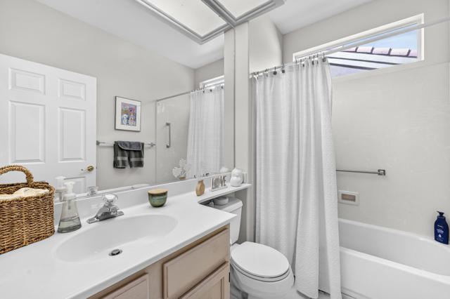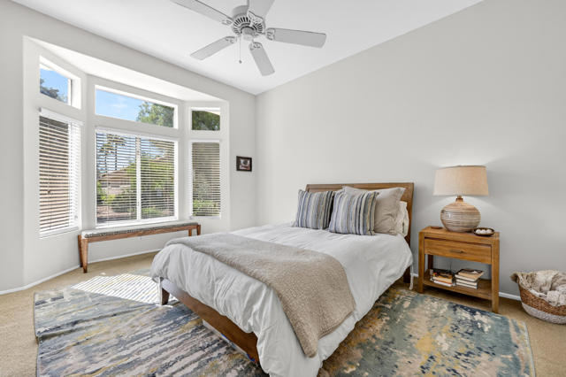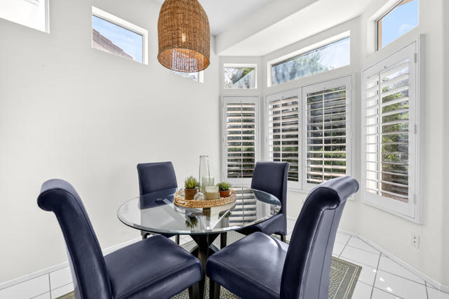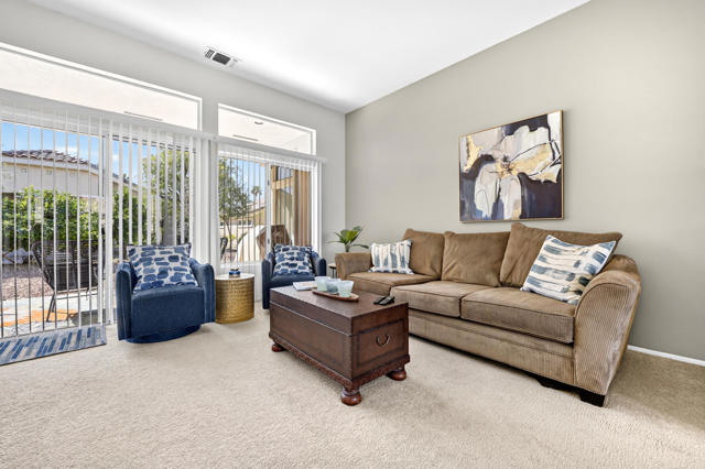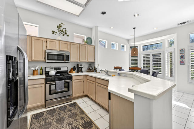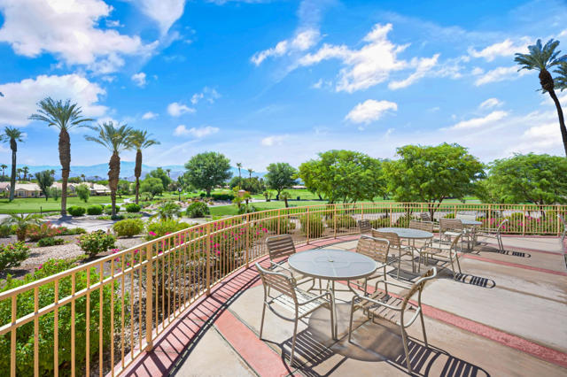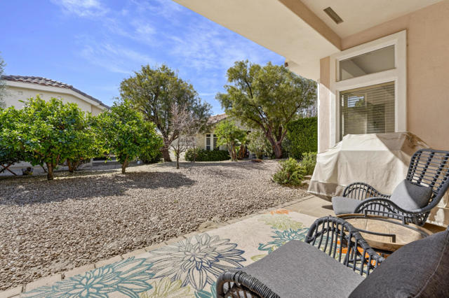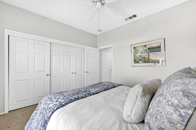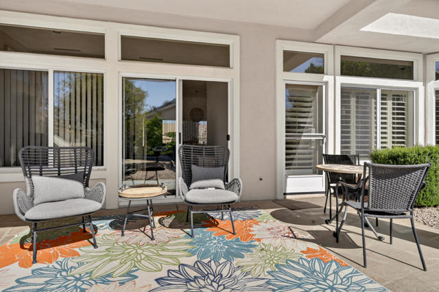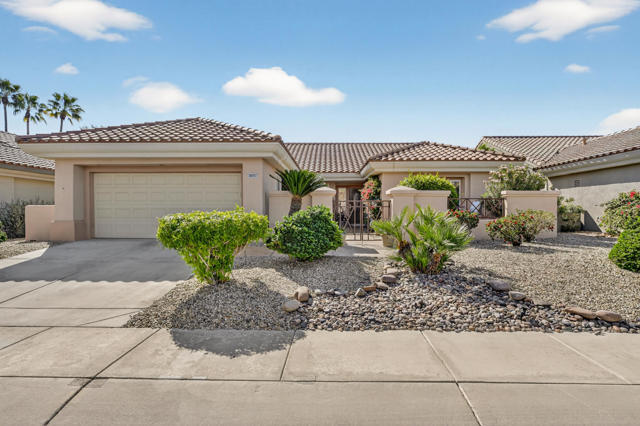 This Sun City Palm Desert 2 Bed, 2 Bath Orrefors plan home is located between two clubhouses and golf course. This home has a south facing rear yard and OWNED SOLAR! A gated front courtyard and low maintenance desert landscaping provides curb appeal. Inside you will find 10' ceilings, shutters, wood blinds, ceiling fans and indoor laundry with utility sink. The kitchen features Corian counters with stainless steel appliances. There is tile in the kitchen, breakfast nook, dining area, family room, and bathrooms. The breakfast nook has abundant recessed lighting. Therear patio is accessible by a slider from the living room and a French door from the family room. The owners suite has a bay window and large oversized closet with mirrored wardrobe doors. The owners suite bath has a large skylight, dual sinks & a stall shower. The guest bath has a shower over the tub. The 2 car garage has a nook for golf-cart parking. Golf Cart is included in the lease. Sun City Palm Desert is resort living for 55 plus at its finest! Amenities include gated and guarded entry with 24- hour patrol, two 18-hole Golf Courses, three clubhouses, multiple on site restaurants and cafe's, two fitness centers, pools and hot tubs, Pickleball & Tennis courts, dog parks, jogging and bike paths, 80 plus clubs and groups and much more!