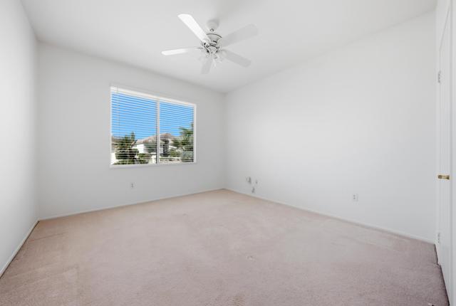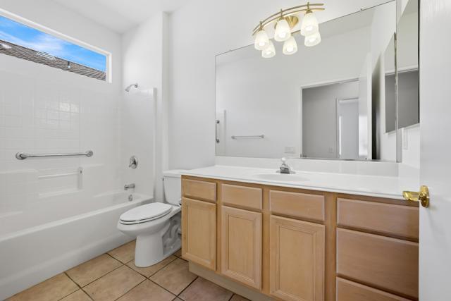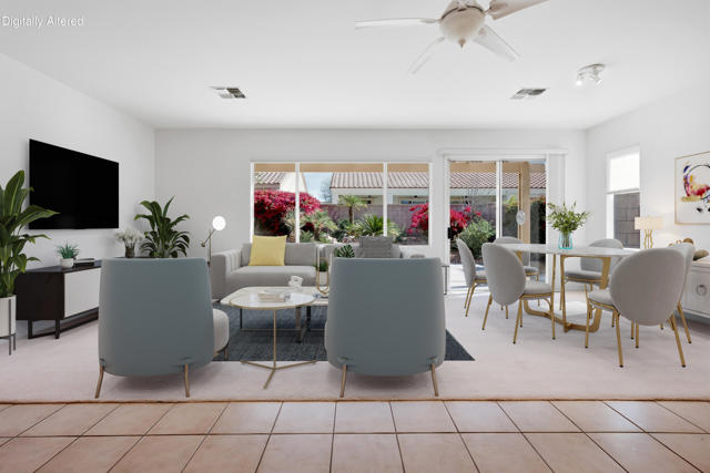 Sun City Palm Desert - St. Maarten. This sought-after St. Maarten greatroom floorplan offers 2 bedrooms, 2 bathrooms, plus a den. The spacious east-facing backyard features an extended patio with alumawood cover and lush desert landscaping for outdoor enjoyment. Updated exterior paint and vibrant flowering cacti enhance curb appeal. Inside, tile flooring extends throughout the main living areas, while the great room opens directly to the rear patio through sliding glass doors. The kitchen includes a chef's island with breakfast bar, Corian counters, a bright recipe window, and a pantry. Off the hallway, a generous den makes the perfect office or hobby space. The primary suite offers a bay window, large walk-in closet, and bathroom with sitting vanity and glass-enclosed shower. A guest bedroom with walk-in closet is adjacent to the full guest bath with tub/shower combo. Additional highlights include a laundry room with built-in storage, a 2-car garage with cabinetry, and a newer AC unit installed in 2019.