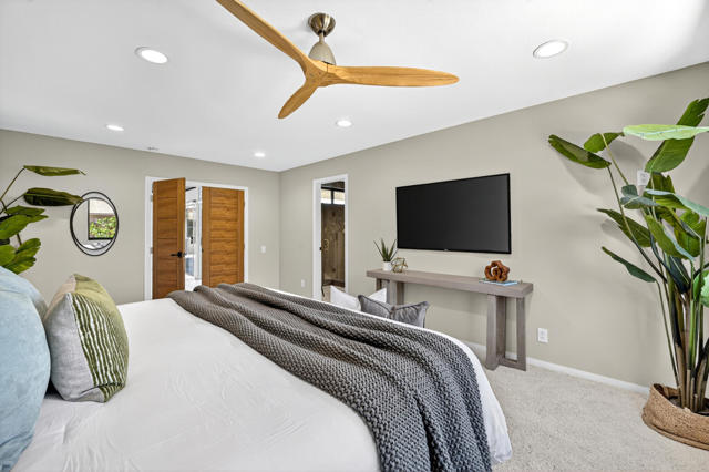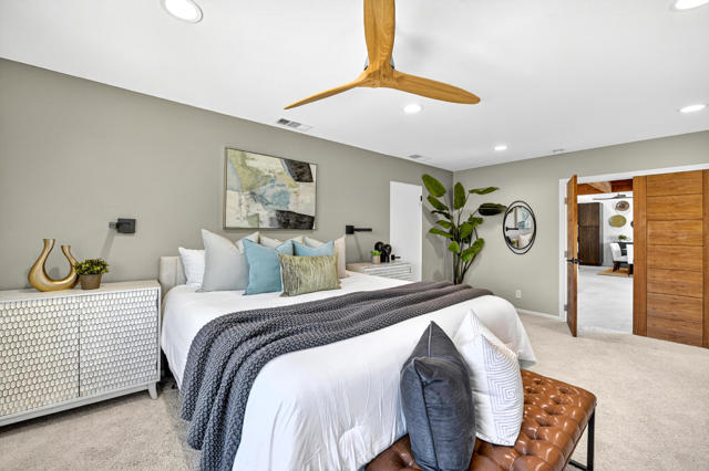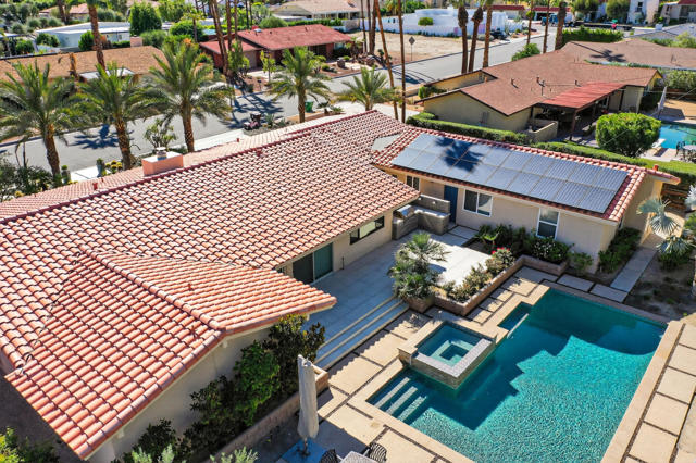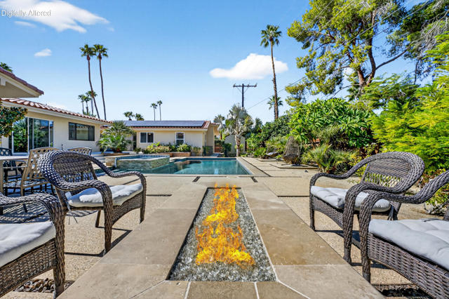 Rare opportunity to own a fully renovated desert retreat in the heart of South Palm Desert, complete with a detached casita and resort-style outdoor living. Set behind professionally landscaped grounds and a striking limestone-accented exterior, this home is designed for effortless indoor-outdoor flow and elevated everyday living.Inside, an open-concept layout is highlighted by soaring vaulted hardwood ceilings and refined designer finishes throughout. The inviting family room is anchored by a gas fireplace and flows seamlessly into a show-stopping kitchen built for gathering. A dramatic stone waterfall island with seating for six is complemented by a six-burner range, wine and beverage refrigerator, and generous custom cabinetry--ideal for both entertaining and daily life.Expansive dual sliders open to a private backyard oasis, where porcelain tile continues from interior to patio for a seamless transition. Enjoy a resort-inspired setting featuring a Pebble Tech pool and spa, built-in barbecue, and custom fire feature--perfect for relaxed afternoons, evening entertaining, and starlit desert nights.The primary suite is a serene private retreat, offering a spa-like bath with rain shower, dual vanities, private water closet, and dual walk-in closets. Two additional guest bedrooms and a full bath are thoughtfully positioned for privacy, while an office, powder room, laundry area, and abundant storage enhance comfort and functionality.A fully finished detached casita adds exceptional flexibility with its own full kitchen, spacious living area, and private entrances from both the backyard and side yard--ideal for guests, extended family, or potential rental use.Purchased solar adds energy efficiency to this exceptional South Palm Desert residence, where refined design, flexible living, and resort-style amenities come together in perfect balance.