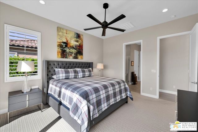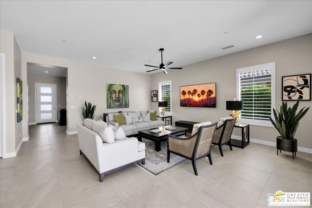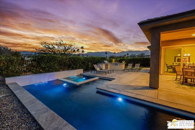 Resort-Style Sanctuary with 40-Ft Pool & Spectacular Mountain Views! Experience elevated desert living in this beautifully upgraded Phase 2, Plan 4 Sanctuary floorplan with a classic Tuscan facade, ideally positioned to capture breathtaking mountain views. This exceptional residence showcases a magnificent 40-FOOT POOL AND SPA, creating a true private resort setting within the prestigious 55+ community of Del Webb Rancho Mirage. Inside, the home is rich with thoughtful upgrades, including 24-INCH PORCELAIN TILE FLOORING, 4-inch baseboards, custom window treatments, and designer ceiling fans, creating a sophisticated yet comfortable atmosphere throughout. The stunning chef's kitchen has been recently reimagined with custom modern floor-to-ceiling soft-close cabinetry, contemporary hardware and fixtures, and elegant matte-finish quartz countertops. A premium KITCHENAID PROFESSIONAL SERIES APPLIANCE SUITE, complete with pot filler, enhances both form and function. At the center of the space, a dramatic island with waterfall edges, hidden storage, and pendant lighting offers generous seating and makes the perfect gathering place for entertaining. The open-concept design flows seamlessly into the dining and living areas, where the highly coveted six-panel corner sliding glass door system creates an extraordinary indoor-outdoor connection when fully opened - perfectly embracing the quintessential desert lifestyle. The primary suite enjoys serene mountain views through an upgraded sliding glass door and offers a spa-inspired ensuite bath with recently updated modern soft-close cabinetry, contemporary fixtures, a spacious stall shower with bench seating, and a large walk-in closet. Step outside to a beautifully landscaped backyard retreat where the impressive 40-foot pool and spa take center stage. A built-in gas BBQ and cooktop create the ideal outdoor entertaining space, all set against a dramatic mountain backdrop. The guest bedroom is thoughtfully located on the opposite side of the home for maximum privacy and enjoys access to a recently updated secondary bath featuring a glass-enclosed stall shower and modern cabinetry with updated hardware. A versatile den/flex space, positioned near the guest wing, includes a privacy door, LED lighting, and enhanced power and cable management for a wall-mounted television - making it ideal as a media room, office, or creative space. Additional highlights include OWNED SOLAR, a WHOLE-HOME WATER SOFTENING SYSTEM, upgraded doors for enhanced sound absorption, and EV pre-wiring in the garage. Residents of Del Webb Rancho Mirage enjoy an unparalleled lifestyle with access to a spectacular clubhouse, state-of-the-art fitness center, resort-style pool and spa, tennis and pickleball courts, and a vibrant calendar of social events and activities. The HOA now also includes cable and internet service. A true desert sanctuary combining luxury design, resort-style amenities, and unforgettable mountain views.