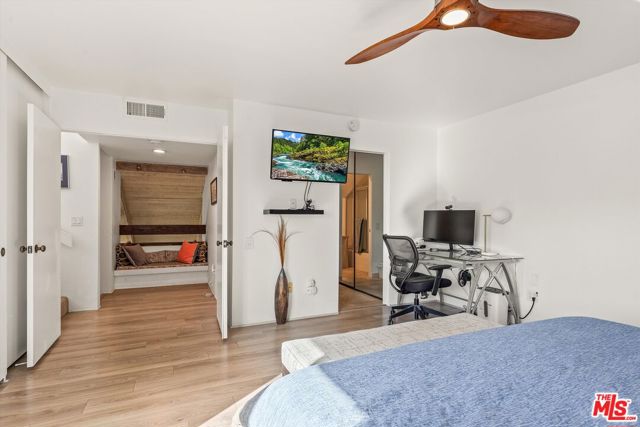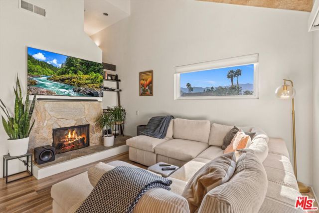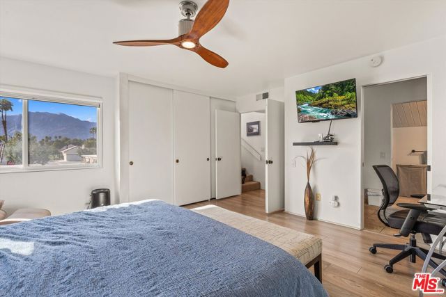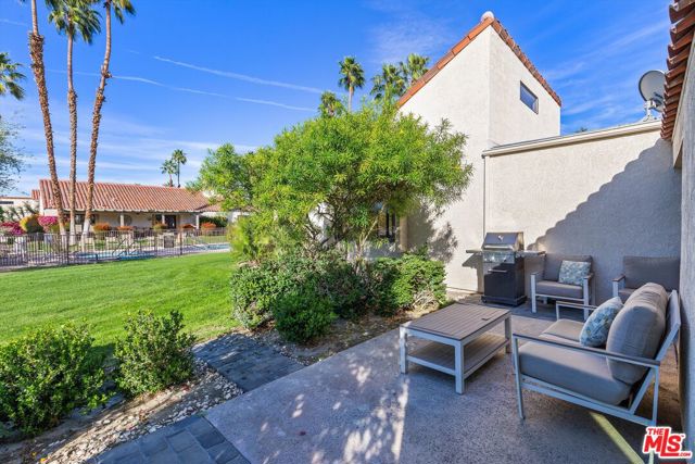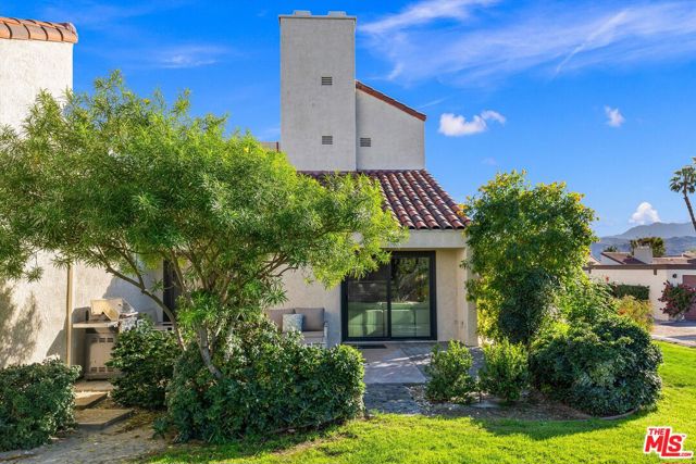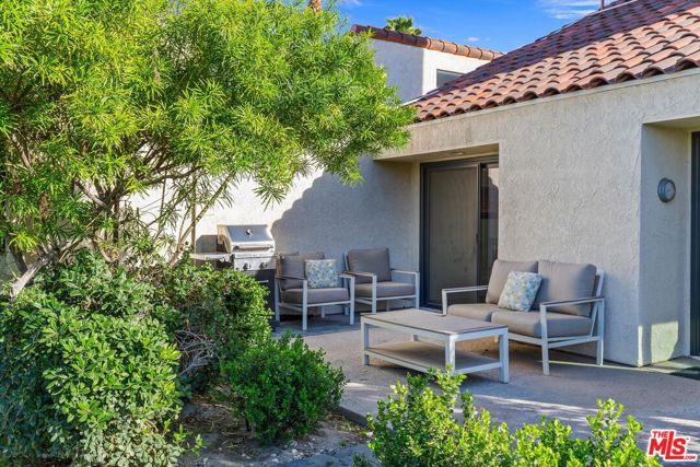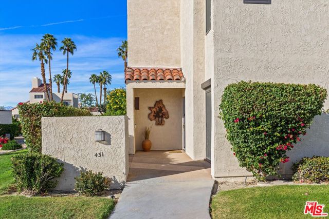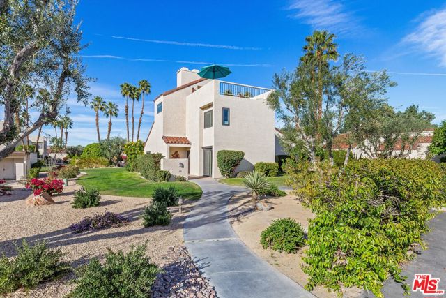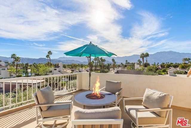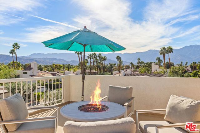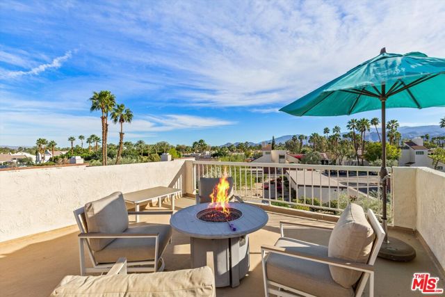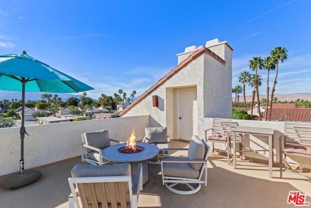 Welcome to Mission Hills Country Club living at its finest. This beautifully updated 2-bedroom, 2-bath condo offers a rare blend of style, comfort, and iconic desert views. Ascend to your private rooftop deck and take in breathtaking 360-degree mountain panoramas perfect for sunset cocktails or stargazing under the desert sky. Inside, over 1,500 square feet of thoughtfully designed living space features dual primary suites, one on each level, ideal for privacy and flexibility. Recent upgrades include a tankless water heater, dual-paned windows and sliders for energy efficiency, fresh interior paint, and motorized window coverings that allow you to set the mood at the touch of a button. An exterior roller shade helps keep the home cool during warm summer days. Both bedrooms showcase striking feature walls that add personality and polish. The downstairs bathroom has been stylishly remodeled with terrazzo flooring and a fully tiled walk-in shower. Upstairs, a cozy retreat area creates a welcoming transition to the second suite perfect for a home office, reading nook, or guest lounge. Step outside the living room slider to enjoy a recently renovated community pool just moments away, offering resort-style relaxation right outside your door. Then, head up one more level to your private rooftop escape your personal oasis with unmatched views, a perfect outdoor space for entertaining guests. Located behind the 24-hour guard-gated Dinah Shore entrance, Mission Hills Country Club delivers an exceptional lifestyle with 54 holes of championship golf, tennis and pickleball courts, a state-of-the-art fitness center, spa, and multiple on-site dining options. Various membership opportunities are available. This is desert living elevated don't miss your chance to call it home.