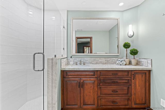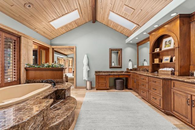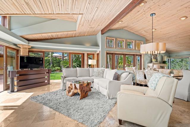 Private Resort-Style Single-Level Estate on Nearly One Acre with Detached Casita/ADU A rare opportunity to own a private, resort-style estate set on nearly one acre of beautifully manicured, park-like grounds, complete with a detached ADU/casita ideal for guests or extended family. The property offers an extraordinary sense of serenity and space, with meandering garden pathways, lush landscaping, and dramatic cascading waterfall features—all centered around a magnificent Torrey Pine that creates a truly breathtaking natural setting. Designed for effortless indoor-outdoor living, the bright and open floor plan features expansive patio doors that seamlessly connect the main living areas to the spectacular backyard retreat. The beautifully upgraded kitchen showcases high-end stainless steel appliances, abundant cabinetry, generous eat-in counter seating, and a built-in breakfast area for casual dining. The adjacent family room provides a welcoming gathering space and opens fully to the backyard, allowing the home to flow naturally into the outdoor living areas. The luxurious primary suite serves as a private sanctuary, featuring a spa-inspired bath, oversized walk-in closet, cozy fireplace, and spacious sitting area. Each bedroom is designed as an ensuite retreat, offering comfort and privacy for family and guests. Distinctive architectural elements add warmth and character throughout, including a striking ceiling crafted from reclaimed wine vineyard stakes. Outdoor living is equally impressive, with expansive patios featuring two fireplaces, an outdoor bar area, and a tranquil spa nestled beside a cascading waterfall—creating the perfect setting for both entertaining and peaceful relaxation. The detached ADU offers exceptional versatility, with its own dedicated parking and private patio. The space includes a kitchen, den, full bedroom and bath, and vaulted ceilings, providing the feel of a private luxury casita. Additional highlights include a three-car attached garage and thoughtfully designed spaces that blend elegance, comfort, and natural beauty.