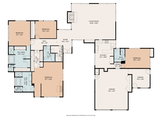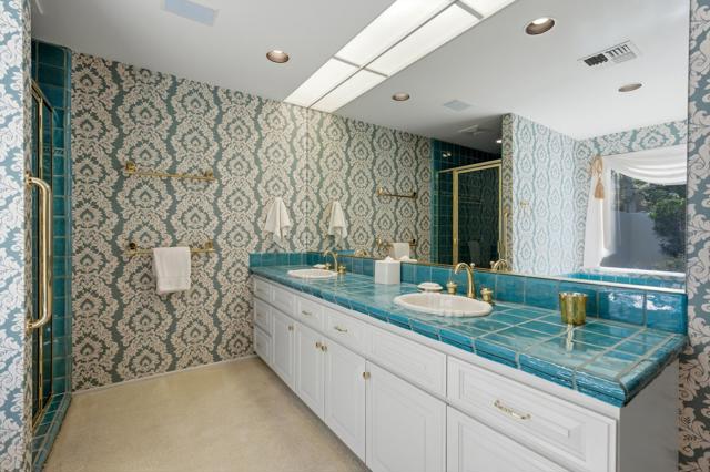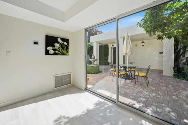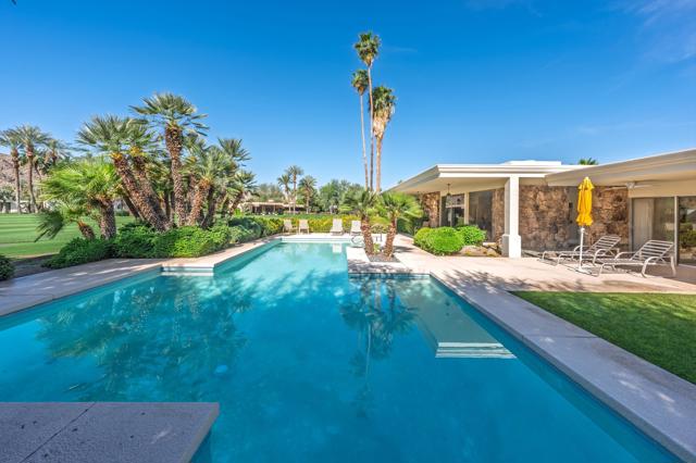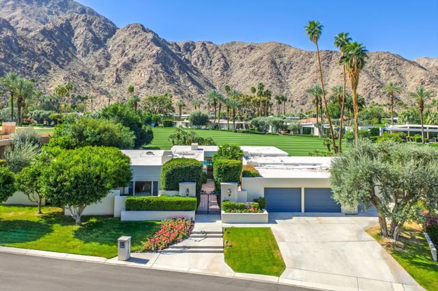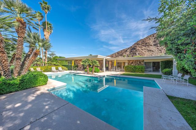 Set on the 15th fairway of Eldorado Golf Course, this spacious 1964 mid-century modern residence captures magnificent southwest mountain and fairway views and delivers the quintessential desert lifestyle. Offering 3,454 sq. ft. of living space on a 17,424 sq. ft. lot, the home blends classic architectural character with comfortable, open-concept living; perfect for entertaining and relaxed everyday enjoyment.A private entry courtyard creates a striking arrival and a welcoming sense of seclusion. Inside, the open living and dining areas feature a stone fireplace, generous gathering space, and a dedicated bar area; ideal for hosting family and friends while taking in the view-focused setting.The kitchen is designed for functionality and ease, featuring quartz countertops, tile flooring, two ovens, a 4-burner cooktop with vent, dishwasher and microwave; ready for everything from casual mornings to dinner parties. The bedroom layout offers excellent flexibility and privacy with two primary suites, a guest ensuite, and an additional guest bedroom with an adjacent hall bathroom--ideal for multi-generational living, extended stays, or a home office option. Outdoors, enjoy a sparkling pool with a new pool heater, framed by dramatic mountain backdrops and lush fairway vistas; your own resort-style retreat. Completing the property are a two-car garage plus a dedicated golf cart garage for effortless course access. Come for the location and stay for the tranquility and views!