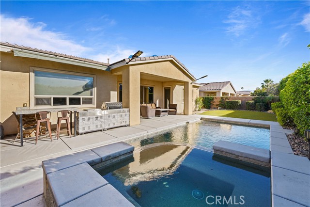 Welcome to your private desert retreat in the heart of La Quinta, where luxury, comfort, and lifestyle come together seamlessly. This beautifully upgraded and fully furnished 4 bedroom, 4 bathroom home offers the perfect blend of modern design and resort style living. From the moment you arrive, you are greeted by clean desert landscaping and inviting curb appeal that sets the tone for what is inside. Step through the entry into a spacious open concept floor plan featuring expansive tile flooring, custom finishes, and a seamless flow between the living, dining, and kitchen areas. The living room is anchored by a stunning stone fireplace and enhanced by a fully integrated smart home system, offering convenience and control at your fingertips. The chef’s kitchen is designed to impress, showcasing a large center island with bar seating, sleek cabinetry, stainless steel appliances, double ovens, and designer lighting that creates a warm yet modern feel. Whether you are hosting guests or enjoying a quiet night in, this space delivers both function and style. The primary suite is a true retreat, offering generous space, direct access to the backyard, and a spa inspired bathroom complete with dual vanities, soaking tub, and a glass enclosed walk in shower. Each additional bedroom is well appointed, providing comfort and flexibility for guests, family, or a home office. Step outside to your own private resort where the backyard features a sparkling pool and spa, covered patio, and built in BBQ area perfect for entertaining or relaxing under the desert sky. Whether you are enjoying a morning coffee or hosting an evening gathering, this outdoor space is designed to elevate your lifestyle. Ideally located just minutes from world class golf courses, renowned dining, shopping, and the area’s most popular annual festivals, this home offers both a prime location and an exceptional living experience. Offered fully furnished and equipped with a high end smart home system, this is a rare opportunity to own a turnkey property in one of La Quinta’s most desirable areas.