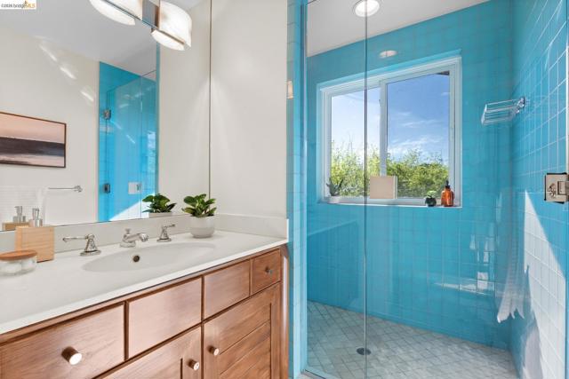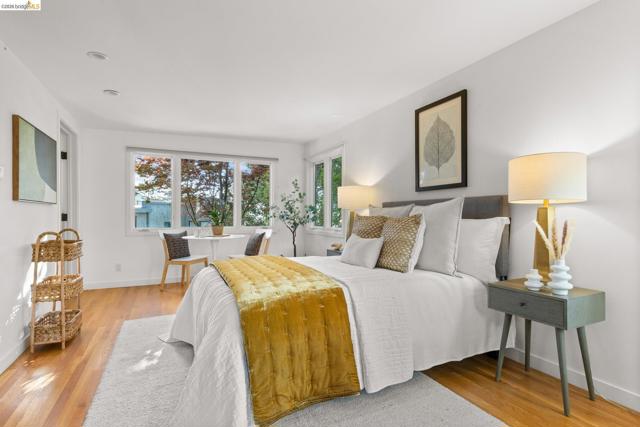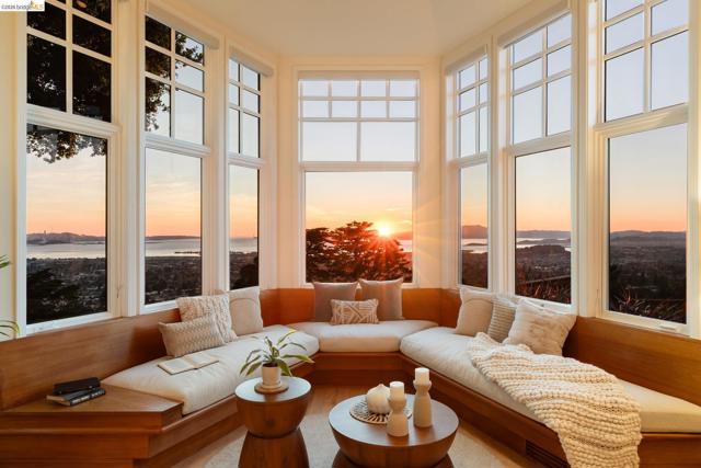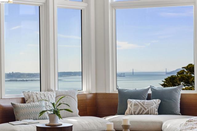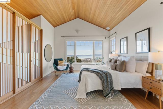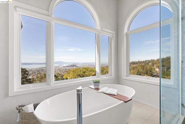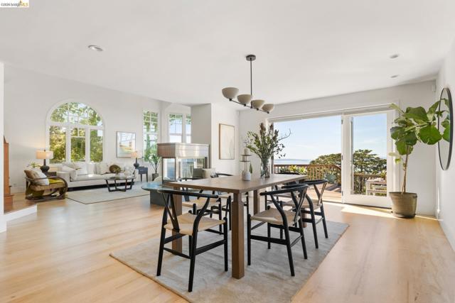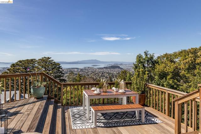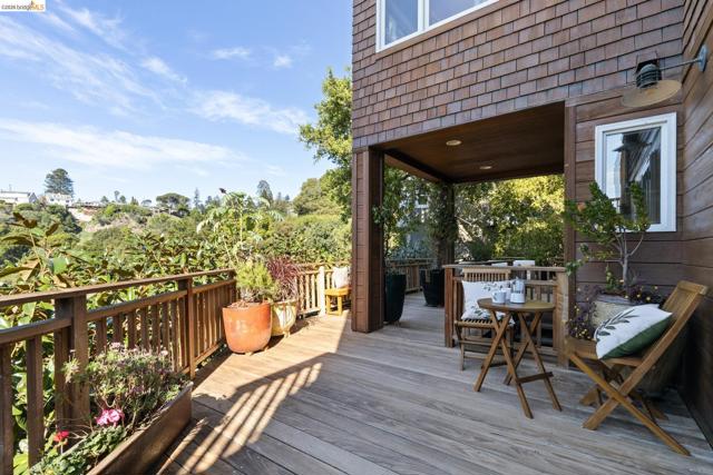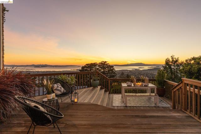 Nestled in the coveted North Berkeley Hills, this striking contemporary home captures breathtaking panoramic views of the San Francisco Bay including the Golden Gate Bridge, Bay Bridge, Mount Tamalpais, and the sparkling city skyline. Expansive picture windows fill the living spaces with light and showcase spectacular sunsets. The dramatic main level great room features soaring ceilings, birds-eye maple floors, a modern gas fireplace, and seamless indoor-outdoor flow to an expansive Ipe deck surrounded by mature oaks and lush landscaping. The chef’s kitchen offers Kirkstone countertops, cherry cabinetry, Thermador range, Sub-Zero refrigerator, a skylight, and an island between the kitchen and dining area, for easy entertaining. The serene primary suite features vaulted ceilings, cherry wood floors and built-ins, and a spa-inspired bath with a soaking tub and a glass shower, both with Bay views. Two additional bedrooms, a family room, and one and a half baths complete the main home on the lower level, and they also open directly to a generous deck. The detached guest suite provides exceptional flexibility. Custom woodwork by Berkeley Mills. Owned solar panels and EV charger. Minutes to North Berkeley shops, iconic restaurants, downtown Berkeley, and trails. Home Energy Score of 10