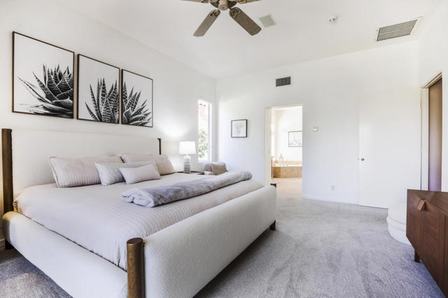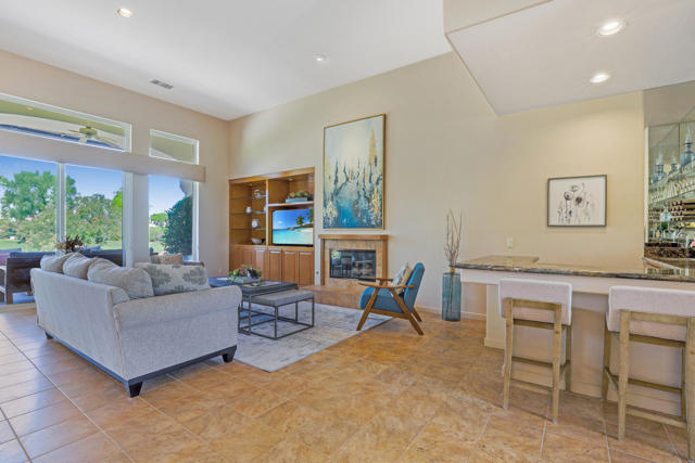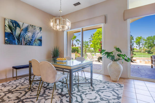 Available May 2026 at $3,500 and available November through January 15 2027 at $8,500/month. Not available for 2027 season. Spa Home with panoramic mountain & golf course views, elevated lot overlooking #18 Arroyo. Extended stone patio features private spa, fire pit, awnings and built-in BBQ. This Bougainvillea 1 floor plan is very popular due to open floor plan featuring living, dining, wet bar and kitchen all-encompassing the patio w/those great views! The private master suite opens right out on to the patio where you can take in the gorgeous views and comfort of your own spa. Master has walk-in closet and en suite bath with dual vanities, bathtub and separate shower. Bougainvillea 1 model has 2 en suite guest rooms - 1 in the front of the home and 1 on the opposite side of the home. Gorgeous pavers line your driveway and courtyard walkway, with a beautiful glass front door at your entry. Indian Ridge Country Club is one of the desert's premier private country club communities with a great central location in the Palm Springs area, close to Interstate 10, El Paseo and the airport. Use of owners GOLF membership available for additional cost and 3 month minimum.
