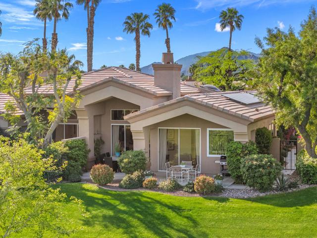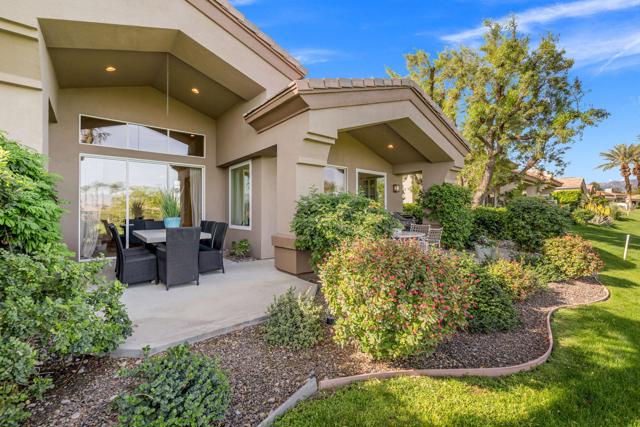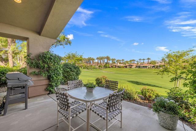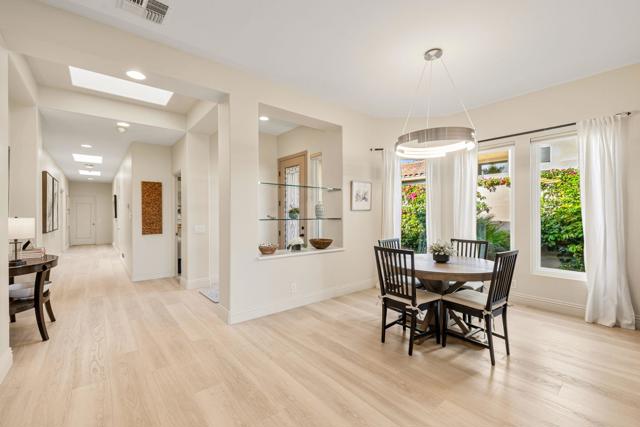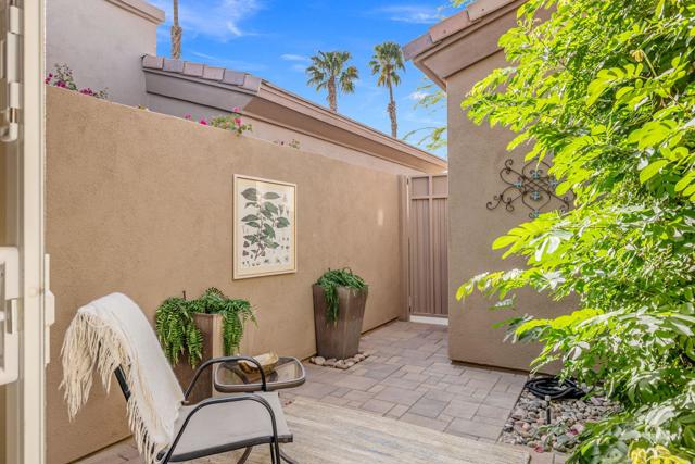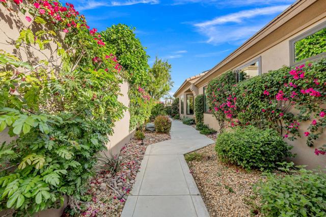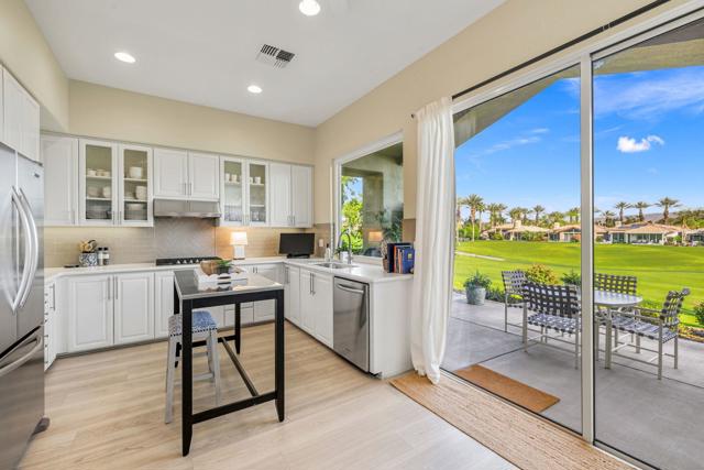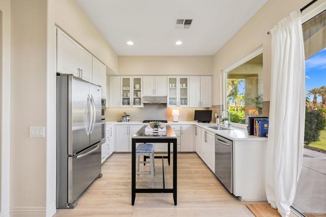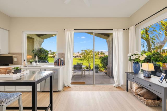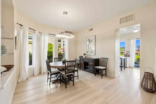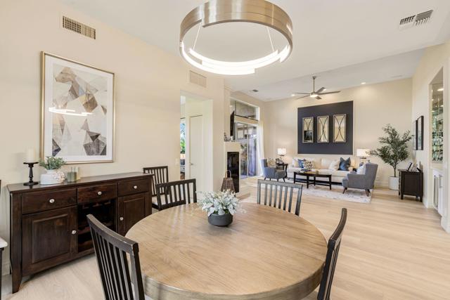Experience refined elegance in this beautiful Acacia 4 floor plan, offering 2,182 square feet of effortless, modern comfort. This exceptional 3-bedroom, 4-bath residence has been thoughtfully updated blending high-end furnishings and finishes with a light and airy open-concept design. From the moment you enter through the stunning leaded glass front door, you're welcomed into a sophisticated interior featuring light wood-look plank flooring throughout the main living areas, 6-inch baseboards, and an abundance of natural light enhanced by newer windows. The seamless great room layout was created by removing a pony wall allowing for effortless flow into the dining area and designer kitchen, ideal for both everyday living and entertaining. The chef's kitchen is a standout, complete with quartz countertops, custom cabinetry with glass insets, a stylish backsplash, stainless steel appliances, a 5-burner gas cooktop, and a moveable Front Gate utility island perfectly combining form and function. All three bedrooms are spacious ensuite retreats, each with beautifully updated bathrooms featuring floor-to-ceiling tile, frameless glass showers, and refined chrome fixtures. Additional upgrades include high-grade carpet in bedrooms, a wine cooler, epoxy-finished garage floor, and owned solar with a water softening and purification system for ultimate efficiency and comfort. Enjoy the ease of lock-and-leave living, with HOA amenities that cover exterior maintenance including paint, roofing, landscaping, cable, Wi-Fi, pest control, roof care, and and fire insurance on the structure. Ideally located just steps from one of the community's 37 pools and spas, this home is offered furnished per inventory and includes a golf cart with new lithium battery making it truly move-in ready. And perhaps most desirable of all, a golf membership is available with no wait allowing you to immediately embrace the full Indian Ridge lifestyle.