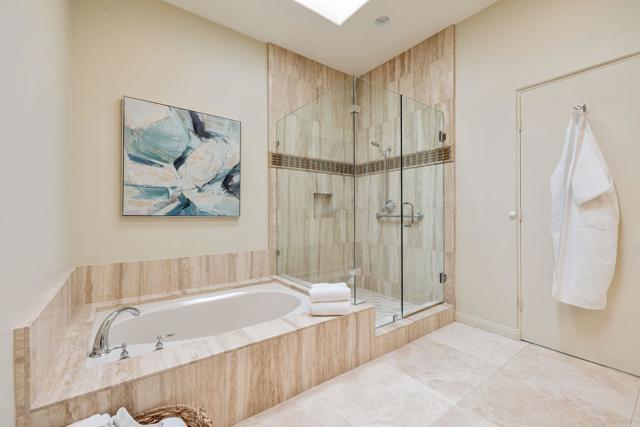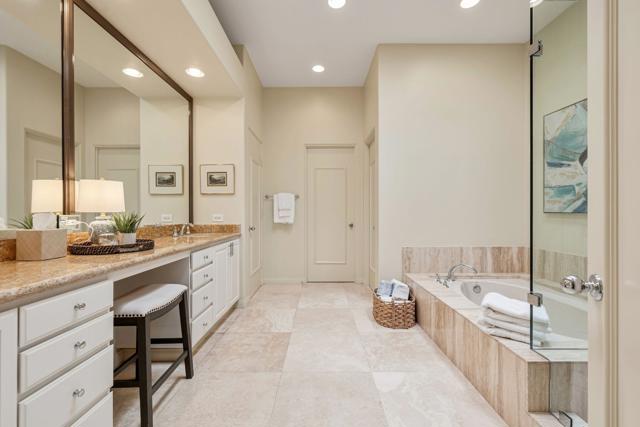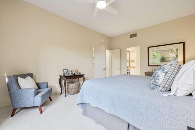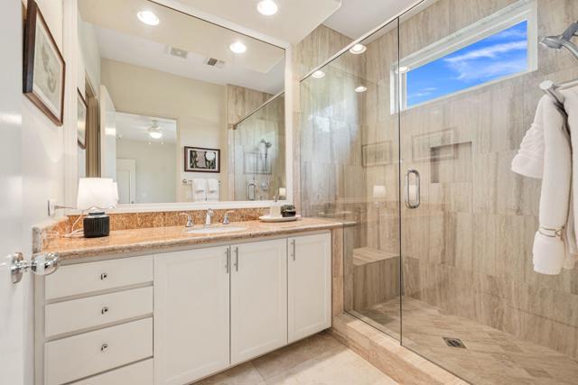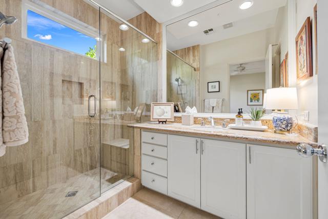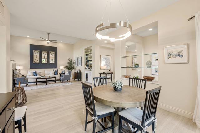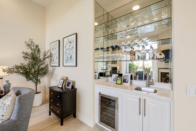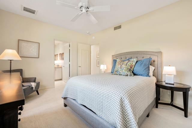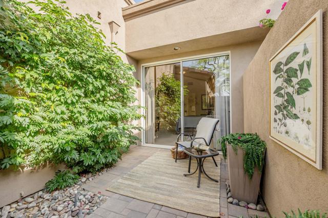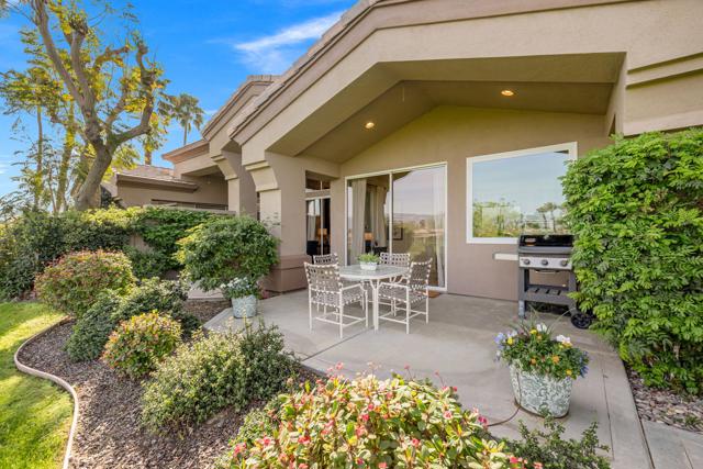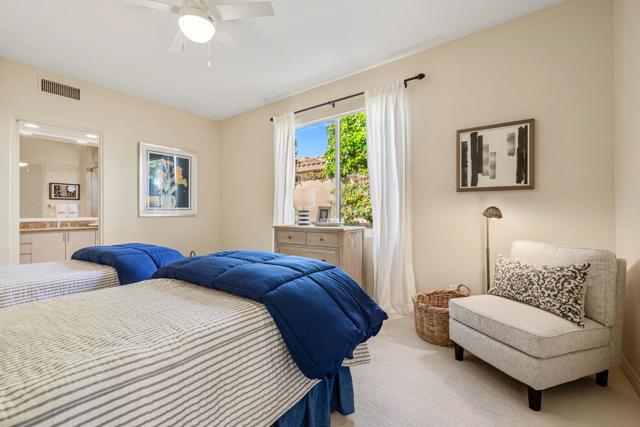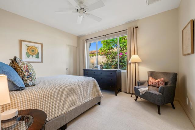 Experience refined elegance in this beautiful Acacia 4 floor plan, offering 2,182 square feet of effortless, modern comfort. This exceptional 3-bedroom, 4-bath residence has been thoughtfully updated blending high-end furnishings and finishes with a light and airy open-concept design. From the moment you enter through the stunning leaded glass front door, you're welcomed into a sophisticated interior featuring light wood-look plank flooring throughout the main living areas, 6-inch baseboards, and an abundance of natural light enhanced by newer windows. The seamless great room layout was created by removing a pony wall allowing for effortless flow into the dining area and designer kitchen, ideal for both everyday living and entertaining. The chef's kitchen is a standout, complete with quartz countertops, custom cabinetry with glass insets, a stylish backsplash, stainless steel appliances, a 5-burner gas cooktop, and a moveable Front Gate utility island perfectly combining form and function. All three bedrooms are spacious ensuite retreats, each with beautifully updated bathrooms featuring floor-to-ceiling tile, frameless glass showers, and refined chrome fixtures. Additional upgrades include high-grade carpet in bedrooms, a wine cooler, epoxy-finished garage floor, and owned solar with a water softening and purification system for ultimate efficiency and comfort. Enjoy the ease of lock-and-leave living, with HOA amenities that cover exterior maintenance including paint, roofing, landscaping, cable, Wi-Fi, pest control, roof care, and and fire insurance on the structure. Ideally located just steps from one of the community's 37 pools and spas, this home is offered furnished per inventory and includes a golf cart with new lithium battery making it truly move-in ready. And perhaps most desirable of all, a golf membership is available with no wait allowing you to immediately embrace the full Indian Ridge lifestyle.