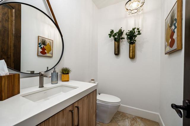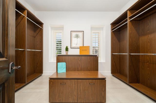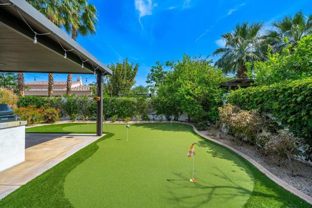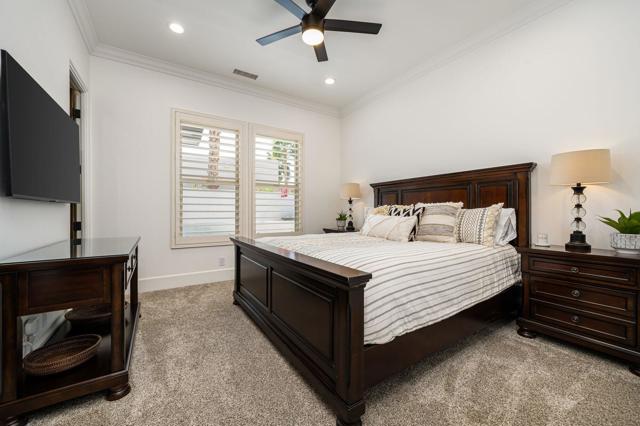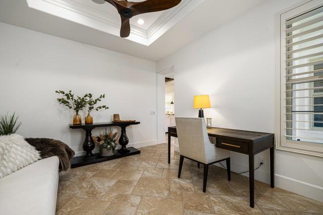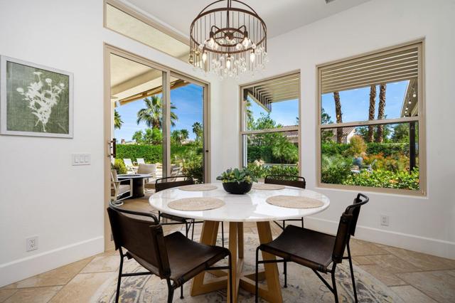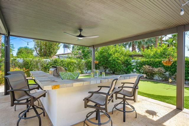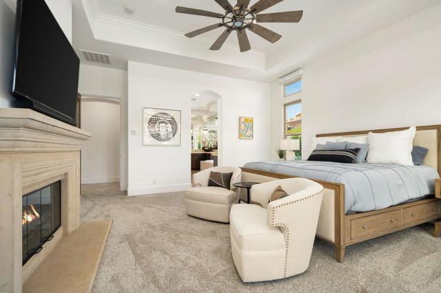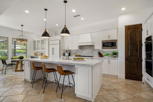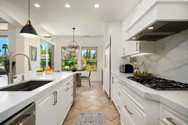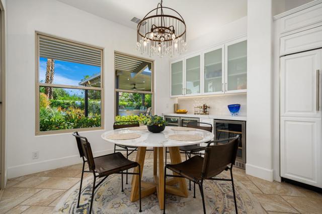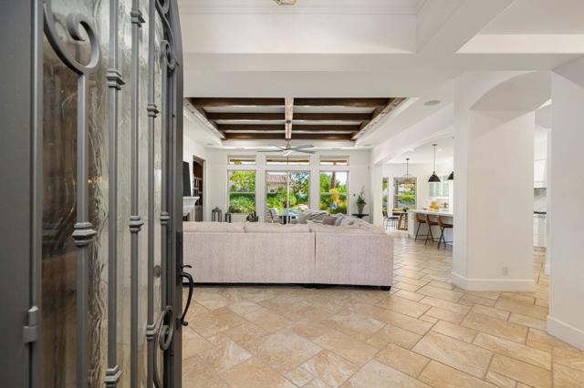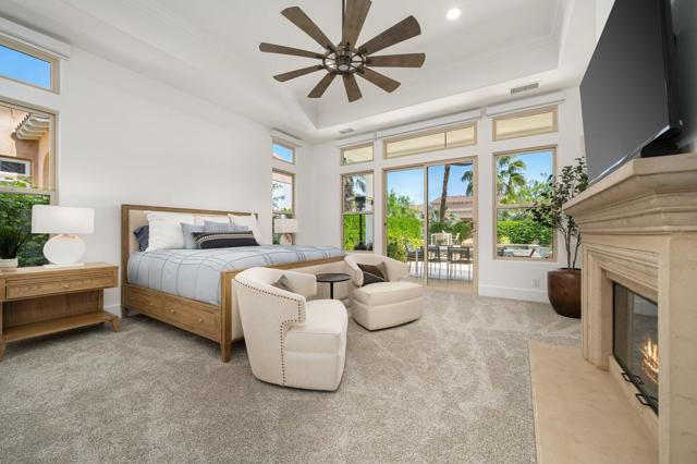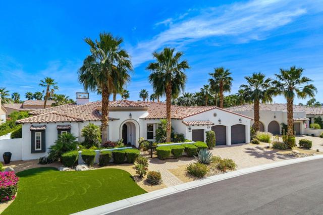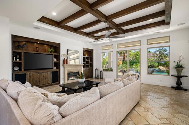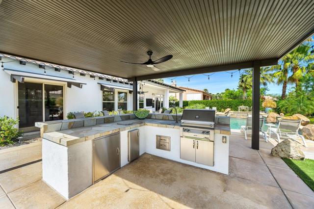 Welcome to this beautifully upgraded retreat behind the guard gates of Griffin Ranch in La Quinta.Surrounded by some of the most prestigious golf communities, including The Madison Club, The Hideaway, Andalusia, & The Quarry, this location delivers a lifestyle that's equal parts refined & relaxed. This home is designed for effortless indoor-outdoor living. Sun-filled interiors flow seamlessly into a stunning private backyard built for both entertaining and unwinding. The covered patio with multiple dining and relaxing areas, resurfaced pool and spa, fire pit, outdoor television, fans, heaters, outdoor sound system, putting green, and mature landscaping create a resort-style atmosphere, while the covered outdoor kitchen and upgraded lighting set the stage for evenings under the desert sky, enjoying your favorite libation while firing up the grill. Inside, the open-concept chef's kitchen anchors the home with Quartz counters, a huge island, dual ovens, multiple wine fridges, a walk-in pantry, and generous space for the whole gang to gather. The great room with its built-ins framing the fireplace, and wood-beamed ceiling is a dramatic focal point. A dedicated office/den/4th bedroom, behind a barn door, offers a quiet place to work, while the two en suite guest bedrooms with walk-in closets provide comfort and privacy for family and guests alike. The spacious primary retreat, with its own fireplace and an amazing, upgraded walk-in closet, is elevated by the gorgeous bath with separate dual sinks, a soaking tub, and a sizable shower that feels like a spa experience. Thoughtful upgrades throughout--updated flooring, refreshed finishes, enhanced lighting, ceiling fans, and whole-home audio--add both style and convenience. Additional highlights include a three-car garage with epoxy floors, updated HVAC systems, electric sunshades, and professionally designed landscaping with an automatic drip system. Life at Griffin Ranch extends well beyond your front door. Residents enjoy onsite access to a world-class clubhouse, fitness center, Pilates room, game room with a pool table and table tennis, tennis and pickleball courts, bocce ball courts, scenic walking paths, & a dog park. Outside the gates, you are close to many golf courses, hiking, biking, dining, entertainment at the Acrisure Arena, and everything that the desert has to offer.