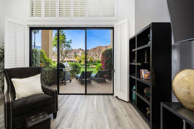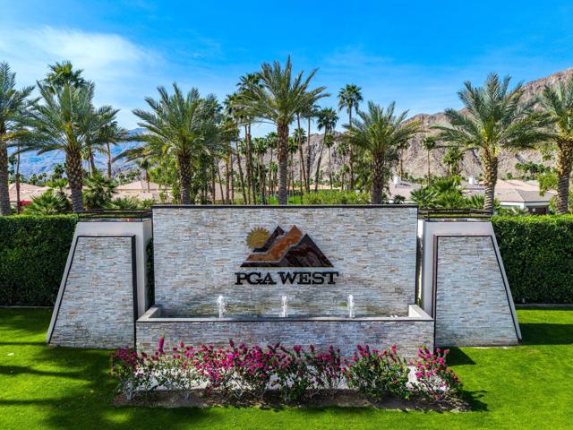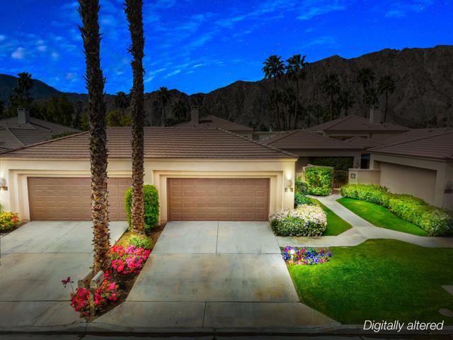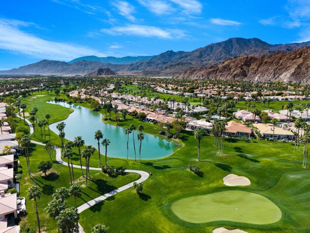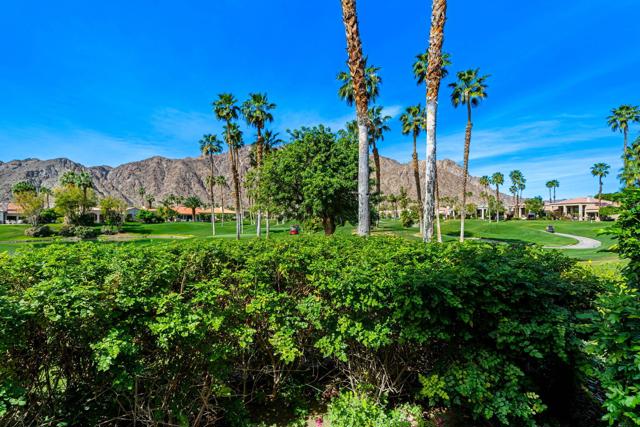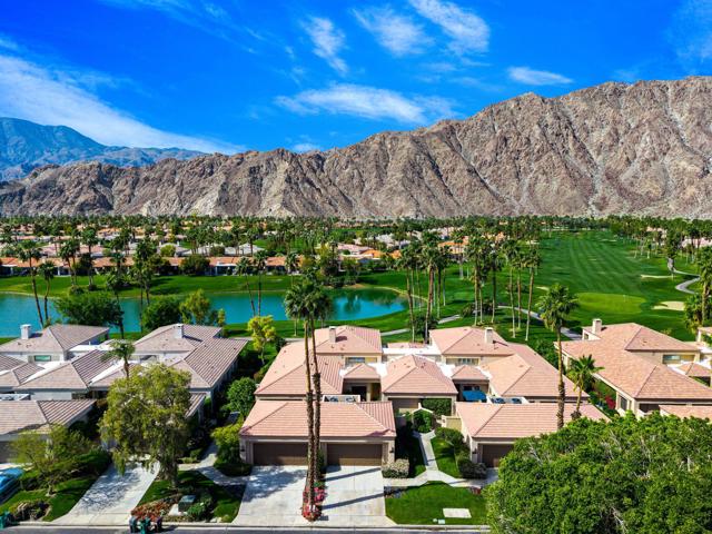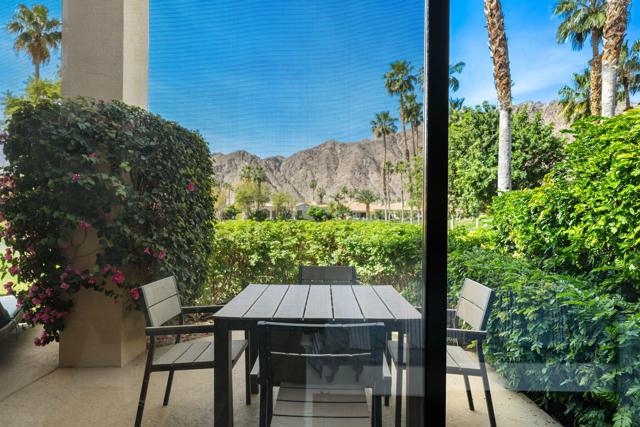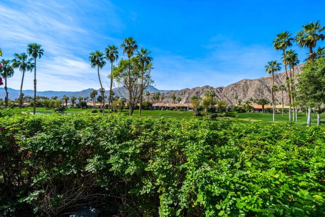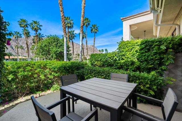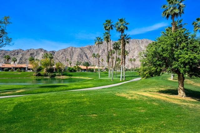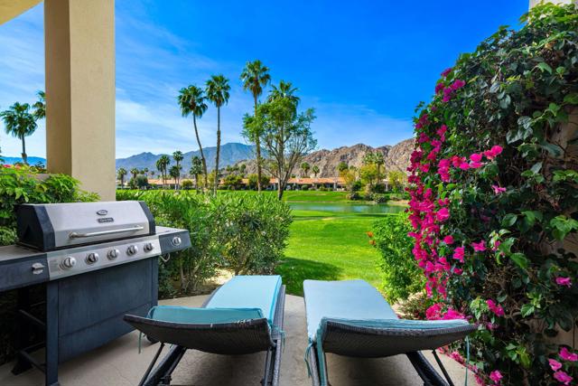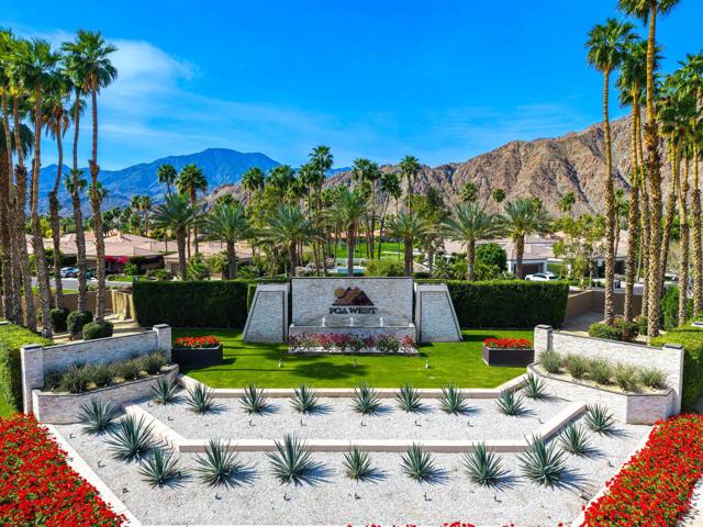 Welcome to your peaceful desert retreat at PGA West. Located on the 6th tee box of the Palmer Private Course, this beautifully updated Champion 1 model offers some of the best western panoramic views in the community. Set back from the cart path in a quiet location, you'll enjoy stunning vistas of the lake, fairway, and the Santa Rosa Mountains, which can be appreciated from both inside the home and right from your private patio.Inside, the open and spacious layout is bright, clean, and completely move in ready. The interior features high ceilings, fresh paint, ceramic tile flooring, and sleek quartz countertops. Large sliding glass doors bring in plenty of natural light and seamlessly connect the comfortable indoor living space with the beautiful outdoor setting. The expansive primary bedroom offers a private ensuite bathroom and direct slider access to the patio. Offered fully furnished per inventory with modern, tasteful decor, this popular floor plan is designed for easy living and effortless entertaining.Whether you're looking for a relaxing vacation home or a permanent residence, this property offers the classic PGA West lifestyle, with community pools and spas just a short walk away.The HOA takes care of just about everything on the outside, from roof maintenance, exterior paint, and pest control to earthquake and exterior condo insurance, plus all front and back landscaping outside the courtyards. Cable and internet are also included with your dues, making this a true lock and leave retreat.