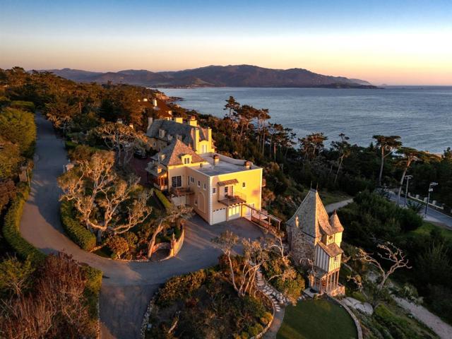 Cantilevered balconies extend over a canopy of cypress trees, revealing unbroken views of Point Lobos. The sea appears as an infinite sheet of white light, the sun's rays refracting through a fine mist at the water's edge. A French chateau on a private street with only four homes, this Pebble Beach residence spans nearly three acres, connecting Ballantrae to the lower gate of 17 Mile Drive. A castle-tower guest house feels transported from a storybook, while each room of the main house reflects genuine Old World sensibility. In the kitchen, exposed dark wood ceiling beams and Saltillo terracotta flooring frame ivory cabinetry, premium appliances, and a La Cornue range. In the dining room, diamond-paned windows with beveled glass cast shimmering waves of light across the table. Once dinner guests disperse and the entire house bathes in a warm amber glow, retreat to an intimate living room where bookcases house cherished volumes behind wire-mesh cabinets flanking a flickering fireplace. After nightfall, on your way to a moonlit soak in the outdoor hot tub, pass through a solarium where classical columns surround an ancient rust-hued rock. Breathing in its earthy scent while the ocean roars endlessly below, you'll smile to yourself at this special symphony of landscape and artistry.