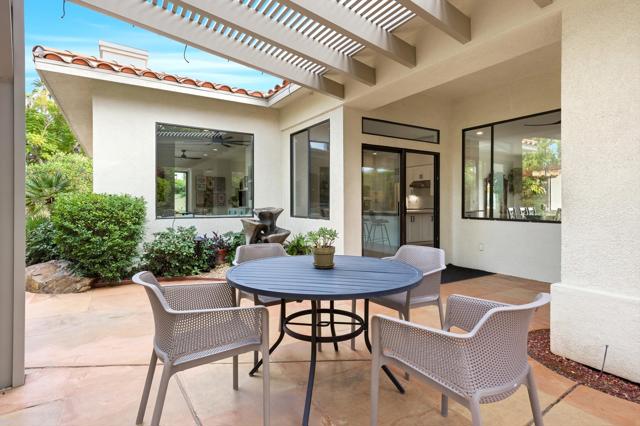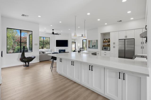 Every detail has been thoughtfully considered, making this home with 10' ceilings a rare find blending comfort, style, and modern efficiency. Updates include new cabinetry and flooring throughout, updated electrical, new kitchen appliances, new washer and dryer, updated bathrooms, solar tubes, insulated attic, tankless water heater, whole-home water filtration system, an air conditioned garage with EV charging station connected to the solar panels with lease payments of $312 per month. Spacious open-concept living areas and a large, light-filled breakfast room invite effortless everyday living. The separate dining room, frames beautiful mountain views. A private office retreat with its own entrance adjoins the primary suite, creating an ideal space for remote work, a gym, or a creative studio. Outside, the updated pool, pool deck & spa sit just steps from the primary suite and family room, creating a seamless indoor-outdoor flow; a perfect venue for those who like entertaining by the built in BBQ under a pergola. This home is positioned on an oversized cul-de-sac lot, and features a low-maintenance yard with newly installed artificial turf and a putting green, offering both beauty and fun.