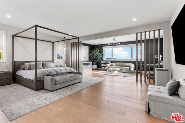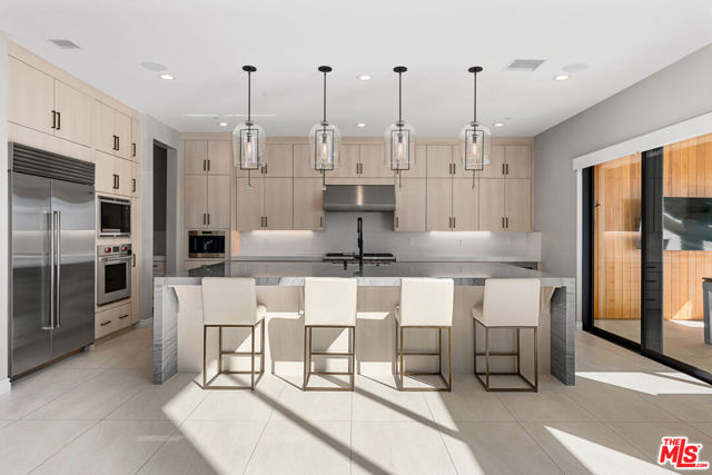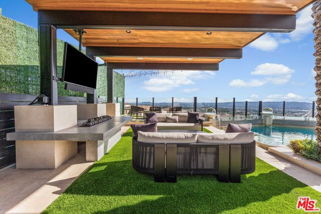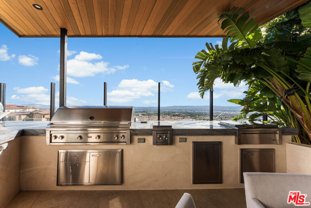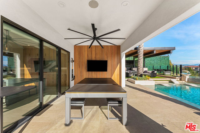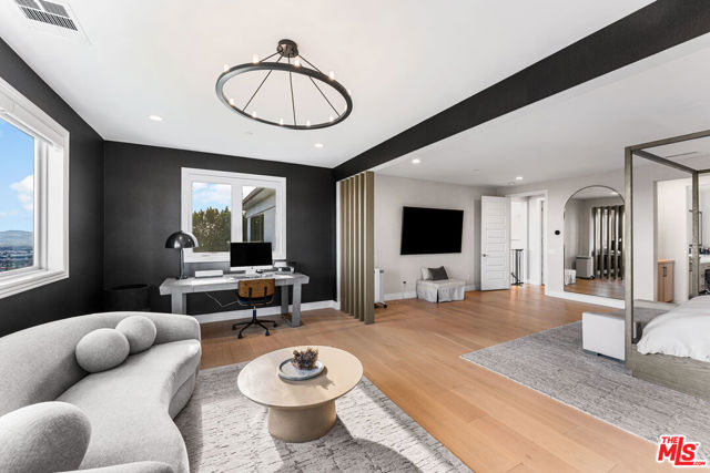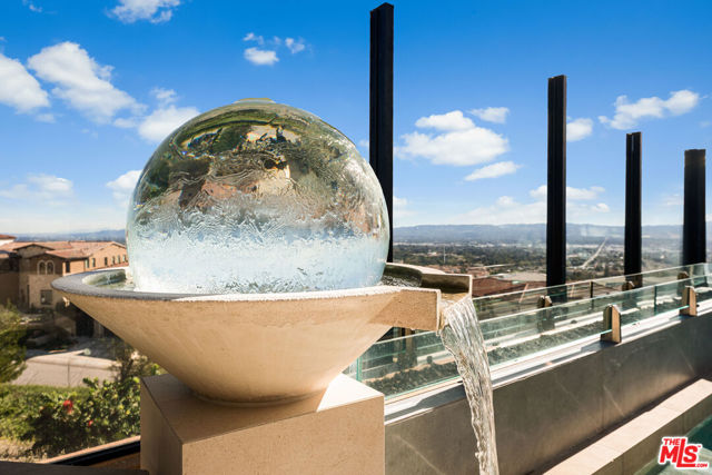 Exceptional gated Westcliffe one-of-a-kind estate offering privacy, luxury, and sweeping panoramic views of the entire San Fernando Valley. Ideally located at the end of a cul-de-sac on a 13,000 sq. ft. lot, this personal gated residence blends modern elegance with resort-style living. This two-story home features 5 bedrooms + loft and 5.5 bathrooms, including a versatile main-level suite with kitchenette. A dramatic entry showcases architectural wall paneling and a dual floating staircase. Interior highlights include European oak flooring, premium tile finishes, Phillip Jeffries wallpaper, in-ceiling speakers, and Hunter Douglas motorized window coverings throughout. The chef's kitchen is equipped with Sub-Zero and Wolf appliances, including a wine refrigerator. The expansive primary suite offers stunning valley views and a custom California Closets walk-in with integrated LED lighting and dual islands. An upstairs den provides a private movie room with projector and 120" screen. Resort-style backyard features include a saltwater pool with Baja shelf and spa, waterfalls, fire feature, two floating pergolas, outdoor TVs, and over 15 speakers. The outdoor kitchen includes a Lynx BBQ suite with premium appliances for elevated entertaining. Additional amenities include a two-car garage with sleek epoxy flooring, a converted third-car garage currently used as a luxury in-home performance gym, and an extended private driveway offering parking for up to six vehicles. Lush landscaping, commercial-grade palms, and 22-foot privacy hedges complete this private luxury retreat. A rare opportunity in one of Porter Ranch's most coveted gated communities.