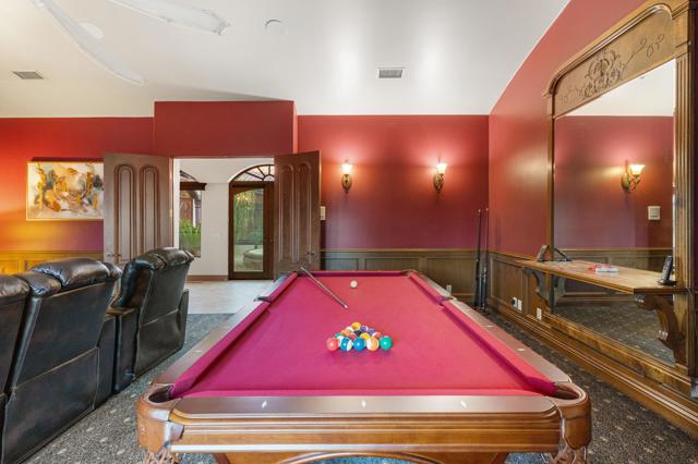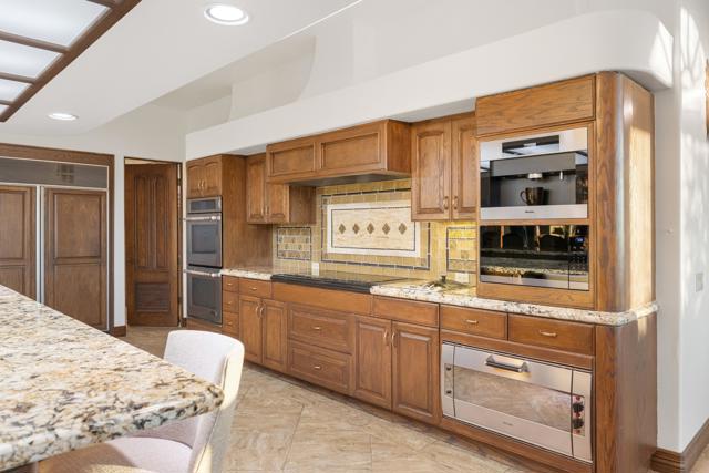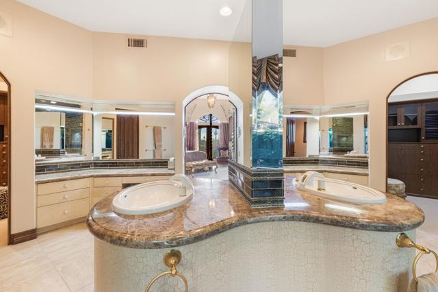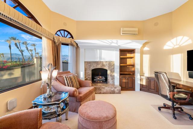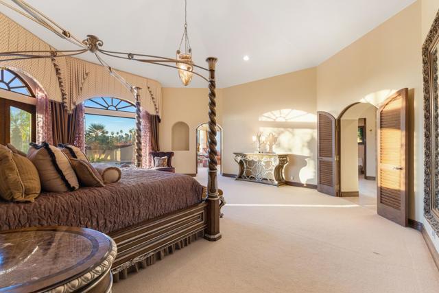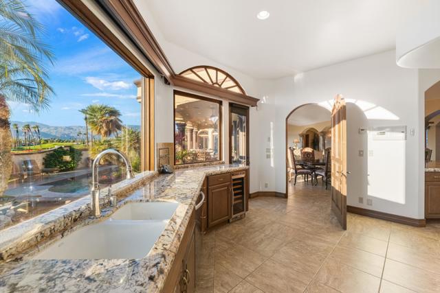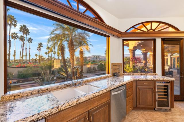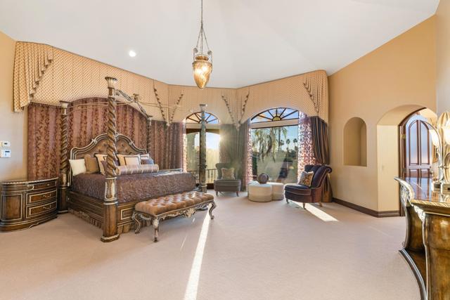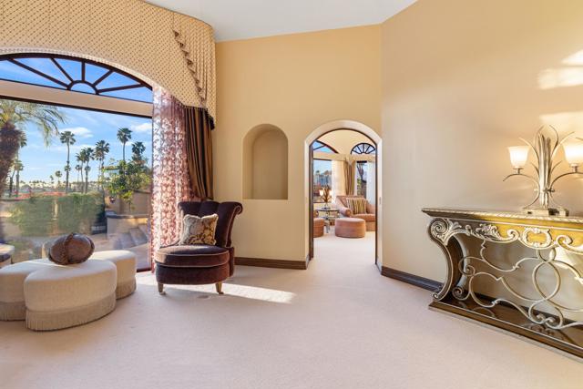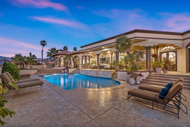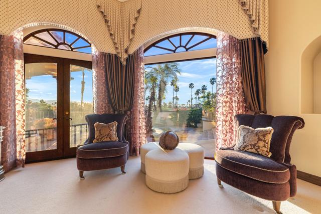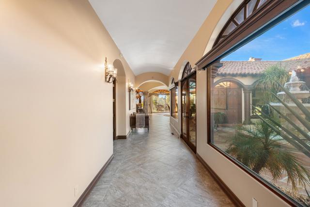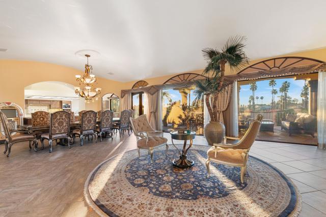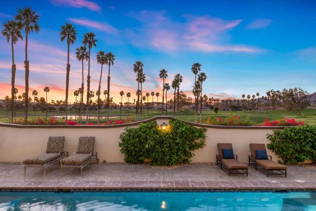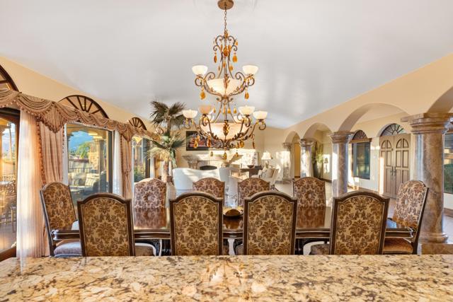 -Spectacular Mountain & Golf Course View Estate -Offering breathtaking panoramic mountain and golf course views, this remarkable 7,185 square foot custom estate is the most distinctive residence in Desert Falls Estates. Originally constructed by the developer of Desert Falls Country Club as his personal residence, the home was thoughtfully designed to capture the beauty of the surrounding views while offering exceptional scale, privacy, and luxury.Arrival begins through a private gated courtyard highlighted by a dramatic fountain that creates an elegant and tranquil first impression. Inside, the home opens to a grand great room with expansive living spaces, featuring a formal living area with fireplace and a spacious dining room designed to comfortably accommodate gatherings of ten or more guests. Walls of glass frame sweeping views of the pool, golf course, and the dramatic mountain backdrop, filling the home with natural light and creating a truly unforgettable setting.The expansive chef's kitchen is designed for both everyday living and large-scale entertaining. A generous breakfast island serves as the centerpiece, offering stunning views while providing abundant preparation space. The kitchen also includes a charming breakfast area with its own fireplace--perfect for relaxed mornings while enjoying the surrounding scenery and pool area.Outdoor living is equally impressive. The home features a large multi-level pool and spa retreat designed for entertaining, complete with an outdoor fireplace, multiple lounge areas, and exceptional privacy. Surrounded by sweeping mountain vistas and lush golf course greens, this outdoor environment offers an ideal setting for both intimate relaxation and memorable gatherings.The luxurious primary suite is a private retreat offering exceptional scale and comfort. The spa-inspired primary bath features a marble soaking tub, dual island-style vanities, an oversized walk-in shower, and two spacious walk-in closets. This suite also includes a versatile private room with fireplace, ideal for a home office, media lounge, or quiet sitting room.Additional amenities include three junior suites, a home gym, game and media suite, and an elegant wet bar, creating abundant space for both family living and entertaining. Designed with seamless indoor-outdoor flow, the residence offers an exceptional lifestyle of comfort, privacy, and desert elegance.Offered Furnished
