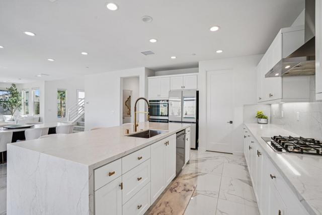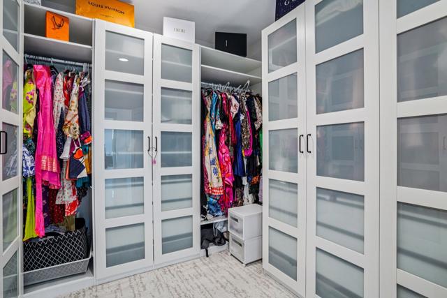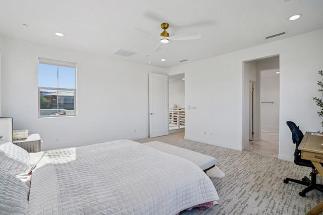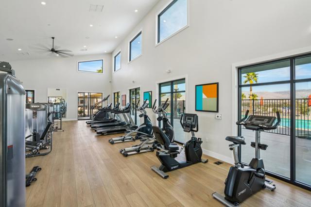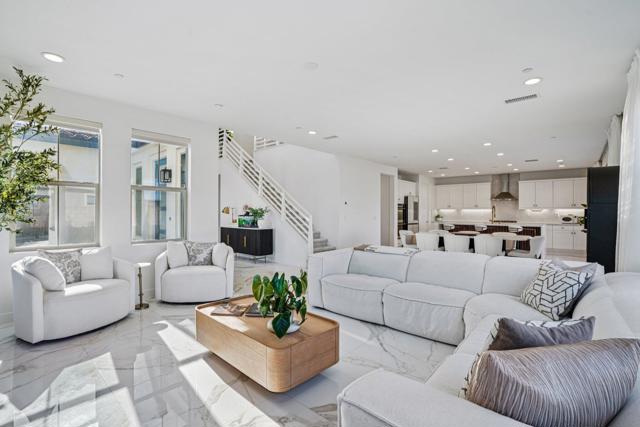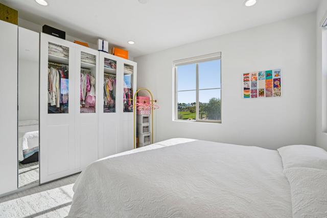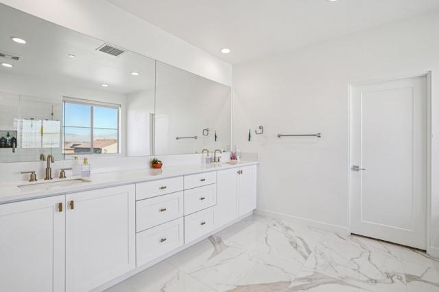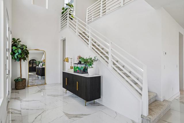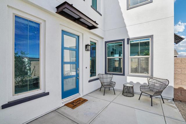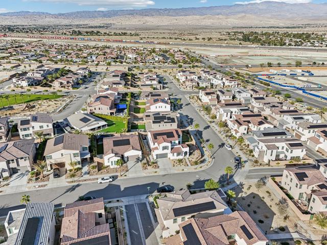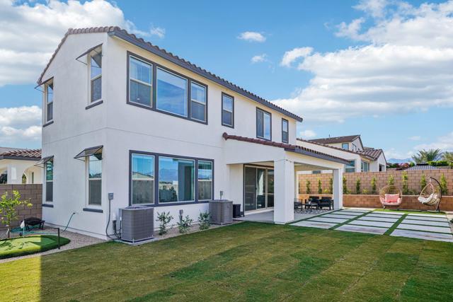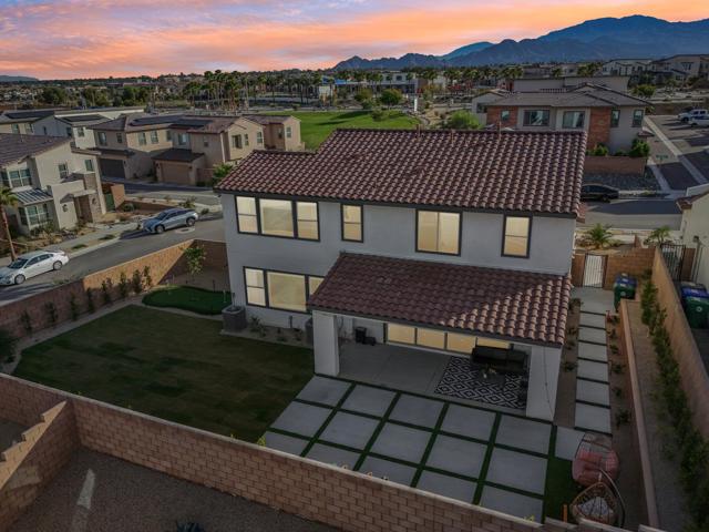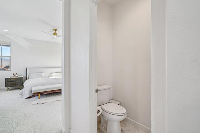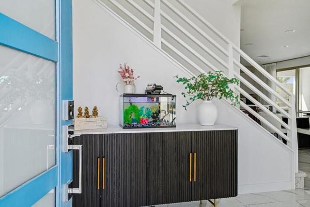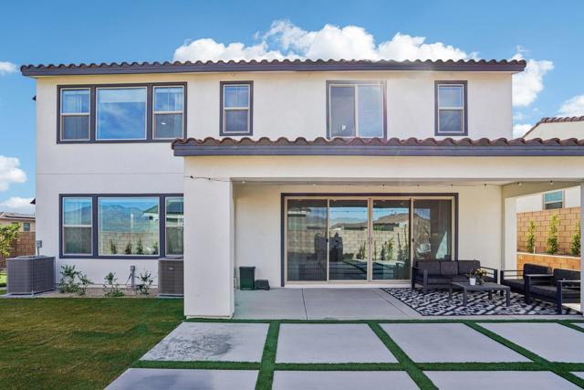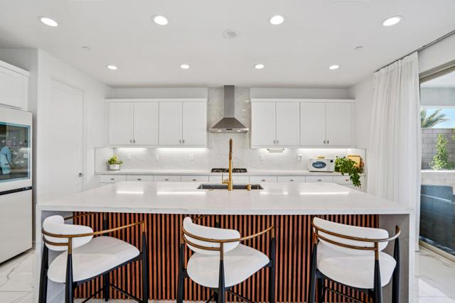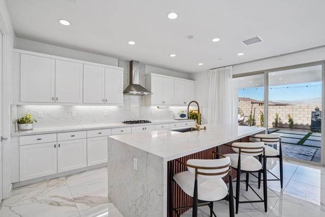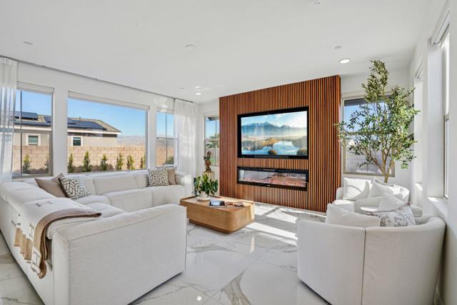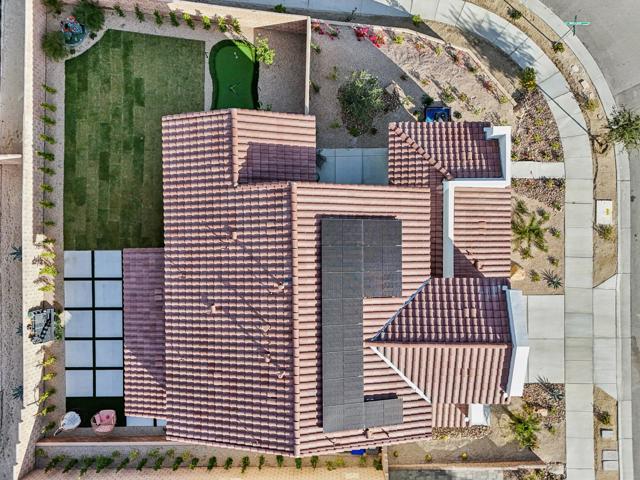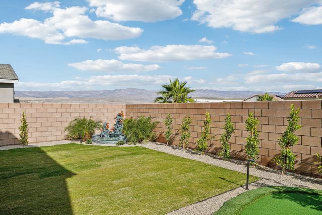 This stunning turnkey resort style home offers panoramic views and exceptional upgrades throughout. The premium Palm Desert view residence has been enhanced with over $150,000 in interior and exterior improvements, blending modern luxury with effortless desert living. The 2,700 square foot home sits on a rare 10,000 square foot elevated corner lot, providing sweeping 365 degree valley and mountain views from nearly every window. Inside, the home features new flooring, gourmet cabinetry, automatic blinds, sheer curtains, a custom TV station with an under island fireplace, upgraded garage cabinetry, a Tesla charging station, and owned solar. The spacious layout includes four bedrooms and three and a half highlighted by a private guest suite with its own en suite bath. Outdoors, the resort experience continues with a private putting green and thoughtfully placed concrete step pathways that enhance the flow and functionality of the outdoor living space.
