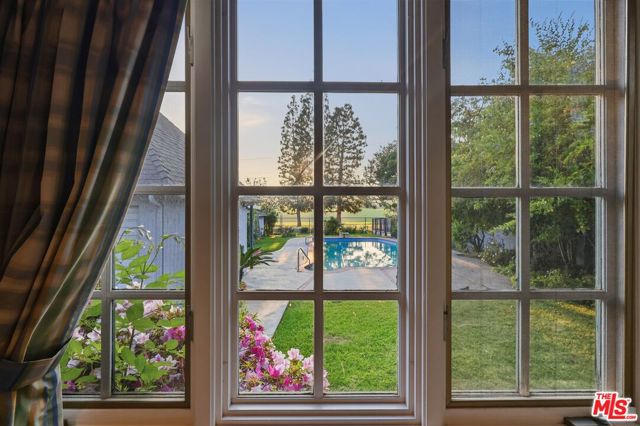 RARE OPPORTUNITY TO OWN A GOLF COURSE adjacent home for sale in Hancock Park Proper! Feel like you are in the country everyday while you enjoy spectacular sunset views across the Wilshire CC golf course from your own deep backyard! This lush lot is over 13,500 square feet! Located near the private Los Angeles Tennis Club and conveniently close to Larchmont shopping & dining, this sweet country English is approached from a wonderful pre-HPOZ allowed semi-circlular driveway directly to the front doorsteps! A long gated driveway to the rear also can accommodate more off street parking. The entry hall leads to the formal living and dining rooms in the front and then to the vaulted ceiling family/great room with fireplace, built in bookshelves--all which overlook the rear yard, pool and golf course! The large updated gourmet center island kitchen with walk-in pantry and work space is open to the family/great room with those views also! Pocket doors off the great room lead to the hallway to 2 family bedrooms & bath plus the private Primary suite with walk in closet, dressing area with vanity, bathroom with double sinks and large shower. The primary bedroom at the back has windows with romantic built-in widow seat overlooking the yard/pool/golf course. Garage functions as room with bath. Put your finishing touches onto this long owned and much loved family home. These golf course adjacent homes rarely come up for sale and as of this listing date, no other is on the public market. Located in the Hancock Park HPOZ. Active voluntary membership HOA. Trust sale as-is. Security system with cameras.