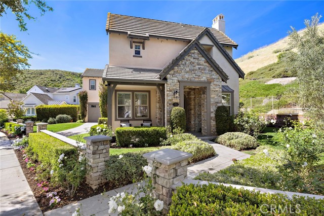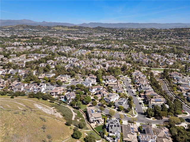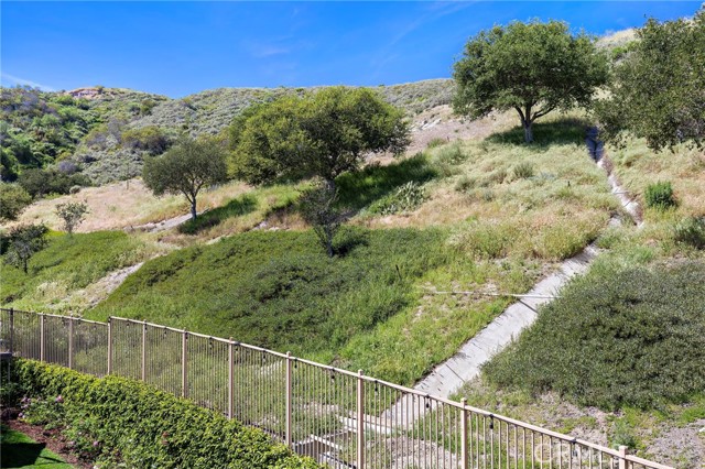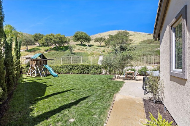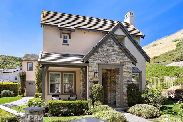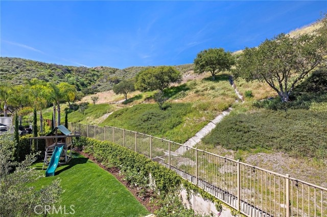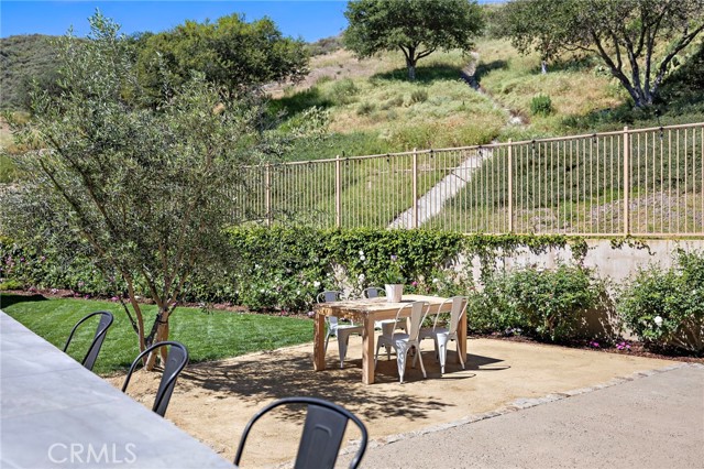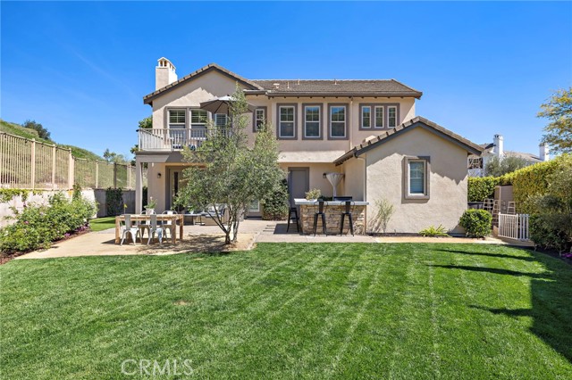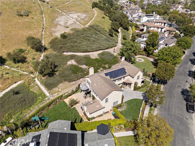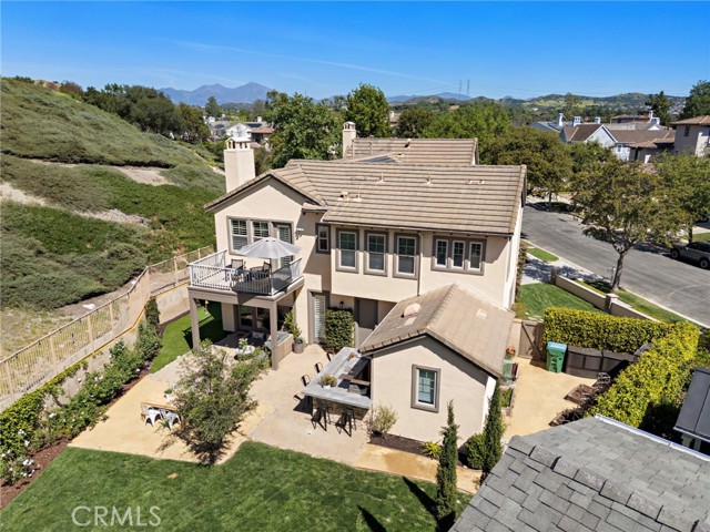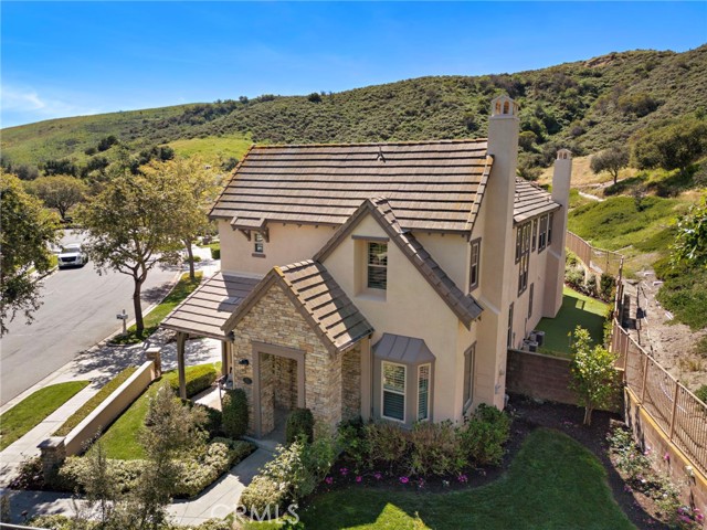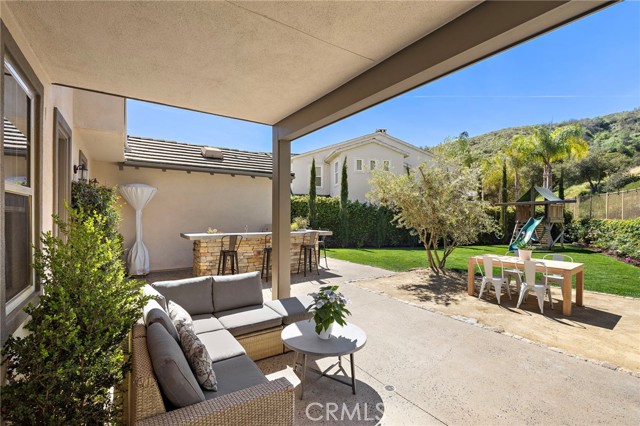 Tucked against a sweeping hillside in Terramor Village, this Evergreen home occupies one of the most private lots in Ladera Ranch - 9,504 square feet with open space directly behind, a pocket park to the side, and only one direct neighbor. A natural hillside backdrop rises beyond the fence, feeling more like an open preserve than a neighborhood lot. The wraparound yard takes full advantage: a putting green, full outdoor kitchen with BBQ, refrigerator, and separate burner, and covered patio create an immediate destination. Room for a future pool remains. A driveway, family garden, and entry porch complete the exterior. Inside, 3,313 sf of bright open living spans four bedrooms, three and a half baths, a main-level office, and a second-floor loft. Two sets of French doors connect indoors to outdoors, exceptional natural light fills both levels, and a bay window enhances the fireplace-warmed living and dining area. Extensive crown molding and detailed doorway framing add craftsmanship throughout. The kitchen anchors the main floor with an oversized marble island with generous bar seating, six-burner cooktop, farmhouse sink, custom pantry, full subway-tile backsplash, white cabinetry, and stainless appliances - flowing into a family room with fireplace, custom built-ins, and surround sound, plus a casual dining space with built-in desk and shelving. An extra-spacious mudroom, powder room with backyard access, and a tandem three-car garage with epoxy flooring complete the layout. Upstairs, the primary suite earns its footprint: hillside views from a private balcony, coffee nook, large walk-in closet, soaking tub, an exceptionally large dual-head shower, sit-down vanity, and a retreat perfect as a second office, gym, or studio. Two secondary bedrooms share a full bath with updated tile flooring; a third enjoys a private ensuite. Recent upgrades: full PEX re-pipe, tankless water heater, new garage door motor, updated faucets, fixtures and lighting throughout, full exterior repaint. Move-in ready without the asterisks. A short stroll reaches Oso Grande Elementary, Butterfly Park, Boreal Plunge, Terramor Aquatic Park, and Founders Park - home to a weekly Farmers Market and Ladera Ranch's beloved 4th of July fireworks. Miles of trails, community pools, a water park, skate park, and year-round events are all part of daily life here. Snow Bush Street is one of Terramor's most beloved and sought after neighborhoods.