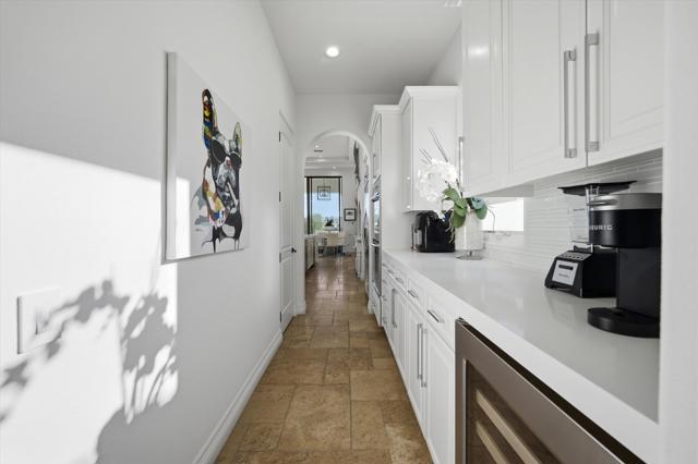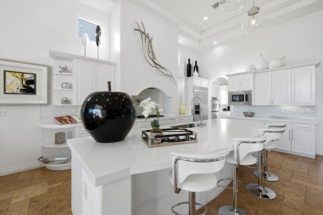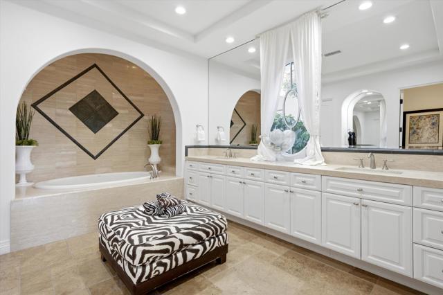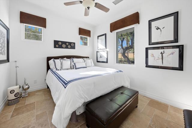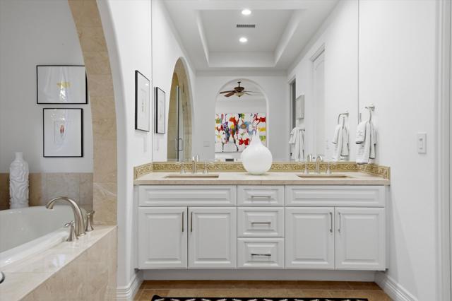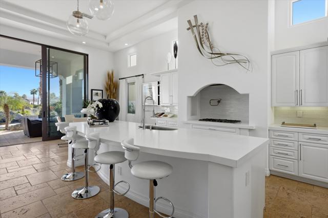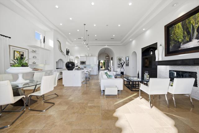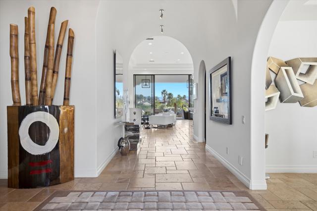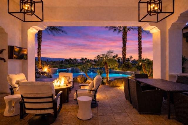 Set within the exclusive Andalusia Country Club, this exceptional 3,701 sq. ft. residence offers privacy, panoramic golf course views, and refined desert living. Designed with bespoke finishes and custom upgrades, the home features travertine flooring throughout and a thoughtfully expanded layout with 3 bedrooms, 4 bathrooms, a dedicated office, and a detached casita. The private casita includes a living area with a fireplace and kitchenette, ideal for guests. A spacious courtyard with a tranquil water feature creates a welcoming entry. Clean architectural lines and curated design elements establish a sense of understated elegance, while the home's commanding position enhances both the views and the overall sense of exclusivity. Seamless indoor-outdoor integration allows for effortless entertaining, with living spaces that open to sweeping fairway vistas. The resort-style backyard is designed for both relaxation and hosting, featuring a pool with a dramatic rock feature and cascading waterfall, a spa, fire pit, built-in BBQ, and a large covered loggia--creating multiple spaces to gather, unwind, and enjoy the desert setting. Offered furnished, this residence delivers a turnkey opportunity for those seeking a highly customized, desert home. Come live the life you've always imagined!