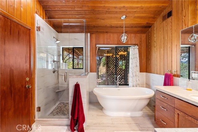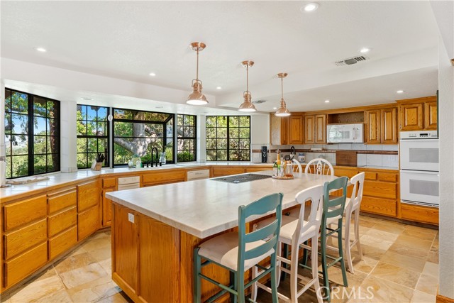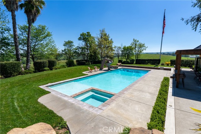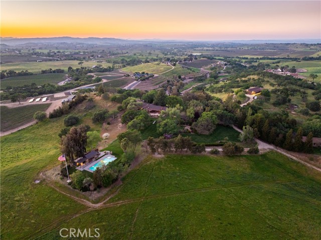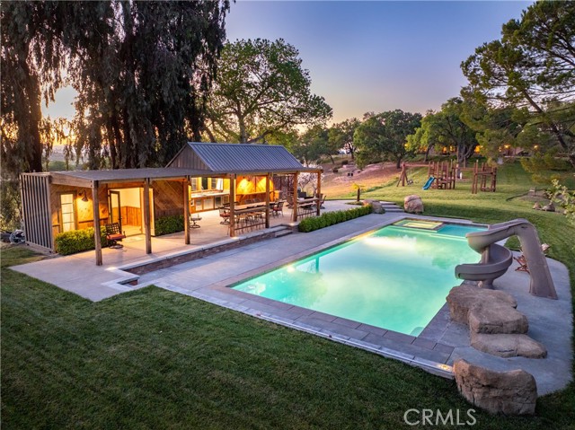 Set behind a gated, paved entry, this exceptional Templeton property offers a rare combination of expansive views, usable acreage, and thoughtfully designed spaces for entertaining. The grounds are beautifully landscaped, creating a sense of privacy while framing the surrounding countryside and capturing the natural beauty of the area. The single-level main residence (approx. 4,234± sq.ft.) is designed for both everyday living and large-scale gatherings, featuring a spacious layout with a formal dining room, living room, and a welcoming family room anchored by a rock fireplace. An additional entertainment room with a brick fireplace and bar area provides a perfect setting for hosting. The kitchen is positioned at the heart of the home, complete with a generous center island and windows overlooking the grounds and outdoor living areas. The primary suite offers a private retreat with patio access, a soaking tub, and separate shower, while three additional guest bedrooms, an office, bonus room, and laundry room provide flexibility and function. Vaulted ceilings throughout enhance the sense of space and natural light. Outdoor living is a true highlight, with a covered patio, built-in fireplace, and BBQ area designed to take full advantage of the views and open landscape. The property also features a pool and dedicated outdoor kitchen area, complete with its own bathroom, ideal for entertaining and enjoying the Central Coast lifestyle. Additional improvements include a three-car garage at the main house, a substantial 40' x 100' workshop, and a separate 2-bedroom, 2-bath guest house with its own entrance and garage, offering privacy for guests or extended living. The property is equipped with owned solar panels located on the barn, feeding both the meter servicing the well, barn, and guest house, as well as the meter servicing the main house and pool. A 60kW generator is hardwired to the property and sized to power all improvements simultaneously, providing added efficiency and reliability. A well-rounded property where views, space, and lifestyle amenities come together, creating an ideal setting for both relaxation and entertaining in the heart of Templeton.