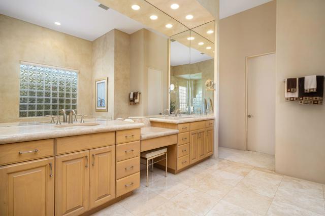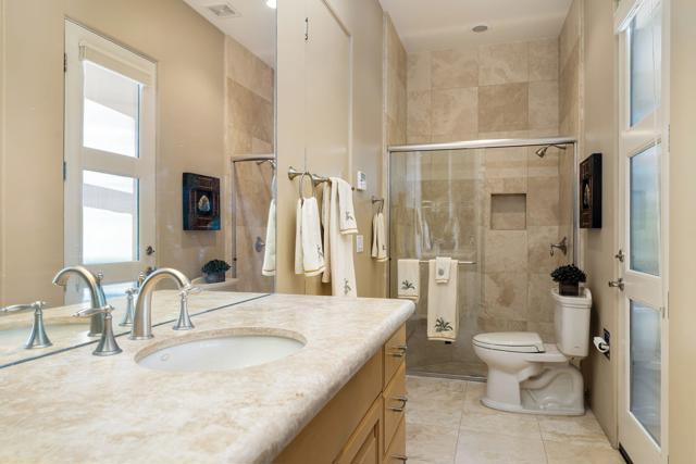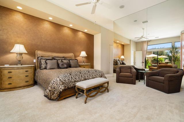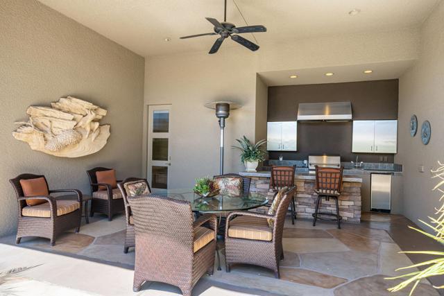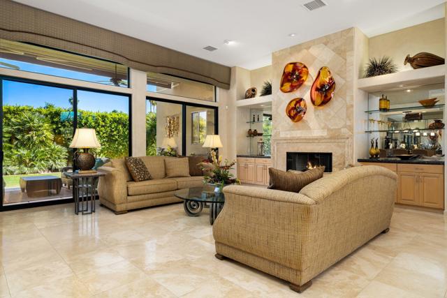 This desert contemporary residence captures the essence of refined resort-style design against a backdrop of sweeping south and west-facing mountain vistas. It is a private sanctuary and an architectural statement--where walls of glass dissolve boundaries and the landscape become part of the interior experience. The grounds create a series of outdoor spaces, lush with vibrant flowering gardens, mature palms, and fruit trees and an expanse of green lawn. Thoughtfully designed with three oversized electronic awnings creating shaded retreats, while the outdoor kitchen and bar invite effortless entertainment beneath open skies. In addition, the focal point, a striking saltwater pool and elevated spa are accented by a sheer descent water feature, amidst the sweeping mountain views. Inside, soaring 12-foot ceilings and an expansive great room establish a sense of volume and calm. Natural light pours in from every direction, animating the interiors and reinforcing the home's connection to its surroundings. The covered patio extends the living space, offering a fluid transition between indoors and out. The primary suite is generous in scale and quietly luxurious, featuring a spa-inspired bath with dual showers, a soaking tub, dual walk-in closets, and separate water closets, one appointed with a bidet. Two additional ensuite bedrooms open to private patios, while a detached-style casita with its own entrance, kitchenette, and bath provides an elegant accommodation for guests, all with captivating mountain views. Completing the residence is a three-car garage finished with epoxy flooring, climate control, and abundant storage. Set within a prestigious 24-hour guard-gated community, this home is an elevated expression of desert living. Call for your private showing today!