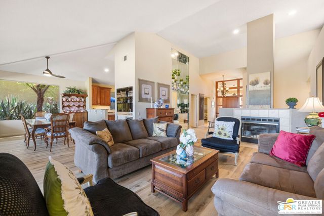 ELEVATED views. WIDE OPEN skies. FABULOUS Rancho Mirage living. Set within the private gated enclave of Mirage Cove, this 5 bedroom, 3 bath residence delivers unobstructed mountain and valley vistas from a prized end of cul de sac setting, notable for its flat lot and just one immediate neighbor. A true sense of arrival begins at the gated courtyard and custom Brazilian mahogany front door. Inside, vaulted ceilings and a dramatic fireplace set the tone in the living room, while clerestory windows frame the space and a series of sliders open to covered patio, pool terrace, and multiple outdoor conversation areas designed for relaxed desert living. The gourmet kitchen with oversized island opens to a dining area with wet bar and wine fridge on one side and a breakfast area with built in buffet on the other, plus direct access to a side patio with barbecue. Bedrooms are nicely separated, creating the feel of two primary suites on opposite ends of the home. The main primary suite opens to the pool terrace and features a walk in closet and separate tub and bath. Junior Ensuite 2 enjoys vaulted ceilings, an oversized walk in closet, and a private bath with separate tub and shower. Guest bedrooms 3 and 4 are positioned together and share a full bath with skylight, with bedroom 3 opening to its own private patio, while bedroom 5 currently serves as a den. Direct garage access adds convenience, and a utility room is thoughtfully positioned off the central hall. Pride of ownership is felt throughout and OWNED SOLAR adds to the appeal. Mirage Cove, with just 69 homes, offers a rare blend of privacy and amenities including pools, tennis, and pickleball, all in a peaceful mountainside setting.