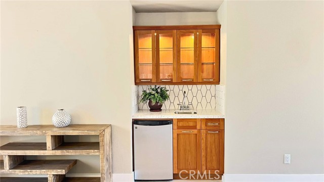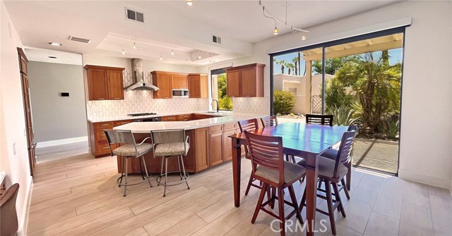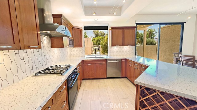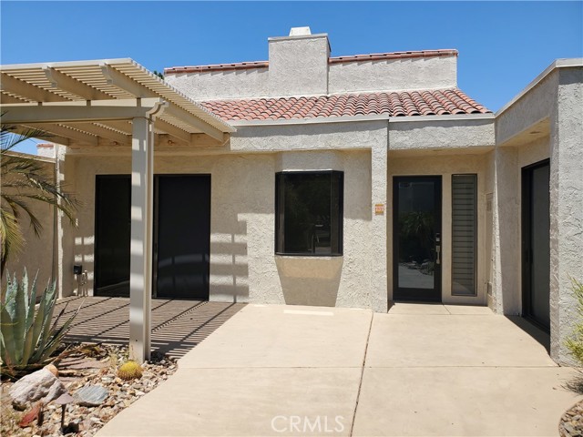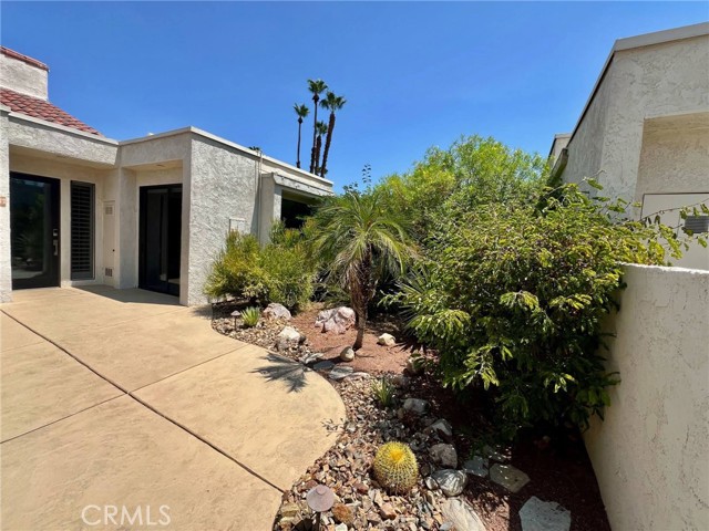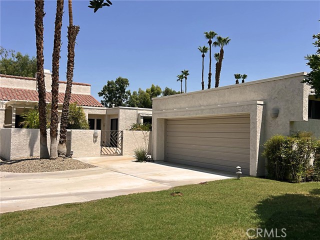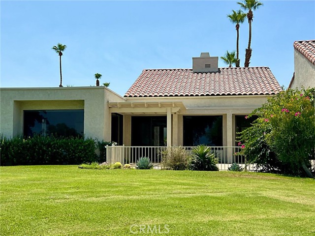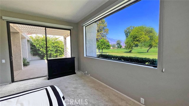 Quietly tucked away on a cul-de-sac within Mission Hills Country Club, this two bed/two full bath condo offers an abundance of upgrades. A private luxury getaway with peek-a-boo mountain views and uninterrupted vistas of the famed Dinah Shore course. Inside the gated front courtyard enjoy a professionally landscaped desert oasis. The interior features updated wood-look ceramic flooring and high-gloss 6” real wood trim. A newly remodeled open kitchen with stunning quartz countertops and modern tile backsplash, new double sink with touch on/off faucet, dimmable LED lighting, plus a 42” sub-zero paneled refrigerator, Dacor gas cooktop and new Samsung Flex Duo oven - its two separate ovens in one. Living room has a matching wet bar area with sink and mini fridge. A slider opens off the dining area to the courtyard for morning coffee. New Hunter Douglas smart powered designer roller shades in main living, dining and kitchen areas and blackout shades in bedrooms. Thoughtful upgrades and contemporary finishes can be found throughout. Generous master suite has amazing views and a spa bath featuring custom dual marble-top vanities (extra tall for the Gents) and a large tub/shower. Guest bedroom and bath have consistent highly upgraded finishes, lighting and closet organizers. A large, fenced rear patio offers late afternoon shade and plenty of entertaining space along with fabulous views of hole #11, all safely outside the range of an errant golfer. For energy savings year round, the unit has a new Lennox 28 SEER HVAC system. The most energy efficient AC unit available anywhere. Large two car + golf cart garage has built-in storage. Community pool and spa nearby. No steps or stairs. Updated 2121 land lease is paid. HOA road resurfaced in fall of 2024. Near shopping (6 minutes to Costco), dining, Eisenhower Hospital & the new Disney Cotino development. Mission Hills Country Club offers three championship golf courses, expansive clubhouse, restaurants, fitness center, tennis, pickleball, croquet and bocci. Membership required. Furnishings are available.