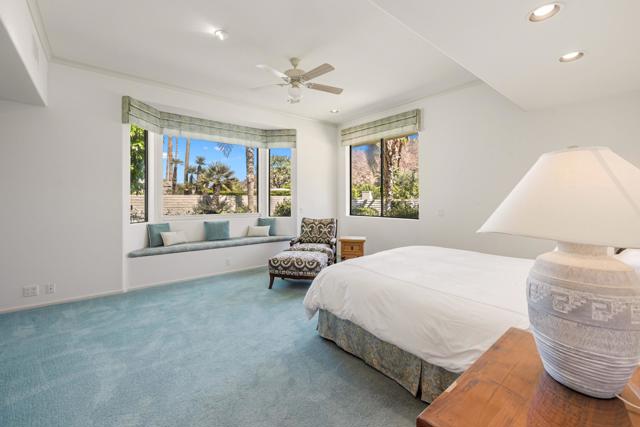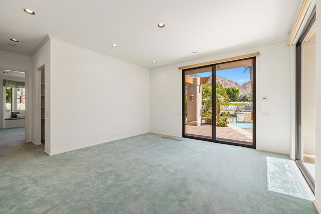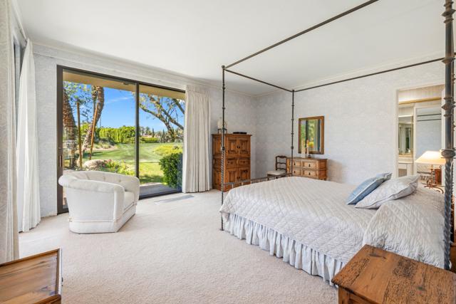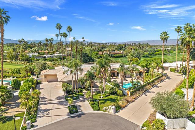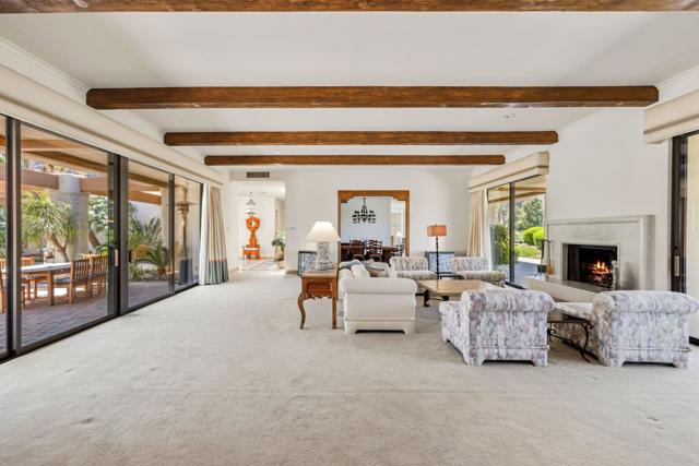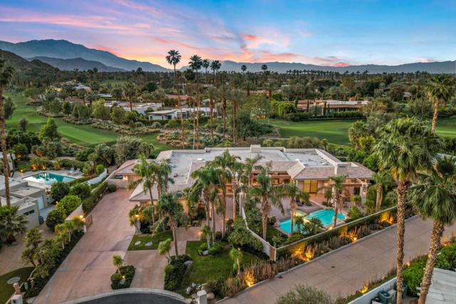 Ideally positioned near the end of coveted Topaz Lane, within the gates of Eldorado Country Club, this residence offers a rare combination of premier location, dramatic mountain and fairway views, and sought-after privacy. A beamed entry walkway creates an strong first impression, leading to a south-facing outdoor setting where magnificent mountain views, mature palms, and lush desert landscaping define the experience. The pool patio is designed for both relaxation and entertaining-featuring a cascading stacked stone waterfall, fire pit, fireplace, paver decking, and a covered patio framed by columns and beams. Inside, the home showcases grand, open living spaces, with high-beamed ceilings and incredible views, that flow effortlessly from the living room to the formal dining room and into the family room and kitchen. Dual wet bars anchor both ends of the home. The primary wing is uniquely versatile, offering the option of dual primary bedrooms or a spacious bedroom paired with a private office or retreat. The primary bath includes his/her vanity areas, shower and tub, and 2 walk-in closets. Two additional guest suites are thoughtfully positioned for privacy and comfort. Outdoor living continues along the expansive fairway patio, where long, unobstructed views down the 6th fairway are paired with an elevated sense of seclusion in between the 5th Green & 6th Tees. For car enthusiasts, the property offers outstanding capacity with a long private driveway, triple car garage, and a rare dual-sided double golf cart garage. Timeless in scale, and exceptional in its setting, this home presents a compelling opportunity to reimagine into a modern desert estate within one of Indian Wells most prestigious Clubs.