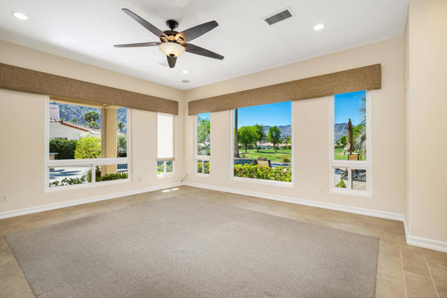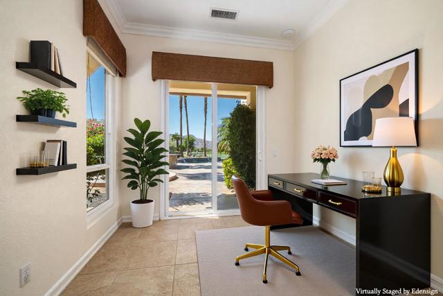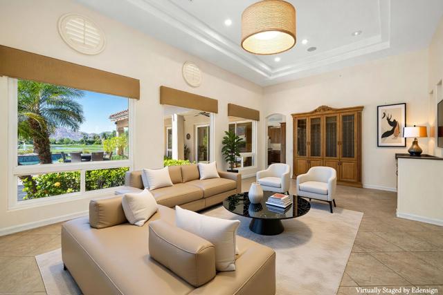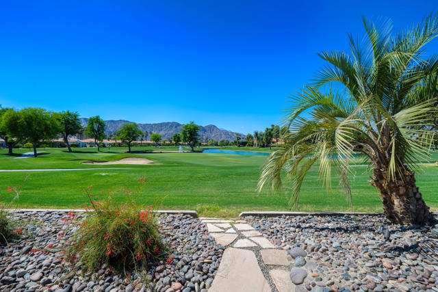 Perfectly positioned within The Citrus Club, this beautifully upgraded Trovita 2 residence offers refined desert living on an oversized 13,000+ square foot premium lot. Enjoy your morning coffee on your expansive patio with sweeping double fairway views and panoramic vistas of the Santa Rosa Mountains. At the heart of the home, a custom-renovated kitchen with stainless steel appliances and a walk-in pantry opens to the family room, while a wall of glass sliders invites the outdoors in. Designed with comfort and flexibility in mind, each bedroom offers its own en suite bath, ideal for visiting guests. The third guest bedroom is currently configured as an office with a built-in workspace. The property has been meticulously maintained and boasts remote controlled window coverings and exterior retractable awnings. The formal living and dining area feature a custom built-in, temperature-controlled wine cabinet. Multiple seating and gathering areas create the perfect environment for hosting friends or simply enjoying the peaceful desert surroundings. Enjoy your private gazebo in the afternoons or take in the sunset by your firepit in the evenings overlooking both the 13th and 14th fairways of the Pete Dye designed golf course. A rare opportunity to own one of the most desirable view properties in The Citrus. Close proximity to the Desert International Horse Park, SilverRock Golf Course, Old Town La Quinta, El Dorado and Empire Polo, Thermal Race Track, Thermal Airport and more. HOA inc cable/wifi, front landscaping, 24/7 guard gate.