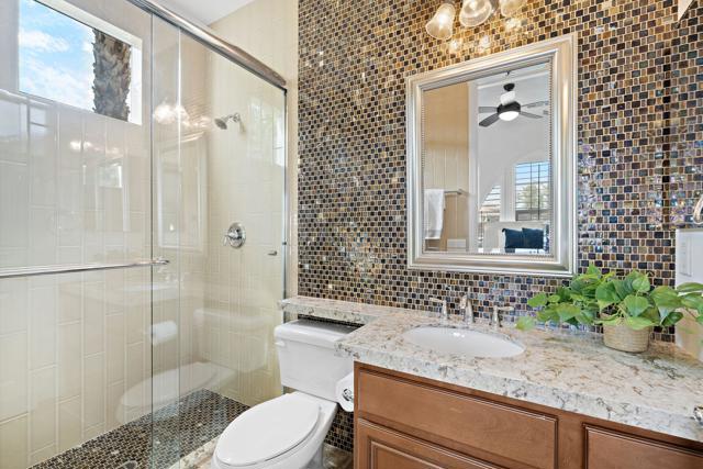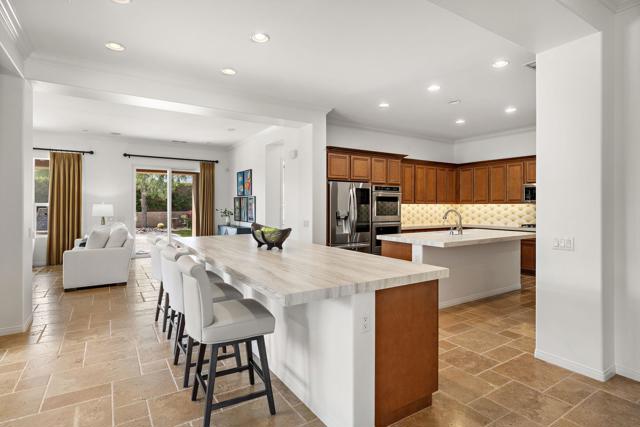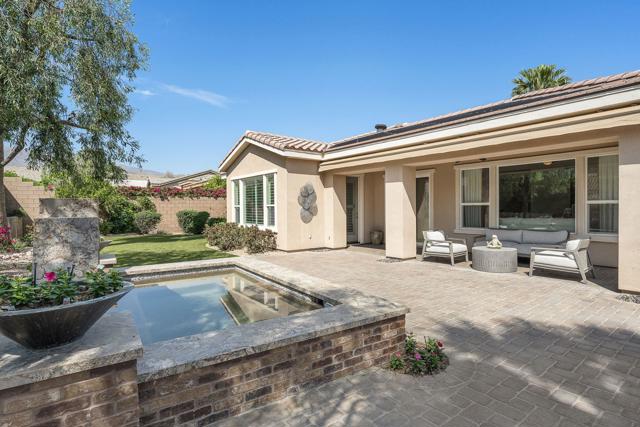 Experience exceptional desert living within the prestigious golf community of Trilogy Golf Club in La Quinta. Ideally situated on a quiet cul-de-sac setting offering added privacy, this impeccably maintained home is presented in model-like condition and offers a spacious and thoughtfully designed 4-bedroom, 4-bathroom layout, including a private 2-bedroom casita--perfect for guests, extended family, or flexible living. The main residence features an open and airy floor plan with an oversized living room, formal dining area, and an expansive den--ideal for a home office or media space. The kitchen is designed for both everyday living and entertaining, complete with stainless steel appliances, a generous island, and seamless flow into the main living areas. The primary suite is a true retreat, boasting two walk-in closets--one with custom built-ins that can easily double as a private office or dressing space--along with a spacious en-suite bath. Throughout the home, you'll find upgraded flooring, crown molding, custom window coverings, and shutters, all adding to the elevated feel. Even the garage is enhanced with upgraded flooring and an enclosed storage closet for added functionality. The detached casita offers incredible versatility with two bedrooms, each with closets, or the option to configure one as a living area--perfect for a private guest suite.Step outside to enjoy a beautifully designed backyard featuring brick pavers, remote-controlled awnings, a large spa with fountains and jets, a built-in BBQ, outdoor fire pit, grassy lawn area, and stunning mountain views--creating the ultimate desert retreat.Residents of Trilogy Golf Club at La Quinta enjoy access to golf, dining, fitness, and an active lifestyle community (membership options vary). Additional highlights include an owned water softening system, and the home is being offered furnished per inventory list.