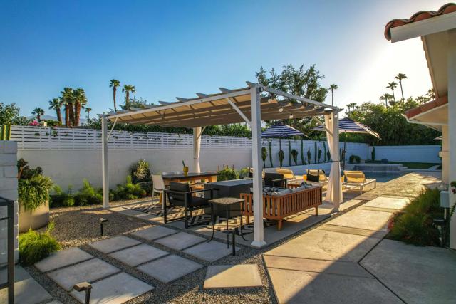 SUN SUN SUN, South Facing: Welcome to Indian Wells, a premier desert city known for its secure, upscale lifestyle & exclusive resident benefits. This beautifully reimagined gated home blends Mediterranean & Mid-Century Modern design in the heart of the Coachella Valley. Enjoy a small gated community with LOW HOA, peaceful streets & dark desert skies just minutes from world-class golf, tennis, pickleball, hiking, dining, & shopping.Fully remodeled in 2023, this custom residence underwent a complete renovation & is move-in ready. Wall-to-wall tile flows seamlessly indoors & out. The chef's kitchen features premium Fisher & Paykel stainless steel appliances, new cabinetry, & generous prep space. All bathrooms have been newly redesigned, including a spa-inspired primary suite with expanded custom closet/dressing room & unique indoor-outdoor bath access.The heated saltwater pool & raised spa were updated with new equipment. Fresh landscaping includes citrus trees, raised garden beds, pergola, outdoor shower, & built-in grill--creating a private resort-style setting ideal for entertaining.Designed for gathering, the open-concept kitchen connects to a sun-filled breakfast nook & formal dining area. The sunken living room with fireplace invites evening cocktails & relaxed conversation. Spacious guest bedrooms provide comfort & privacy.Located minutes from El Paseo, the Indian Wells Tennis Garden, & The Living Desert, this home offers exceptional access to the best of the desert. Indian Wells residents enjoy exclusive benefits including discounted golf at the Indian Wells Golf Resort, savings at select hotels & restaurants, access to hotel fitness facilities, & resident-only events.More than a home--this is a lifestyle investment in one of the desert's most desirable communities.