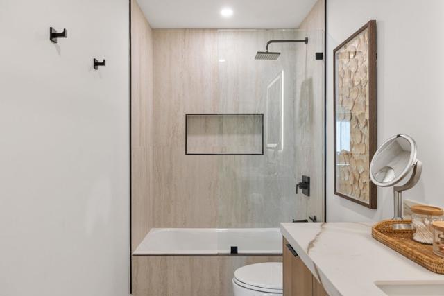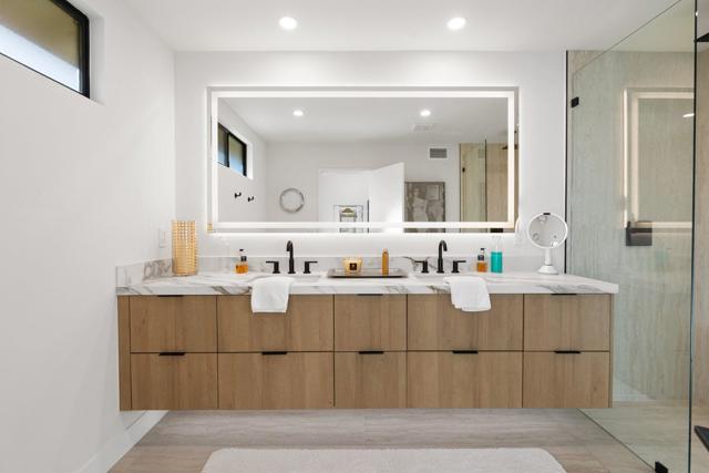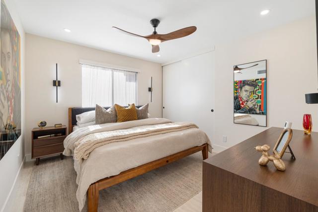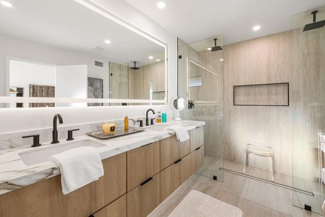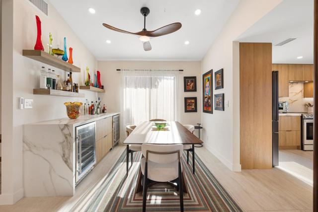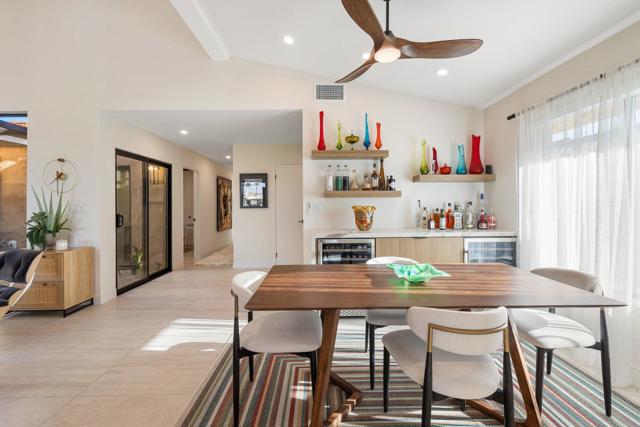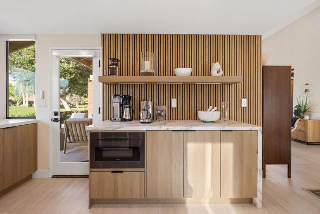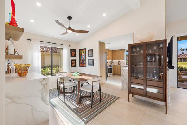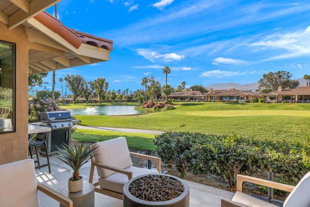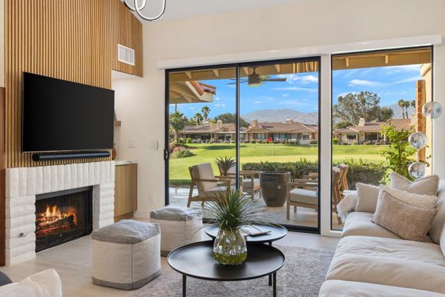 Premium golf course location in Monterey Country Club showcasing panoramic south-facing mountain and water views. This fully redesigned condo is flooded with natural light and offers a seamless blend of modern sophistication and timeless European-inspired design.Featuring 2 bedrooms plus a den and 2 fully remodeled bathrooms, this lock-and-leave retreat is thoughtfully curated with soft, organic tones that create a warm yet refined aesthetic throughout.Upon entry, you're welcomed by expansive 24x48 porcelain tile that flows continuously through the interior and out onto the patio, creating a clean, cohesive indoor-outdoor living experience. Brand new windows and sliders are complemented by custom motorized shades, while the vaulted living room ceilings add volume and an airy sense of space.The kitchen is both stylish and functional, complete with soft-close cabinetry, Italian countertops and matching backsplash, brand new appliances, and abundant storage.Additional upgrades include a custom dry bar with dual wine refrigerators, floating bathroom vanities, backlit LED mirrors, a new water heater and AC unit, epoxy-coated garage flooring, and a luxurious primary suite with a custom walk-in shower featuring dual ceiling-mounted rain heads. Ideally located in the heart of the Coachella Valley, Monterey Country Club offers convenient access to El Paseo's premier shopping and dining, as well as world-class golf and entertainment. Residents of Monterey Country Club enjoy a clubhouse, fitness center, 27 holes of Ted Robinson-designed golf, 6 tennis courts, 33 pickle ball courts, 4 lane bocce ball court, and 37 pools and spas.