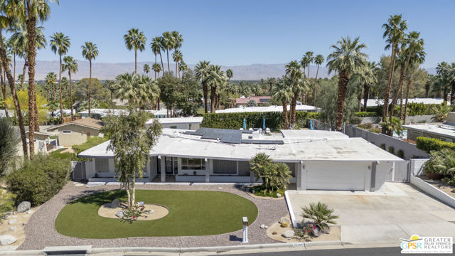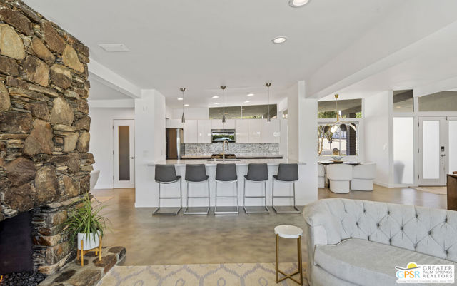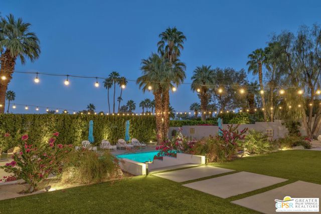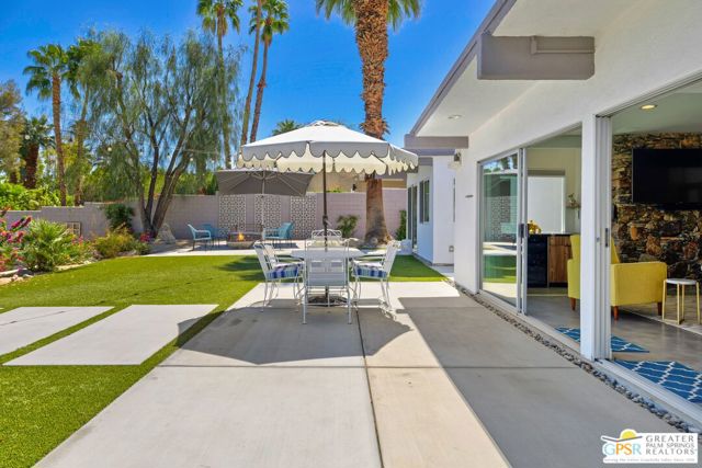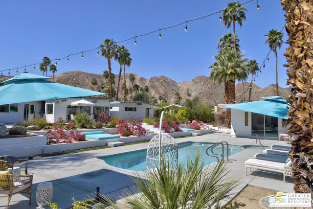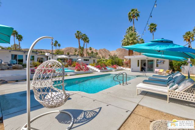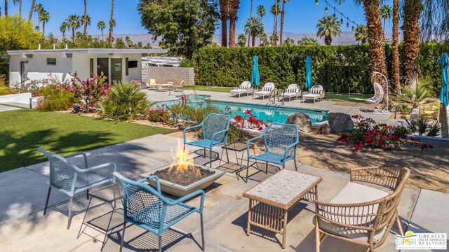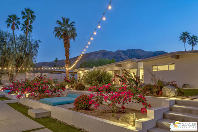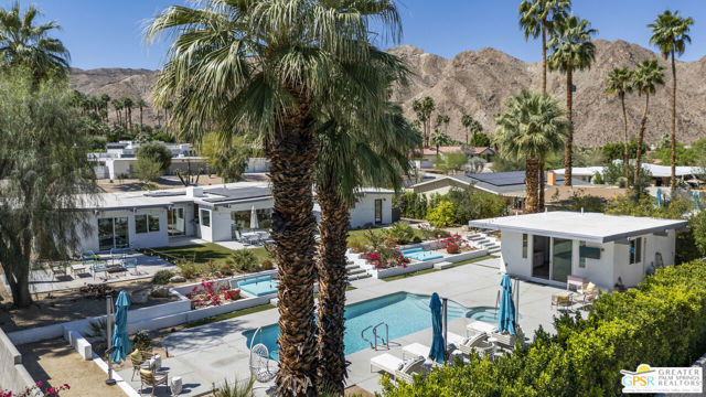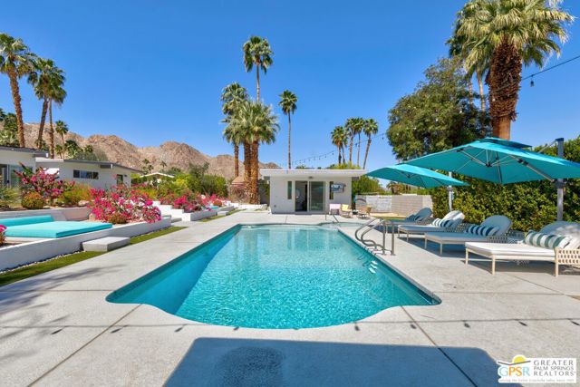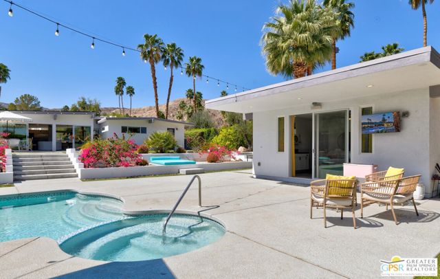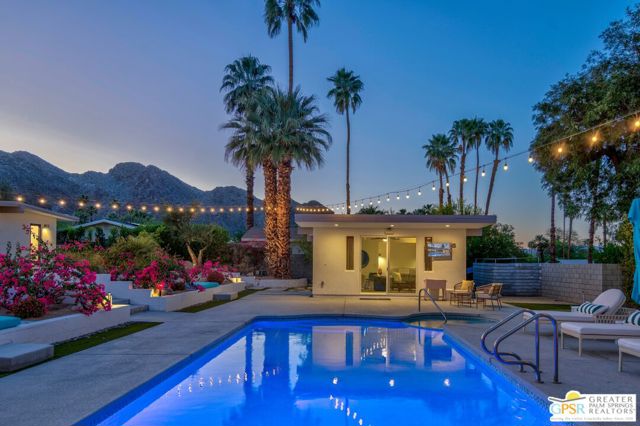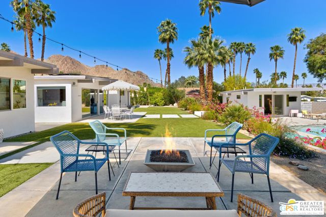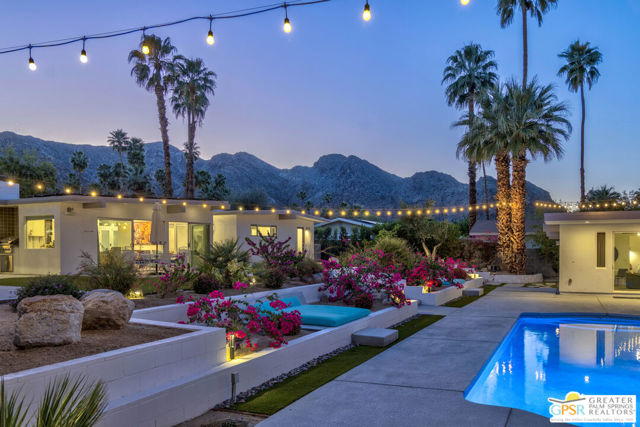 This beautifully reimagined mid-century residence in prestigious Magnesia Falls Cove captures the essence of classic desert modernism, stunning mountain views with the ultimate resort-like setting! Inside, light-filled spaces and an open-concept floor plan create effortless flow for both everyday living and entertaining, seamlessly connecting to the outdoor retreat. Main house includes 4 bedrooms- 2 en suites with access to backyard, 3 updated bathrooms, polished concrete floors throughout, and updated kitchen. Relax and unwind in the mid-century estate on an oversized lot. Take a dip in the sparkling pebble tech pool or spa while enjoying the magnificent surrounding views or practice your golf game on the 70 ft putting green. Marvel at the exquisite sunsets alongside the firepit, or while dining al fresco. A detached casita provides flexible space ideal for guests, a private office, or studio with a fully equipped kitchenette, king sized bed, living area and bathroom. This home is equipped with 10.22 KW solar system for low cost, eco-friendly living! Furnishings are offered per inventory, creating a seamless turnkey desert retreat that allows buyers to move in and immediately enjoy the lifestyle this estate provides. Just minutes from the shopping and dining of The River or El Paseo Shopping District, as well as world-class golf or hiking, this exceptional property offers a rare opportunity to own a true desert retreat where style, privacy, and location meet!