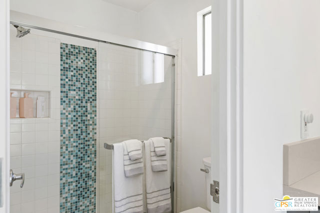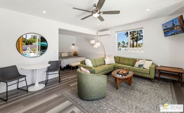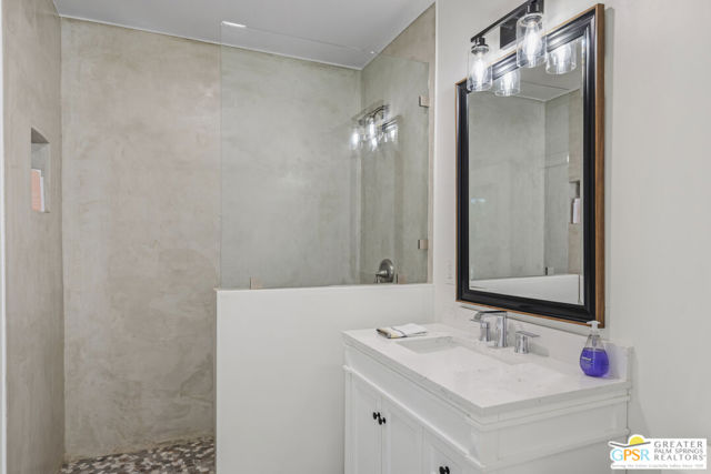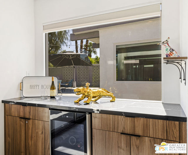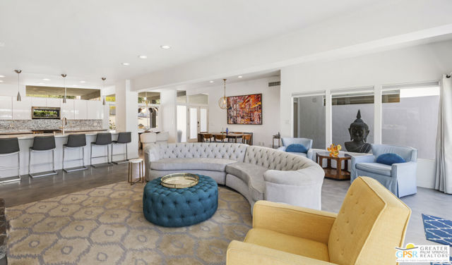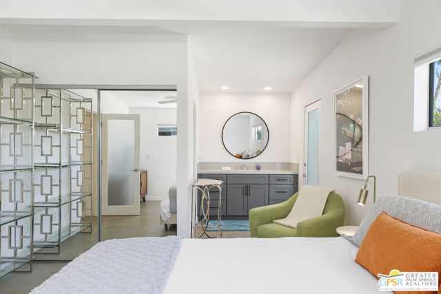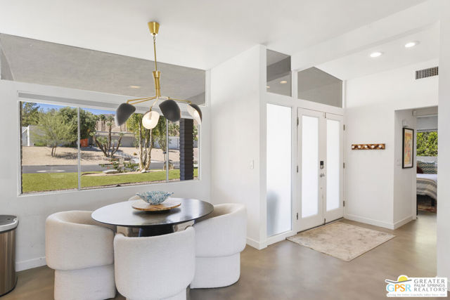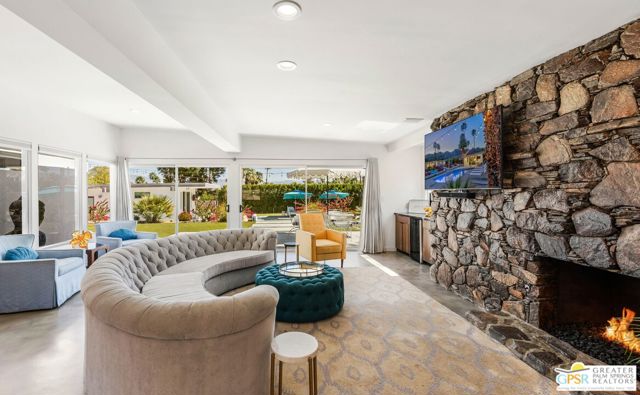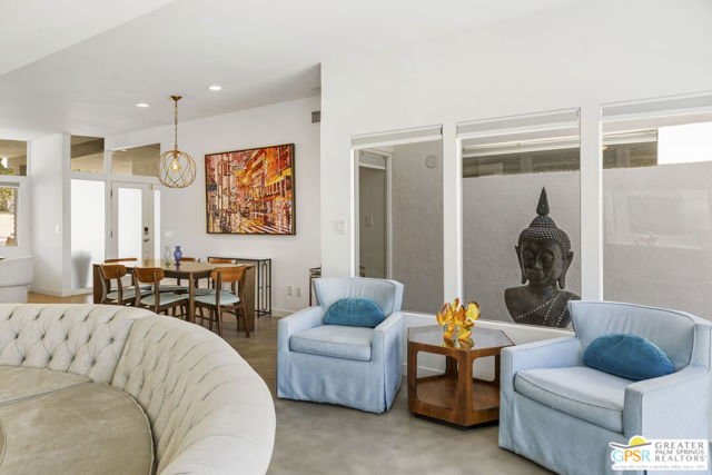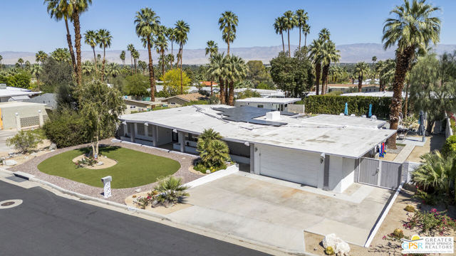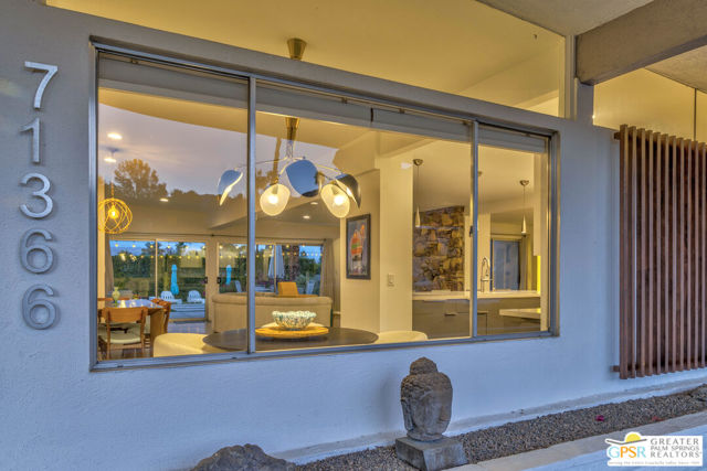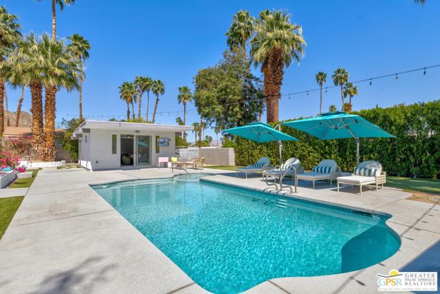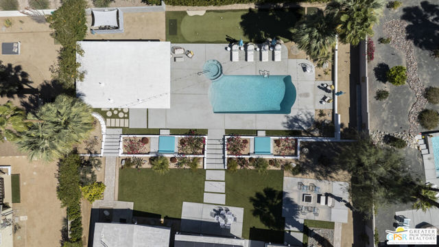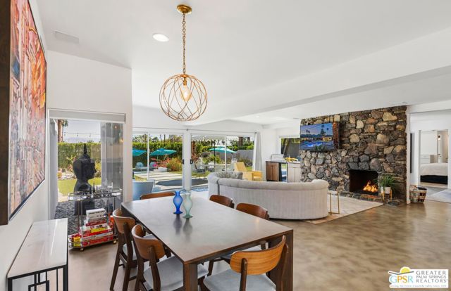 This beautifully reimagined mid-century residence in prestigious Magnesia Falls Cove captures the essence of classic desert modernism, stunning mountain views with the ultimate resort-like setting! Inside, light-filled spaces and an open-concept floor plan create effortless flow for both everyday living and entertaining, seamlessly connecting to the outdoor retreat. Main house includes 4 bedrooms- 2 en suites with access to backyard, 3 updated bathrooms, polished concrete floors throughout, and updated kitchen. Relax and unwind in the mid-century estate on an oversized lot. Take a dip in the sparkling pebble tech pool or spa while enjoying the magnificent surrounding views or practice your golf game on the 70 ft putting green. Marvel at the exquisite sunsets alongside the firepit, or while dining al fresco. A detached casita provides flexible space ideal for guests, a private office, or studio with a fully equipped kitchenette, king sized bed, living area and bathroom. This home is equipped with 10.22 KW solar system for low cost, eco-friendly living! Furnishings are offered per inventory, creating a seamless turnkey desert retreat that allows buyers to move in and immediately enjoy the lifestyle this estate provides. Just minutes from the shopping and dining of The River or El Paseo Shopping District, as well as world-class golf or hiking, this exceptional property offers a rare opportunity to own a true desert retreat where style, privacy, and location meet!