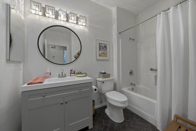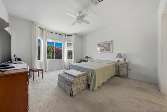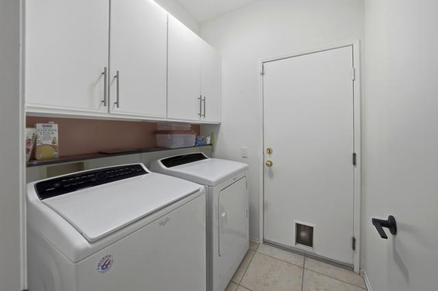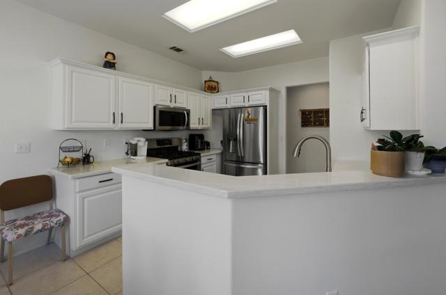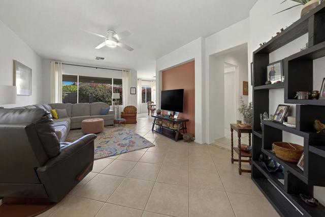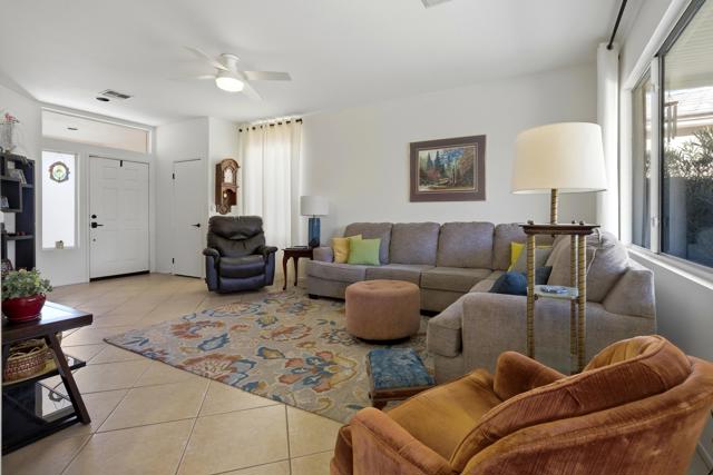 Sun City Palm Desert - Barbados. Ideally located just a short distance to the Mountain View Clubhouse and the convenient golf cart gate with access to Stater Bros. shopping center, this well-maintained Barbados model offers comfort, style, and an exceptional location. The home's inviting curb appeal is enhanced by beautiful palm trees and desert landscaping. Step outside to the north-facing rear yard featuring an extended tile patio, alumawood patio cover, and lush desert landscaping--perfect for relaxing or entertaining in the desert climate. Inside, tile flooring runs throughout all but the bedroms, creating a clean and cohesive look. The open living and dining areas are filled with natural light, with a large dining window and sliding glass door providing seamless access to the north-facing rear yard. The kitchen is tastefully updated with stainless steel LG appliances and quartz countertops, offering both functionality and modern appeal. The spacious primary suite features a bay window and a walk-in closet with custom built-in storage. Its ensuite bathroom has been upgraded with 12x24 tile laid offset, a sitting vanity, updated sink, fixtures, lighting, and a stall shower with textured glass doors. The guest bedroom includes mirrored wardrobe doors, while the updated guest bathroom showcases tile laid in a stylish herringbone pattern along with an upgraded vanity, sink, mirror, and lighting. Additional upgrades include a laundry room with built-in storage, a Lennox AC system (new in 2017), and upgraded ceiling fans and door hardware throughout. Enjoy all that Sun City Palm Desert has to offer, including golf, clubhouses, fitness centers, dining, and a vibrant social lifestyle.