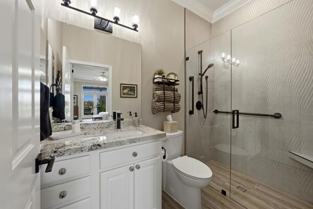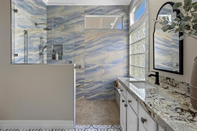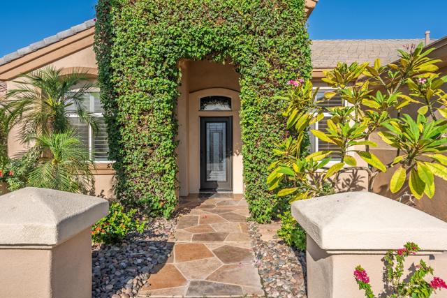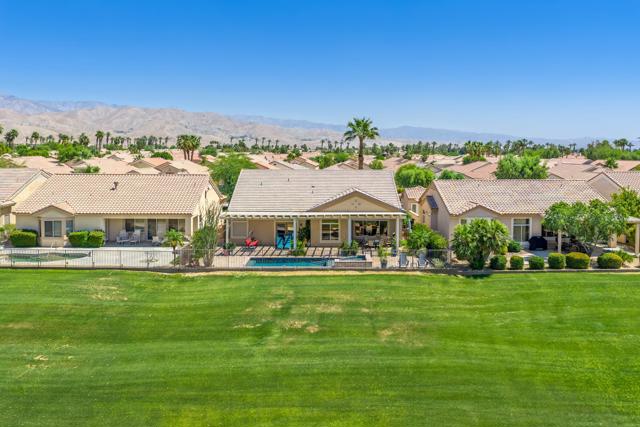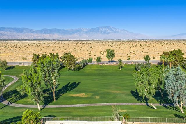 Sun City Palm Desert - Reimagined Casablanca. Perched above the golf course, this extensively upgraded Casablanca offers breathtaking panoramic views of the fairway and surrounding mountains, including the iconic peaks of Mt. San Jacinto, Mt. San Gorgonio, and Mt. Santa Rosa. The spectacular rear yard is designed for resort-style living, featuring a saltwater PebbleTec pool & spa with elegant glass tile accents, an expansive paver patio, alumawood patio cover, and electric solar shades--perfect for relaxing or entertaining while taking in the views. Exceptional curb appeal is highlighted by a leaded glass front door, decorative concrete, updated paint scheme, and lush desert landscaping with artificial turf. Inside, the home has been thoughtfully reimagined to create a bright, open environment. Wood-look tile flooring, 6-inch baseboards, and crown molding run throughout, while 10-foot ceilings, transom windows, and the removal of the wall between the living and family rooms enhance the sense of space and light. Shutters are featured on all but the view windows. The kitchen is both stylish and functional with quartz countertops, soft-close cabinetry with pullout shelves, mosaic tile backsplash, under-cabinet lighting, and stainless steel appliances. Double doors lead to the spacious primary suite, complete with French doors to the patio. The ensuite bath is beautifully upgraded with a custom floor-to-ceiling tiled shower, rimless glass enclosure, upgraded dual-sink vanity with granite counters, and decorative tile flooring. The guest bathroom continues the home's quality finishes, offering an upgraded vanity, granite countertops, custom tiled shower with rimless glass, and updated fixtures. The guest bedroom features a Murphy bed that also functions as a desk, maximizing versatility. A dedicated office with French doors provides additional flexible space. The laundry room offers ample storage, and the two-car garage includes an epoxy floor and a golf cart parking nook. This is a rare opportunity to own a truly reimagined home with exceptional indoor-outdoor living and some of the best views Sun City Palm Desert has to offer.