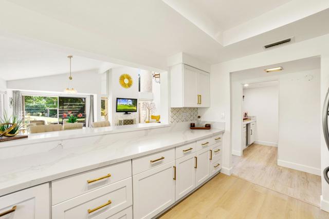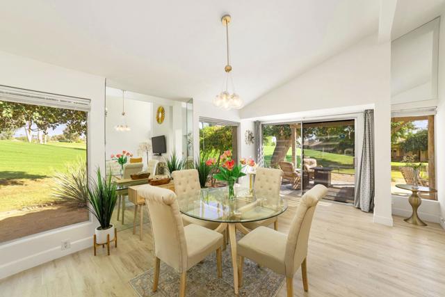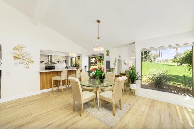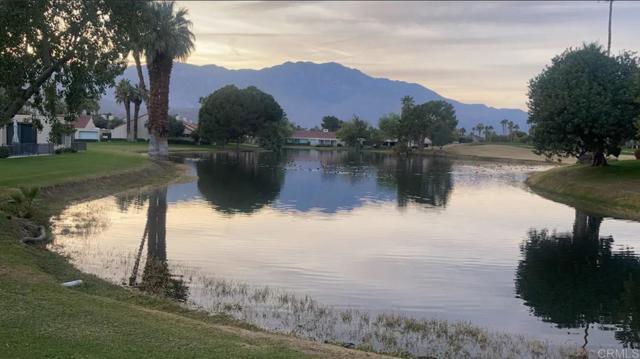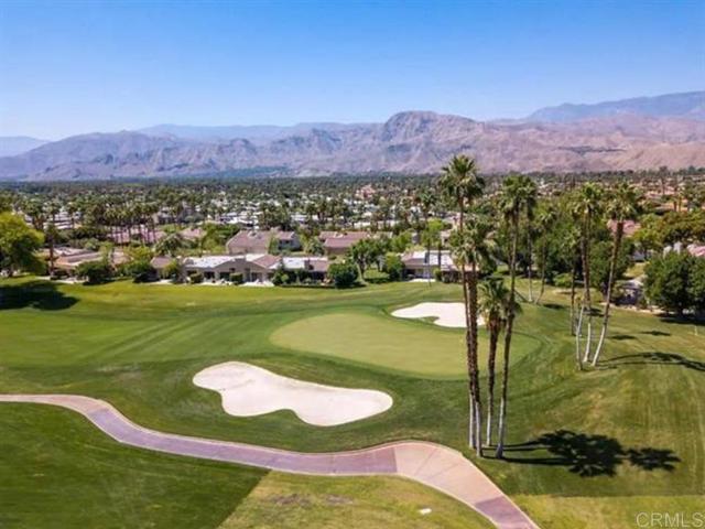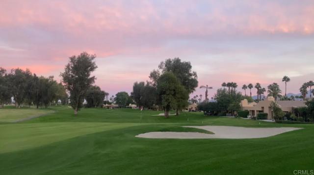 Experience Golf Lover's Paradise! Sunny Mission Hills Country Club Townhome 2 bd, 2 ba plus den/office space as 3rd bedroom, single level home with the best unobstructed views of the 16th Hole on the Dinah Shore PGA Tournament course. Enjoy serene sunsets and tranquil mornings watching golfers from your private covered patio. Spacious interior boasts vaulted ceilings, large kitchen, and modern finishes. Newly remodeled, quartz counters, LVP flooring, elegant chandelier & fixtures, & new AC Compressor. Private end unit with the best views of greens! Peaceful Guard Gated Community with pool and jacuzzi. Home has 2 covered carport spaces and storage closets. Cable/Internet included with HOA. The Country Club features three 18 hole golf courses, 43 racquet sports courts, croquet, state of the art fitness center and dining. Can be sold furnished. Land Lease extension to 2121 is available & conventional lending options. Conveniently located near Gelson's, Casino, The River, and Eisenhower Hospital. Palm Springs Airport is just 15 minutes away. Turnkey for your enjoyment!